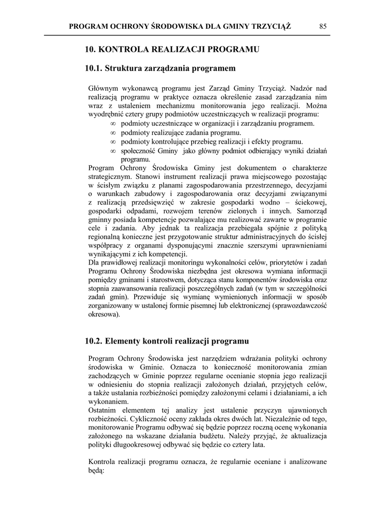 PROGRAM OCHRONY ŚRODOWISKA DLA GMINY TRZYCIĄś 85 10. KONTROLA REALIZACJI PROGRAMU 10.1. Struktura zarządzania programem Głównym wykonawcą programu jest Zarząd Gminy TrzyciąŜ. Nadzór nad realizacją programu w praktyce oznacza określenie zasad zarządzania nim wraz z ustaleniem mechanizmu monitorowania jego realizacji. MoŜna wyodrębnić cztery grupy podmiotów uczestniczących w realizacji programu: • podmioty uczestniczące w organizacji i zarządzaniu programem. • podmioty realizujące zadania programu. • podmioty kontrolujące przebieg realizacji i efekty programu. • społeczność Gminy jako główny podmiot odbierający wyniki działań programu. Program Ochrony Środowiska Gminy jest dokumentem o charakterze strategicznym. Stanowi instrument realizacji prawa miejscowego pozostając w ścisłym związku z planami zagospodarowania przestrzennego, decyzjami o warunkach zabudowy i zagospodarowania oraz decyzjami związanymi z realizacją przedsięwzięć w zakresie gospodarki wodno – ściekowej, gospodarki odpadami, rozwojem terenów zielonych i innych. Samorząd gminny posiada kompetencje pozwalające mu realizować zawarte w programie cele i zadania. Aby jednak ta realizacja przebiegała spójnie z polityką regionalną konieczne jest przygotowanie struktur administracyjnych do ścisłej współpracy z organami dysponującymi znacznie szerszymi uprawnieniami wynikającymi z ich kompetencji. Dla prawidłowej realizacji monitoringu wykonalności celów, priorytetów i zadań Programu Ochrony Środowiska niezbędna jest okresowa wymiana informacji pomiędzy gminami i starostwem, dotycząca stanu komponentów środowiska oraz stopnia zaawansowania realizacji poszczególnych zadań (w tym w szczególności zadań gmin). Przewiduje się wymianę wymienionych informacji w sposób zorganizowany w ustalonej formie pisemnej lub elektronicznej (sprawozdawczość okresowa). 10.2. Elementy kontroli realizacji programu Program Ochrony Środowiska jest narzędziem wdraŜania polityki ochrony środowiska w Gminie. Oznacza to konieczność monitorowania zmian zachodzących w Gminie poprzez regularne ocenianie stopnia jego realizacji w odniesieniu do stopnia realizacji załoŜonych działań, przyjętych celów, a takŜe ustalania rozbieŜności pomiędzy załoŜonymi celami i działaniami, a ich wykonaniem. Ostatnim elementem tej analizy jest ustalenie przyczyn ujawnionych rozbieŜności. Cykliczność oceny zakłada okres dwóch lat. NiezaleŜnie od tego, monitorowanie Programu odbywać się będzie poprzez roczną ocenę wykonania załoŜonego na wskazane działania budŜetu. NaleŜy przyjąć, Ŝe aktualizacja polityki długookresowej odbywać się będzie co cztery lata. Kontrola realizacji programu oznacza, Ŝe regularnie oceniane i analizowane będą: PROGRAM OCHRONY ŚRODOWISKA DLA GMINY TRZYCIĄś 86 • stopień wykonania działań • stopień realizacji przyjętych celów • rozbieŜność pomiędzy przyjętymi celami i działaniami, a ich wykonaniem • przyczyny tych rozbieŜności. Główne działania kontroli realizacji przedsięwzięć to: • ocena postępów we wdraŜaniu programu ochrony środowiska (co roku); • raport z wykonania programu (co dwa lata) • aktualizacja programu (co dwa lata) 10.3. Wskaźniki wdraŜania programu Dla prawidłowej oceny realizacji Programu naleŜy przyjąć uporządkowany system mierników jego efektywności. Mierniki te moŜna podzielić na trzy zasadnicze grupy: 1. mierniki ekonomiczne, 2. ekologiczne, 3. społeczne (świadomości społecznej). Mierniki ekonomiczne związane są z procesem finansowania inwestycji ochrony środowiska przy załoŜeniu, Ŝe punktem odniesienia są określone efekty ekologiczne. NaleŜą do nich łączny i jednostkowy koszt uzyskania efektu ekologicznego oraz koszty uzyskania efektu w okresie eksploatacji, a takŜe trwałość efektu w określonym czasie. W grupie mierników ekologicznych znajdą się mierniki określające stan środowiska, stopień zmian w nim zachodzących oraz mierniki określające skutki zdrowotne dla populacji. Do mierników ekologicznych moŜna zaliczyć: • jakość wód powierzchniowych i podziemnych, • długość sieci kanalizacyjnej, • ilość odpadów komunalnych na 1 mieszkańca na rok, • wielkość emisji zanieczyszczeń pyłowych, • wielkość emisji zanieczyszczeń gazowych, • wielkość lesistości powierzchni lasów na 1 mieszkańca, • powierzchnia terenów objętych ochroną prawną, • powierzchnia terenów zdegradowanych, • nakłady inwestycyjne na ochronę środowiska. Mierniki społeczne to: • udział społeczeństwa w działaniach związanych z ochroną środowiska, • stopień uspołecznienia procesów decyzyjnych (ilość i rodzaje interwencji społecznej), • ilość i zróŜnicowanie sposobów informacji i edukacji środowiskowej (akcje, kampanie, udział mediów lokalnych, zaangaŜowanie róŜnych grup społeczności), • ilość działań prawnych (procesów) odszkodowawczych związanych ze zniszczeniami środowiska. PROGRAM OCHRONY ŚRODOWISKA DLA GMINY TRZYCIĄś 87 Decyzja o przyjęciu liczby i rodzajach wskaźników jest decyzją ustalającą określony system oceny przyjętej polityki ochrony środowiska w Gminie. Oprócz ich doboru konieczne jest ustalenie sposobu ich agregacji, a następnie interpretacji. Przykładowe wskaźniki wdraŜania programu przedstawiono w tabeli poniŜej. Tab. 43. Proponowane wskaźniki wdraŜania programu ochrony środowiska Lp. Wskaźnik A. Wskaźniki stanu środowiska i zmiany presji na środowisko 1. 2. 3. 4. 5. 6. 7. 8. 9. 10. 11. 12. 13. 14. 15. Jakość wód powierzchniowych; udział wód pozaklasowych (wg oceny ogólnej) Jakość wód podziemnych; udział wód o bardzo dobrej i dobrej jakości (klasa Ia i Ib) Udział ścieków komunalnych nieoczyszczonych Udział ścieków przemysłowych nieoczyszczonych Długości sieci kanalizacyjnej do sieci wodociągowej Ilość wytwarzanych odpad