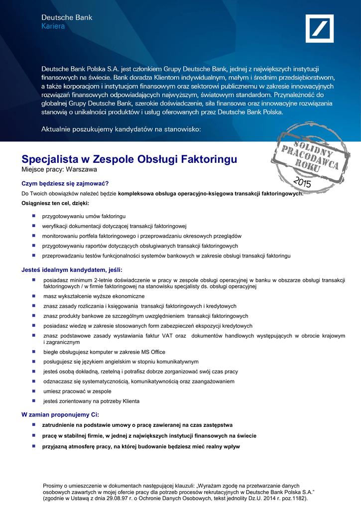 Specjalista w Zespole Obsługi Faktoringu Miejsce pracy: Warszawa Czym będziesz się zajmować? Do Twoich obowiązków należeć będzie kompleksowa obsługa operacyjno-księgowa transakcji faktoringowych. Osiągniesz ten cel, dzięki: przygotowywaniu umów faktoringu weryfikacji dokumentacji dotyczącej transakcji faktoringowej monitorowaniu portfela faktoringowego i przeprowadzaniu okresowych przeglądów przygotowywaniu raportów dotyczących obsługiwanych transakcji faktoringowych przeprowadzaniu testów funkcjonalności systemów bankowych w zakresie obsługi transakcji faktoringu Jesteś idealnym kandydatem, jeśli: posiadasz minimum 2-letnie doświadczenie w pracy w zespole obsługi operacyjnej w banku w obszarze obsługi transakcji faktoringowych / w firmie faktoringowej na stanowisku specjalisty ds. obsługi operacyjnej masz wykształcenie wyższe ekonomiczne biegłe obsługujesz komputer w zakresie MS Office znasz zasady rozliczania i księgowania transakcji faktoringowych i kredytowych znasz produkty bankowe ze szczególnym uwzględnieniem transakcji faktoringowych posiadasz wiedzę w zakresie stosowanych form zabezpieczeń ekspozycji kredytowych znasz podstawowe zasady wystawiania faktur VAT oraz dokumentów handlowych występujących w obrocie krajowym i zagranicznym posługujesz się językiem angielskim w stopniu komunikatywnym jesteś osobą dokładną, rzetelną i potrafisz dobrze zorganizować swój czas pracy odznaczasz się systematycznością, komunikatywnością oraz zaangażowaniem umiesz pracować w zespole jesteś zorientowany na potrzeby Klienta W zamian proponujemy Ci: zatrudnienie na podstawie umowy o pracę zawieranej na czas zastępstwa pracę w stabilnej firmie, w jednej z największych instytucji finansowych na świecie przyjazną atmosferę pracy, na której budowanie będziesz mieć realny wpływ Prosimy o umieszczenie w dokumentach następującej klauzuli: „Wyrażam zgodę na przetwarzanie danych osobowych zawartych w mojej ofercie pracy dla potrzeb procesów rekrutacyjnych w Deutsche Bank Polska S.A.” (zgodnie w Ustawą z dnia 29.08.97 r. o Ochronie Danych Osobowych, tekst jednolity Dz.U. 2014 r. poz.1182). atrakcyjny pakiet socjalny (m.in. prywatna opieka medyczna, karta sportowa, ubezpieczenie grupowe, programy zniżkowe) Wyślij do nas swoje CV i list motywacyjny za pomocą przycisku: Uprzejmie informujemy, że skontaktujemy się tylko z wybranymi Kandydatami a nadesłanych dokumentów nie zwracamy. Prosimy o umieszczenie w dokumentach następującej klauzuli: „Wyrażam zgodę na przetwarzanie danych osobowych zawartych w mojej ofercie pracy dla potrzeb procesów rekrutacyjnych w Deutsche Bank Polska S.A.” (zgodnie w Ustawą z dnia 29.08.97 r. o Ochronie Danych Osobowych, tekst jednolity Dz.U. 2014 r. poz.1182).