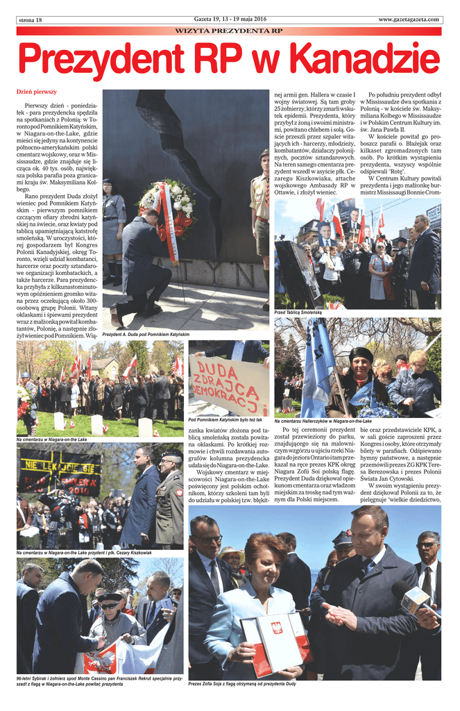 Gazeta 19, 13 - 19 maja 2016 strona 18 www.gazetagazeta.com WIZYTA PREZYDENTA RP Prezydent RP w Kanadzie Dzień pierwszy Pierwszy dzień - poniedziałek - para prezydencka spędziła na spotkaniach z Polonią: w Toronto pod Pomnikiem Katyńskim, w Niagara-on-the-Lake, gdzie mieści się jedyny na kontynencie północno-amerykańskim polski cmentarz wojskowy, oraz w Mississaudze, gdzie znajduje się licząca ok. 40 tys. osób, największa polska parafia poza granicami kraju św. Maksymiliana Kolbego. Rano prezydent Duda złożył wieniec pod Pomnikiem Katyńskim - pierwszym pomnikiem czczącym ofiary zbrodni katyńskiej na świecie, oraz kwiaty pod tablicą upamiętniającą katstrofę smoleńską. W uroczystości, której gospodarzem był Kongres Polonii Kanadyjskiej, okręg Toronto, wzięli udział kombatanci, harcerze oraz poczty sztandarowe organizacji kombatackich, a także harcerze. Para prezydencka przybyła z kilkunastominutowym opóźnieniem gromko witana przez oczekującą około 300osobową grupę Polonii. Witany oklaskami i śpiewami prezydent wraz z małżonką powitał kombatantów, Polonię, a następnie złożył wieniec pod Pomnikiem. Wią- nej armii gen. Hallera w czasie I wojny światowej. Są tam groby 25 żołnierzy, którzy zmarli wskutek epidemii. Prezydenta, który przybył z żoną i swoimi ministrami, powitano chlebem i solą. Goście przeszli przez szpaler witających ich - harcerzy, młodzieży, kombatantów, działaczy polonijnych, pocztów sztandarowych. Na teren samego cmentarza prezydent wszedł w asyście płk. Cezarego Kiszkowiaka, attache wojskowego Ambasady RP w Ottawie, i złożył wieniec. Po południu prezydent odbył w Mississaudze dwa spotkania z Polonią - w kościele św. Maksymiliana Kolbego w Mississaudze i w Polskim Centrum Kultury im. św. Jana Pawła II. W kościele powitał go proboszcz parafii o. Błażejak oraz kilkaset zgromadzonych tam osób. Po krótkim wystąpieniu prezydenta, wszyscy wspólnie odśpiewali "Rotę". W Centrum Kultury powitali prezydenta i jego małżonkę burmistrz Mississaugi Bonnie Crom- Przed Tablicą Smoleńską Prezydent A. Duda pod Pomnikiem Katyńskim Na cmentarzu w Niagara-on-the Lake Pod Pomnikiem Katyńskim było też tak Na cmentarzu Hallerczyków w Niagara-on-the-Lake zanka kwiatów złożona pod tablicą smoleńską została powitana oklaskami. Po krótkiej rozmowie i chwili rozdawania autografów kolumna prezydencka udała się do Niagara-on-the-Lake. Wojskowy cmentarz w miejscowości Niagara-on-the-Lake poświęcony jest polskim ochotnikom, którzy szkoleni tam byli do udziału w polskiej tzw. błękit- Po tej ceremonii prezydent został przewieziony do parku, znajdującego się na malowniczym wzgórzu u ujściu rzeki Niagara do jeziora Ontario i tam przekazał na ręce prezes KPK okręg Niagara Zofii Soi polską flagę. Prezydent Duda dziękował opiekunom cmentarza oraz władzom miejskim za troskę nad tym ważnym dla Polski miejscem. Na cmentarzu w Niagara-on-the Lake przydent i płk. Cezary Kiszkowiak 96-letni Sybirak i żołnierz spod Monte Cassino pan Franciszek Rekrut specjalnie przyszedł z flagą w Niagara-on-the-Lake powitać prezydenta Prezes Zofia Soja z flagą otrzymaną od prezydenta Dudy bie oraz przedstawiciele KPK, a w sali goście zaproszeni przez Kongres i osoby, które otrzymały bilety w parafiach. Odśpiewano hymny państwowe, a następnie przemówili prezes ZG KPK Teresa Berezowska i prezes Polonii Świata Jan Cytowski. W swoim wystąpieniu prezydent dziękował Polonii za to, że pielęgnuje "wielkie dziedzictwo,