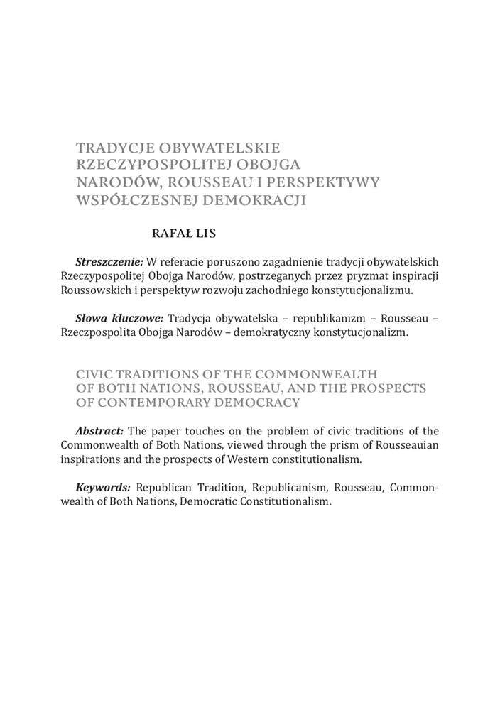 TRADYCJE OBYWATELSKIE RZECZYPOSPOLITEJ OBOJGA NARODÓW, ROUSSEAU I PERSPEKTYWY WSPÓŁCZESNEJ DEMOKRACJI RAFAŁ LIS Streszczenie: W referacie poruszono zagadnienie tradycji obywatelskich Rzeczypospolitej Obojga Narodów, postrzeganych przez pryzmat inspiracji Roussowskich i perspektyw rozwoju zachodniego konstytucjonalizmu. Słowa kluczowe: Tradycja obywatelska – republikanizm – Rousseau – Rzeczpospolita Obojga Narodów – demokratyczny konstytucjonalizm. CIVIC TRADITIONS OF THE COMMONWEALTH OF BOTH NATIONS, ROUSSEAU, AND THE PROSPECTS OF CONTEMPORARY DEMOCRACY Abstract: The paper touches on the problem of civic traditions of the Commonwealth of Both Nations, viewed through the prism of Rousseauian inspirations and the prospects of Western constitutionalism. Keywords: Republican Tradition, Republicanism, Rousseau, Commonwealth of Both Nations, Democratic Constitutionalism. 68 Rafał Lis Jeśli istotę republikańskiego obywatelstwa sprowadzić do prawa udziału w decyzjach publicznych, dającego gwarancje bezpieczeństwa osobistego – bycia „panem samego siebie”, prawa „pisania sobie praw”, to trudno o silniejszą, bardziej spektakularną tradycję obywatelską niż ta, która stała się udziałem Rzeczypospolitej Obojga Narodów. Stan szlachecki, obejmujący liczną szlachtę polską a z czasem także litewską, szlachtę „obojga narodów”, stawał się właściwie w Rzeczypospolitej suwerenem (Ogonowski, 1992: 8182; Opaliński, 1995: 38-43). Stając się zasadniczym dysponentem władzy prawodawczej, uzyskiwał on w szczególności prawa wypowiedzenia królowi posłuszeństwa – w wypadku naruszenia przezeń praw i wolności czy paktów konwentów. Nic dziwnego, że ustrój Rzeczypospolitej budził zainteresowanie zwolenników wolności obywatelskiej na przełomie XVI i XVII wieku. A jednak jeszcze w tym ostatnim stuleciu, a w szczególności w XVIII wieku, przestała być Polska (jak określano całe państwo polsko-litewskie), krytykowana z powodu przestarzałych stosunków społeczno-ekonomicznych, pozytywnym punktem odniesienia. Mimo to w tym właśnie czasie znalazła Polska bardzo ważnego obrońcę – Rousseau, autora Uwag o rządzie polskim, napisanych pod wpływem kontaktów z Wielhorskim, wysłannikiem konfederacji barskiej. Choć dzieło to nie należy do najczęściej komentowanych jego prac, to trudno przecenić jego znaczenie dla pełnego obrazu Roussowskiego konstytucjonalizmu (np. Baker, 1987: 479n). Przedstawia ono faktycznie warunki wprowadzenia ustroju republikańskiego w bardzo rozległym państwie – wbrew zasadniczym wnioskom ówczesnej teorii ustrojowej. Można było wszak twierdzić, że w dużym państwie nie dało się przeprowadzić zgromadzenia obywateli. Rousseau, głoszący, że woli powszechnej się po prostu nie reprezentuje (1966a: 112n), nie mógł jednak zaakceptować idei przedstawicielstwa. To w ustroju polskim, ocenionym nad wyraz pozytywnie (pomimo krytyki stosunków poddaństwa, które należało czym prędzej znosić), znalazł Rousseau szczęśliwe rozwiązanie najważniejszego dylematu. Wskazał mianowicie na rolę instrukcji poselskich. Układane na sejmiku (uznanym za najważniejszą, poza prawem konfederacji, gwarancję wolności), zapewniały, że nie dojdzie do sprzeniewierzenia woli narodu. Posłowie mieli postępować zgodnie z jej zaleceniami – reprezentując naród a nie siebie: ‘takie wędzidło jest bezwzględnie konieczne, aby utrzymać posłów w granicach obowiązków i zapobiec wszelkiej skądkolwiek wychodzącej korupcji’ (1966b: 220). Tradycja zapoczątkowana przez Rousseau nie wpłynęła jednak w większej mierze na późniejszą myśl reformatorską Sejmu Czteroletniego. Poszła ona w innym kierunku, nadanym jej zwłaszcza przez Kołłątaja, zorientowanym, pomimo silnych śladów nowoczesnego republikanizmu, na konieczny sojusz ПЯТЫ МІЖНАРОДНЫ КАНГРЭС ДАСЛЕДЧЫКАЎ БЕЛАРУСІ Працоўныя матэрыялы. Том 5 (2016) Tradycje obywatelskie Rzeczypospolitej Obojga Narodów... ustrojowy z królem. To zresztą stanowisko tego ostatniego miało najbardziej wpłynąć na treść Konstytucji 3 maja 1791 roku (Rostworowski, 1963: 265464). Wprowadzając dziedzictwo tronu, odrzucając instytucje instrukcji wiążących i konfederacji, zaprzeczyła najważniejszemu przesłaniu Uwag o rządzie polskim. W tych ostatnich kwestiach Konstytucja oddawała najważniejsze tendencje rozwojowe nowoczesnego konstytucjonalizmu zachodniego. Znamienne, że postulaty bezpośrednich rządów obywatelskich nie znalazły uznania głównych konstytucjonalistów francuskich. Poszli oni zdecydowanie za myślą Sieyèsa, wiążącego koncept woli powszechnej właśnie z przedstawicielstwem (2003: 11-12). Podobne tendencje przeważyły równie wyraźnie w Ameryce, pod znaczącym wpływem Madisona i Hamiltona. Konstytucja z 1787 roku wprowadzała na szczeblu unii pełny system władzy publicznej, budowanej na zasadzie suwerenności narodu. Co jednak istotne, rozwiązania amerykańskie uwzględniać miały proponowane przez federalistów ograniczenia zbyt daleko posuniętego gminowładztwa, grożącego niepotrzebnym poruszeniem frakcyjnym (jak wynika zwłaszcza z Federalisty nr 10). W szczególności wprowadzane większe okręgi wyborcze miały neutralizować przewidywane na nadmiernie lokalnym poziomie poruszenia frakcyjne, przenosząc ciężar podejmowania najważniejszych decyzji publicznych na bardziej wyselekcjonowanych przedstawicieli. Dawne ideały rządów bezpośrednich w postaci powszechnego zgromadzenia obywateli przetrwały wprawdzie w kantonach i gminach szwajcarskich, a także w miastach Nowej Anglii. W przypadku Szwajcarii oddawało je także zwłaszcza prawo do odrzucenia ustaw za pomocą referendum (w istocie weta ludowego), wprowadzone także na szczeblu federalnym (w 1874 roku). Pewnych śladów tych ideałów można się jeszcze doszukać w postulatach amerykań