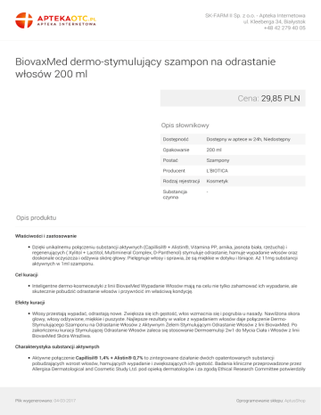 SK-FARM II Sp. z o.o. - Apteka Internetowa ul. Kleeberga 34, Białystok +48 42 279 40 05 BiovaxMed dermo-stymulujący szampon na odrastanie włosów 200 ml Cena: 29,85 PLN Opis słownikowy Dostępność Dostępny w aptece w 24h, Niedostępny Opakowanie 200 ml Postać Szampony Producent L'BIOTICA Rodzaj rejestracji Kosmetyk Substancja czynna - Opis produktu Właściwości i zastosowanie Dzięki unikalnemu połączeniu substancji aktywnych (Capillisil® + Alistin®, Vitamina PP, arnika, jasnota biała, rzeżucha) i regenerujących ( Xylitol + Lactitol, Multimineral Complex, D-Panthenol) stymuluje odrastanie, hamuje wypadanie włosów oraz doskonale oczyszcza i odżywia skórę głowy. Pielęgnuje włosy i sprawia, że są miękkie w dotyku i lśniące. Aż 11mg substancji aktywnych w 1ml szamponu. Cel kuracji Inteligentne dermo-kosmeceutyki z linii BiovaxMed Wypadanie Włosów mają na celu nie tylko zahamować ich wypadanie, ale skutecznie pobudzić odrastanie włosów i przywrócić im właściwą kondycję. Efekty kuracji Włosy przestają wypadać, odrastają nowe. Zwiększa się ich gęstość, włos wzmacnia się i pogrubia u nasady. Nawilżona skora głowy, włosy odżywione, miękkie i puszyste. Najlepsze rezultaty w walce z wypadaniem włosów daje połączenie DermoStymulującego Szamponu na Odrastanie Włosów z Aktywnym Żelem Stymulującym Odrastanie Włosów z lini BiovaxMed. Po zakończeniu kuracji Stymulującej Odrastanie Włosów zaleca się stosowanie Dermoemulsji 2w1 do Mycia Ciała i Włosów z linii BiovaxMed Skóra Wrażliwa. Charakterystyka substancji aktywnych Aktywne połączenie Capillisil® 1,4% + Alistin® 0,7% to zintegrowane działanie dwóch opatentowanych substancji pobudzających wzrost włosów, hamujących wypadanie i zwiększających ich gęstość. Badania kliniczne przeprowadzone przez Allergisa Dermatological and Cosmetic Study Ltd. pod opieką dermatologów i za zgodą Ethical Research Committee potwierdziły Plik wygenerowano: 04-03-2017 Oprogramowanie sklepu: AptusShop SK-FARM II Sp. z o.o. - Apteka Internetowa ul. Kleeberga 34, Białystok +48 42 279 40 05 wysoką skuteczność składników: Zawarty w Capillisil® krzem stanowi niezbędny budulec skory i włosów. Antyutleniające działanie Alistin® hamuje sztywnienie włókien kolagenowych przyczyniające się do nadmiernego wypadania włosów. Aktywne połączenie dwóch składników odbudowuje strukturę włosów, wzmacnia je i odżywia. Vitamina PP (niacyna) efektywnie hamuje wypadanie włosów oraz poprawia kondycję skory. Jest niezbędna do wytwarzania energii w komórce (buduje koenzym NAD i NADP). Poprawia krążenie krwi w skórze głowy ułatwiając transport substancji odżywczych i tlenu. Stymuluje syntezę kolagenu. Połączenie Arniki i Jasnoty Białej działa hipotensyjnie na skórę głowy, oczyszcza mieszki włosów i usuwa nagromadzony nadmiar sebum. Oczyszczony i ożywiony włos szybko i łatwo przyswaja niezbędne mikro i makroelementy dostarczone przez Rzeżuchę, mającą działanie odżywcze. HairSpa®: Xylitol + Lactitol zapewniają równowagę mikroflory skóry. Skutecznie walczą z nadmierną suchością, swędzeniem, łupieżem, podrażnieniami zapewniając natychmiastowe i długotrwałe nawodnienie. Regulują proces łuszczenia się naskórka, wzmacniają barierę skórną. Multimineral Complex dostarcza skórze niezbędne do jej prawidłowego funkcjonowania pierwiastki: glin, cynk, magnez, miedź, mangan, potas, sod oraz aminokwas endogenny - lizynę. Zwiększa witalność tkanek skórnych, przyspiesza procesy metaboliczne. Chroni przed nadmierną utratą wody sprawiając, że skora staje się bardziej elastyczna i miękka. D-Panthenol (prowitamina B5) nawilża skórę i włosy, przyspiesza gojenie podrażnień, działa łagodząco i przeciwzapalnie. Poprawia pigmentację włosa, zapobiega rozdwajaniu się końcówek. Alantoina ma właściwości regenerujące, kojące i łagodzące. Zmiękcza i wygładza skórę, eliminuje popękany i zgrubiały naskórek towarzyszący wrażliwej skórze. Biovax to gwarancja BEZPIECZEŃSTWA. Nie zawiera substancji drażniących: bez PARABENÓW, bez SLS (Sodium Lauryl Sulfate), bez SLES (Sodium Laureth Sulfate), bez OLEJÓW MINERALNYCH. Informacje dodatkowe W razie pytań lub wątpliwości służymy Państwu pomocą pod adresem [email protected]. Plik wygenerowano: 04-03-2017 Powered by TCPDF (www.tcpdf.org) Oprogramowanie sklepu: AptusShop