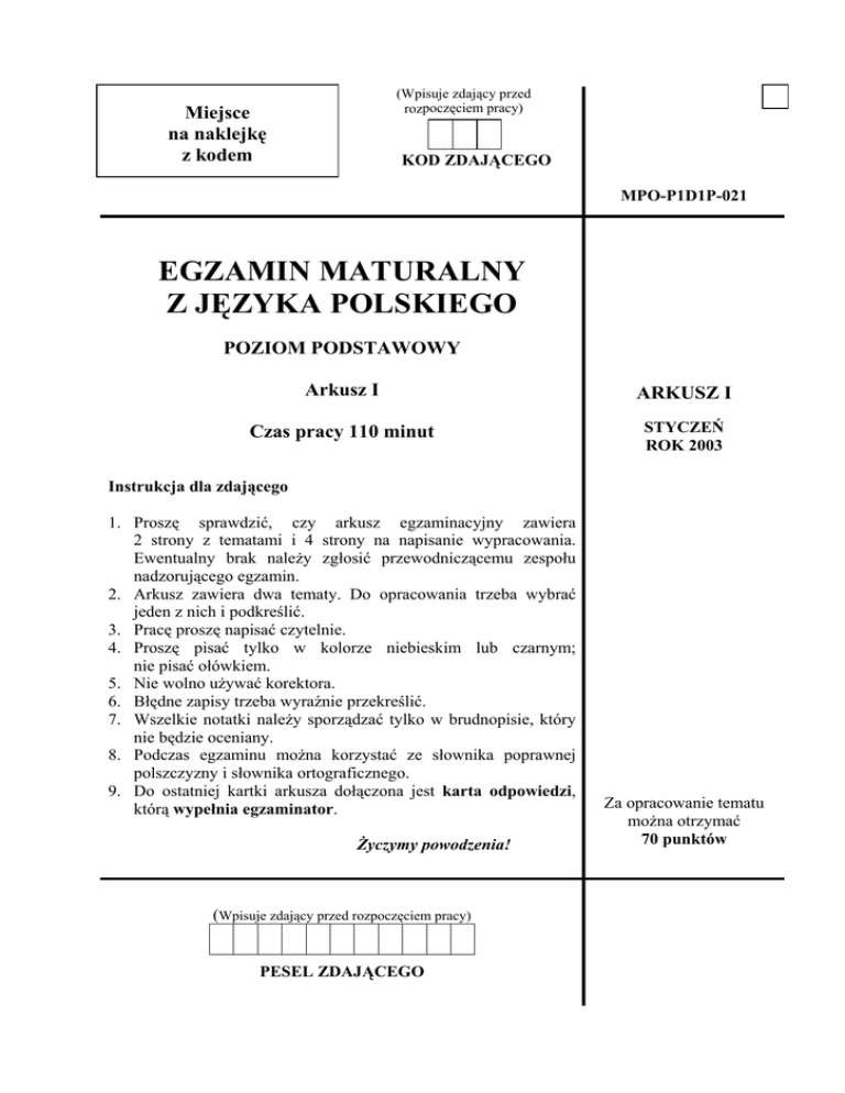 (Wpisuje zdający przed rozpoczęciem pracy) Miejsce na naklejkę z kodem KOD ZDAJĄCEGO MPO-P1D1P-021 EGZAMIN MATURALNY Z JĘZYKA POLSKIEGO POZIOM PODSTAWOWY Arkusz I ARKUSZ I Czas pracy 110 minut STYCZEŃ ROK 2003 Instrukcja dla zdającego 1. Proszę sprawdzić, czy arkusz egzaminacyjny zawiera 2 strony z tematami i 4 strony na napisanie wypracowania. Ewentualny brak należy zgłosić przewodniczącemu zespołu nadzorującego egzamin. 2. Arkusz zawiera dwa tematy. Do opracowania trzeba wybrać jeden z nich i podkreślić. 3. Pracę proszę napisać czytelnie. 4. Proszę pisać tylko w kolorze niebieskim lub czarnym; nie pisać ołówkiem. 5. Nie wolno używać korektora. 6. Błędne zapisy trzeba wyraźnie przekreślić. 7. Wszelkie notatki należy sporządzać tylko w brudnopisie, który nie będzie oceniany. 8. Podczas egzaminu można korzystać ze słownika poprawnej polszczyzny i słownika ortograficznego. 9. Do ostatniej kartki arkusza dołączona jest karta odpowiedzi, którą wypełnia egzaminator. Życzymy powodzenia! (Wpisuje zdający przed rozpoczęciem pracy) PESEL ZDAJĄCEGO Za opracowanie tematu można otrzymać 70 punktów Egzamin maturalny z języka polskiego Arkusz I 2 Temat 1. Jak żyć ma człowiek? Kto, komu, jakich i jak udziela rad w Pieśni XI i w innych pieśniach Jana Kochanowskiego? Wykorzystaj w wypracowaniu stosowne konteksty filozoficzne i historycznoliterackie. Jan Kochanowski Pieśń XI (z ksiąg wtórych) Stateczny umysł pamiętaj zachować, Jeśli cię pocznie nieszczęście frasować; Także i góry nie radzę-ć wylatać, Kiedy się szczęście z tobą imie bratać. Śmierci podległy, człowiecze cnotliwy, Choć wszytek twój wiek będzie frasowliwy, Chocia też czasem, siedząc z przyjacioły, Przy dobrym trunku strawisz dzień wesoły: Tu przy ciekącym przezornym strumieniu Każ stół gotować w jaworowym cieniu, Każ wino nosić, póki beczka leje, Póki wiek służy, a śmierć nie przyspieje! Postąpisz z włości drogo zapłaconych, Postąpisz z dworu i gmachów złoconych; A co zebrania twego kolwiek będzie, To wszytko przyszły namiastek osiędzie. Bądź się kto zacnym rodził i bogatym, Bądź niewolnikiem: u śmierci nic na tym; Czyjkolwiek naprzód los wynidzie, wsiadaj, Wieczny wygnańcze, ani więc odkładaj! (1584) (za: J. Kochanowski, Pieśni, Wrocław 1970) _____________________________________________________ w. 3 góry [...] wylatać – wynosić się, pysznić w. 9 przezorny – przezroczysty, przejrzysty w. 12 przyspiać – śpiesznie przybyć w. 13 postąpić – ustąpić w. 15 zebranie – zbiór, majątek w. 16 namiastek – następca; osiąść – wejść w posiadanie w. 19 wsiadaj – do łodzi Charona Egzamin maturalny z języka polskiego Arkusz I 3 Temat 2. Gustawa Herlinga–Grudzińskiego Inny świat. Wyjaśnij tytuł na podstawie podanego fragmentu. Czy opisany mechanizm systemu działał w pełni skutecznie? Odpowiedź uzasadnij argumentami z całego utworu. Gustaw Herling-Grudziński: Ręka w ogniu (fragmenty) Wbrew temu, co się przypuszcza, cały system pracy przymusowej w Rosji – łącznie ze śledztwem, pobytem w więzieniu i życiem w obozie – nastawiony jest, bardziej niż na ukaranie przestępcy, na jego wyeksploatowanie gospodarcze i całkowite przeobrażenie. Tortury na śledztwie nie są stosowane jako zasada, ale jako środek pomocniczy. O co chodzi naprawdę, to nie tyle o wymuszenie na oskarżonym podpisu pod zmyślonym i fikcyjnym aktem oskarżenia, ile o kompletną dezintegrację jego osobowości. Człowiek budzony co nocy – na przestrzeni długich miesięcy, a czasem nawet i lat – pozbawiony w czasie śledztwa prawa załatwiania najelementarniejszych potrzeb fizjologicznych, trzymany godzinami na twardym krześle, oślepiony skierowaną prosto w oczy żarówką, kłuty podstępnymi pytaniami i niesamowitym crescendo urojonych zarzutów, drażniony sadystycznie widokiem papierosów i gorącej kawy na stole – gotów jest podpisać wszystko. Nie o to jednak chodzi. Więźnia można uważać za „spreparowanego” do ostatecznego zabiegu dopiero wtedy, gdy widać już wyraźnie, jak jego osobowość rozpada się na drobne części składowe: pomiędzy skojarzeniami powstają luki, myśli i uczucia obluzowują się w swych pierwotnych łożyskach i klekocą jak w zepsutej maszynie, pasy transmisyjne łączące teraźniejszość z przeszłością obsuwają się z kół napędowych i opadają na dno świadomości, wszystkie dźwignie i przekładnie intelektu i woli zacinają się, strzałki w zegarach pomiarowych skaczą jak oszalałe od zera do maksimum i z powrotem. Maszyna kręci się dalej na zwiększonych obrotach, ale nie pracuje już tak jak dawniej – wszystko, co wydawało się oskarżonemu przed chwilą absurdem, staje się rzeczą prawdopodobną, choć ciągle jeszcze nieprawdziwą, uczucia zmieniają barwę, napięcie woli znika. [...] Za chwilę mechanizm ludzki, zatrzymany w punkcie zerowym i rozłożony na najdrobniejsze części, zostanie złożony na powrót, ale już inaczej; luki pomiędzy skojarzeniami wypełniają inne wiązania, myśli i uczucia dopasowane zostaną do innych łożysk, pasy transmisyjne zaczną przekazywać nie przeszłość teraźniejszości, ale teraźniejszość przeszłości, instynkt i wola zmienią kierunek działania, wskazówki w zegarach pomiarowych zatrzymają się na zawsze w maksimum. Oskarżony ocknie się z odrętwienia, zwróci zmęczoną, lecz uśmiechniętą twarz ku swemu dobroczyńcy i westchnąwszy głęboko, powie, że teraz wszystko rozumie, że błądził dotąd przez całe życie. Zabieg się udał, pacjent został nowo narodzony. [...] Po raz ostatni w życiu zaśnie z tym uczuciem męczącej niepewności, nazajutrz bowiem koło południa obudzi się pusty jak wydrążony orzech i osłabiony po nieludzkim wysiłku całego organizmu, ale olśniony myślą, że ma już nareszcie wszystko za sobą. I kiedy zacznie chodzić między 