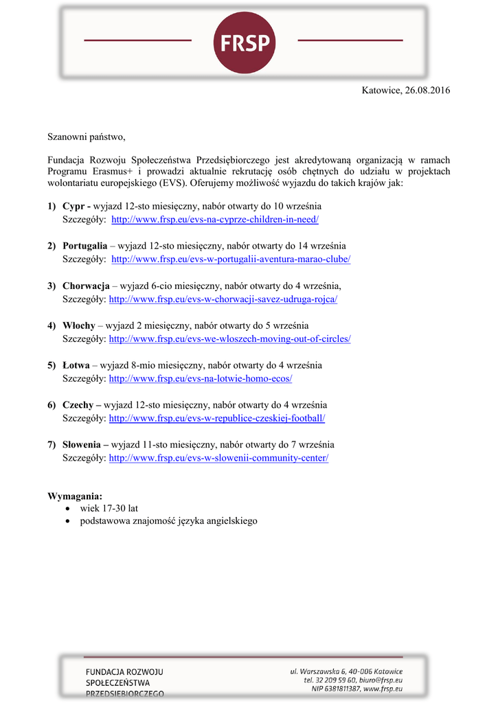 Katowice, 26.08.2016 Szanowni państwo, Fundacja Rozwoju Społeczeństwa Przedsiębiorczego jest akredytowaną organizacją w ramach Programu Erasmus+ i prowadzi aktualnie rekrutację osób chętnych do udziału w projektach wolontariatu europejskiego (EVS). Oferujemy możliwość wyjazdu do takich krajów jak: 1) Cypr - wyjazd 12-sto miesięczny, nabór otwarty do 10 września Szczegóły: http://www.frsp.eu/evs-na-cyprze-children-in-need/ 2) Portugalia – wyjazd 12-sto miesięczny, nabór otwarty do 14 września Szczegóły: http://www.frsp.eu/evs-w-portugalii-aventura-marao-clube/ 3) Chorwacja – wyjazd 6-cio miesięczny, nabór otwarty do 4 września, Szczegóły: http://www.frsp.eu/evs-w-chorwacji-savez-udruga-rojca/ 4) Włochy – wyjazd 2 miesięczny, nabór otwarty do 5 września Szczegóły: http://www.frsp.eu/evs-we-wloszech-moving-out-of-circles/ 5) Łotwa – wyjazd 8-mio miesięczny, nabór otwarty do 4 września Szczegóły: http://www.frsp.eu/evs-na-lotwie-homo-ecos/ 6) Czechy – wyjazd 12-sto miesięczny, nabór otwarty do 4 września Szczegóły: http://www.frsp.eu/evs-w-republice-czeskiej-football/ 7) Słowenia – wyjazd 11-sto miesięczny, nabór otwarty do 7 września Szczegóły: http://www.frsp.eu/evs-w-slowenii-community-center/ Wymagania: wiek 17-30 lat podstawowa znajomość języka angielskiego Uczestnikowi projektu zapewniamy: pełen zakres ubezpieczenia umowę z uczestnikiem projektu pokrycie kosztów transportu w obie strony szkolenie przedwyjazdowe wsparcie podczas trwania projektu naszych wolontariuszy przebywających na miejscu zakwaterowanie i pełne wyżywienie lekcje języka kraju do którego się udaje pokrycie kosztów transportu lokalnego na miejscu możliwość zdobycia cennego doświadczenia i referencje po zakończeniu projektu kieszonkowe na bieżące wydatki. Szczegóły na temat tego jak aplikować znajdują się w każdym poszczególnym ogłoszeniu. Więcej informacji uzyskać można kontaktując się z naszą koordynatorką: Natalią Podbielską, mailowo [email protected] lub telefonicznie: 0048 600993809