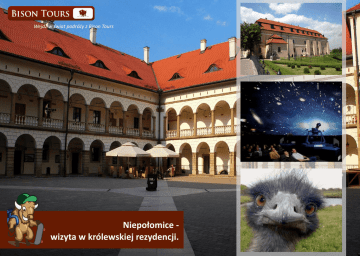 Wejdź w świat podróży z Bison Tours Niepołomice wizyta w królewskiej rezydencji. Program ramowy Dzień 1. Niepołomice Zbiórka uczestników w miejscu wyznaczonym przez organizatora, następnie wyjazd w kierunku Niepołomic. Zwiedzanie oraz warsztaty na Zamku w Niepołomicach, skrzyni pełnej skarbów historii architektury. Podczas wizyty dzieci wezmą udział w warsztatach pt. „Mały słownik architektury” w trakcie których nauczą się rozpoznawać style architektoniczne „Świat Puszczy i łowów” - Niezwykła podróż po Puszczy Niepołomickiej pozwala poznać jej historię, faunę i florę, wprowadza również w zagadnienia z dziedziny ochrony przyrody – zajęcia odbywają się na Zamku; Przejście do niepołomickiego XVI – wiecznego kościoła pw. Dziesięciu Tysięcy Męczenników. Podczas zwiedzania uczestnikom towarzyszyć będzie pani przewodnik, która przybliży dzieciom historię kościoła Niepołomic; Zajęcia w Planetarium. Tutaj uczestnicy będą mogli zaobserwować wiele zjawisk zachodzących w ciągu całego roku na niebie oraz poznać najważniejsze gwiazdozbiory, planety i gwiazdy. Zajęcia odbywać się będą w specjalnie do tego celu przygotowanej Sali obserwatorium, gdzie przeniosą się w nieznany dla uczestników świat. Pomoże im w tym jeden z zapalonych pasjonatów astronomii; Przejazd do fermy strusi. Uczestnicy wycieczki staną oko w oko z tym największym ptakiem jakiego można spotkać w Polsce, dowiedzą się wiele ciekawostek m.in.: co jedzą strusie, ile waży strusie jajo oraz jak szybko biegają; Powrót do domu w godzinach popołudniowych. Świadczenia Cena obejmuje: Przejazd autokarem; Opiekę pilota w trakcie trwania wycieczki; Ubezpieczenie NNW do 5 000 zł; Zwiedzanie Kościoła pw. Dziesięciu Tysięcy Męczenników w Niepołomicach; Bilety wstępu do Planetarium oraz zajęcia edukacyjne; Warsztaty na Zamku w Niepołomicach pt. „Mały Słownik Architektury; Wizyta w fermie strusi; Cena: zależna od liczby uczestników, standardu zakwaterowania oraz wybranych atrakcji. Cena nie obejmuje: Innych świadczeń nie przewidzianych w programie. Zapraszamy do kontaktu z naszymi konsultantami, z przyjemnością przygotujemy wycieczkę dostosowaną do Państwa wymagań. Piotr Heliasz +48 511 77 55 13 [email protected] Maciej Inglot +48 692 803 305 [email protected] 32-005 Niepołomice, ul. Stefana Batorego 39a, tel. 511775513, 692803305 Email: [email protected], www.bisontours.pl Ważne informacje Cena wycieczki Ceny wyjazdów, które dla Państwa przygotowujemy są zależne od wielu czynników: terminu i długości pobytu, standardu ośrodka, ilości wyżywienia oraz rodzaju wybranych atrakcji. Chcąc w 100 % zaspokoić Państwa oczekiwania, do każdego zapytania podchodzimy indywidualnie. Program Programy wyjazdów, które znajduja się w naszej ofercie są starannie przygotowane. Konstruujemy je zawsze w porozumieniu z Państwem, by zapewnić satysfakcję i wspaniale wspomnienia. Zawsze mamy plan awaryjny – pogoda nie pokrzyżuje nam planów. Warunki rezerwacji Potwierdzeniem przyjęcia zamówienia jest umowa, zawarta między Biurem Podróży Bison Tours a Zleceniodawcą, która określa wszelkie szczegóły wyjazdu oraz regulamin. Zaliczkę w wysokości 30% należy wpłacić w dniu podpisania umowy, a pozostałą kwotę nie później niż 30 dni przed wyjazdem w przypadku wyjazdów wielodniowych, i nie później niż 20 dni w przypadku wyjazdów jednodniowych. Ubezpieczenie Biuro zapewnia uczestnikom ubezpieczenie NNW w kraju i za granicą, oraz kosztów leczenia KL i bagażu za granicą zgodnie z obowiązującymi przepisami. Warunki zakwaterowania Obiekty noclegowe, które proponujemy naszym grupom podczas wyjazdów, gwarantują wypoczynek w komfortowych pokojach z pełnym węzłem sanitarnym. Współpracujemy tylko z sprawdzonymi kontrahentami, jednocześnie poszukując nowych, atrakcyjnych miejsc w najlepszych lokalizacjach. Transport Podróżujemy bezpiecznymi autokarami, posiadającymi klimatyzację, regulowane siedzenia, odtwarzacz DVD, a w przypadku dłuższych tras autokar posiada toaletę. Każdy pojazd regularnie poddawany jest badaniom technicznym. Nasi kierowcy są doświadczeni, profesjonalni, zawsze uśmiechnięci i chętni do pomocy. Piloci Nasi piloci to osoby, które ukończyły kursy pilotażu i posiadają kilkuletnie doświadczenie w prowadzeniu wycieczek. Z radością dzielą się posiadaną wiedzą i dbają o to, by wyjazd na długo pozostał miłym wspomnieniem. Animatorzy Nasi animatorzy to osoby, które ukończyły kursy animacyjne i posiadają kilkuletnie doświadczenie w profesjonalnej pracy z grupami zarówno dorosłych, jak i dzieci. Zarażają uśmiechem i optymizmem, nie pozwalając nawet na chwilę nudy. Dodatkowe atrakcje W autokarze proponujemy zabawy, mini-gry i quizy wiedzy z nagrodami. Zabieramy również własny sprzęt rekreacyjny. W przypadku wyjazdów zagranicznych każdy uczestnik otrzymuje książeczkę z programem oraz informacjami krajoznawczymi. 32-005 Niepołomice, ul. Stefana Batorego 39a, tel. 511775513, 692803305 Email: [email protected], www.bisontours.pl