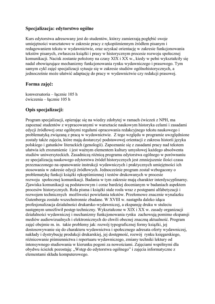 Specjalizacja: edytorstwo ogólne Forma zajęć: Opis specjalizacji: