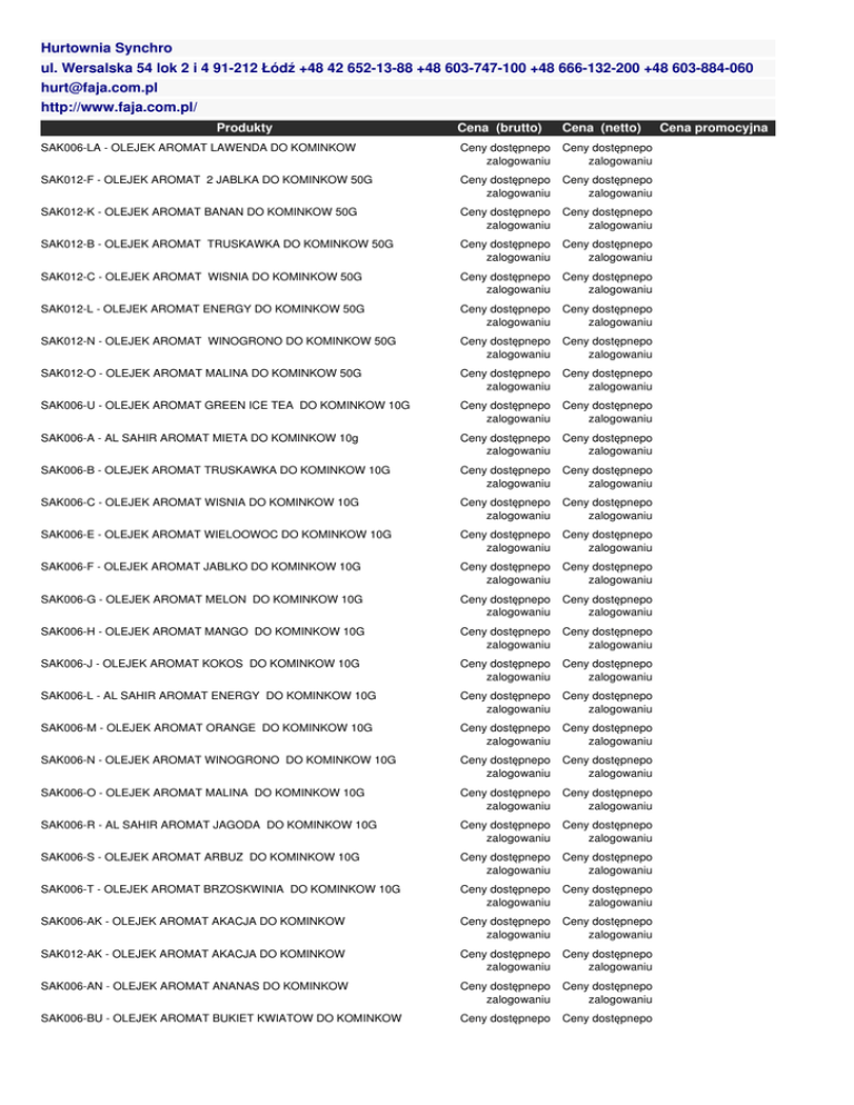 Hurtownia Synchro ul. Wersalska 54 lok 2 i 4 91-212 Łódź +48 42 652-13-88 +48 603-747-100 +48 666-132-200 +48 603-884-060 [email protected] http://www.faja.com.pl/ Cena (brutto) Cena (netto) SAK006-LA - OLEJEK AROMAT LAWENDA DO KOMINKOW Produkty Ceny dostępnepo zalogowaniu Ceny dostępnepo zalogowaniu SAK012-F - OLEJEK AROMAT 2 JABLKA DO KOMINKOW 50G Ceny dostępnepo zalogowaniu Ceny dostępnepo zalogowaniu SAK012-K - OLEJEK AROMAT BANAN DO KOMINKOW 50G Ceny dostępnepo zalogowaniu Ceny dostępnepo zalogowaniu SAK012-B - OLEJEK AROMAT TRUSKAWKA DO KOMINKOW 50G Ceny dostępnepo zalogowaniu Ceny dostępnepo zalogowaniu SAK012-C - OLEJEK AROMAT WISNIA DO KOMINKOW 50G Ceny dostępnepo zalogowaniu Ceny dostępnepo zalogowaniu SAK012-L - OLEJEK AROMAT ENERGY DO KOMINKOW 50G Ceny dostępnepo zalogowaniu Ceny dostępnepo zalogowaniu SAK012-N - OLEJEK AROMAT WINOGRONO DO KOMINKOW 50G Ceny dostępnepo zalogowaniu Ceny dostępnepo zalogowaniu SAK012-O - OLEJEK AROMAT MALINA DO KOMINKOW 50G Ceny dostępnepo zalogowaniu Ceny dostępnepo zalogowaniu SAK006-U - OLEJEK AROMAT GREEN ICE TEA DO KOMINKOW 10G Ceny dostępnepo zalogowaniu Ceny dostępnepo zalogowaniu SAK006-A - AL SAHIR AROMAT MIETA DO KOMINKOW 10g Ceny dostępnepo zalogowaniu Ceny dostępnepo zalogowaniu SAK006-B - OLEJEK AROMAT TRUSKAWKA DO KOMINKOW 10G Ceny dostępnepo zalogowaniu Ceny dostępnepo zalogowaniu SAK006-C - OLEJEK AROMAT WISNIA DO KOMINKOW 10G Ceny dostępnepo zalogowaniu Ceny dostępnepo zalogowaniu SAK006-E - OLEJEK AROMAT WIELOOWOC DO KOMINKOW 10G Ceny dostępnepo zalogowaniu Ceny dostępnepo zalogowaniu SAK006-F - OLEJEK AROMAT JABLKO DO KOMINKOW 10G Ceny dostępnepo zalogowaniu Ceny dostępnepo zalogowaniu SAK006-G - OLEJEK AROMAT MELON DO KOMINKOW 10G Ceny dostępnepo zalogowaniu Ceny dostępnepo zalogowaniu SAK006-H - OLEJEK AROMAT MANGO DO KOMINKOW 10G Ceny dostępnepo zalogowaniu Ceny dostępnepo zalogowaniu SAK006-J - OLEJEK AROMAT KOKOS DO KOMINKOW 10G Ceny dostępnepo zalogowaniu Ceny dostępnepo zalogowaniu SAK006-L - AL SAHIR AROMAT ENERGY DO KOMINKOW 10G Ceny dostępnepo zalogowaniu Ceny dostępnepo zalogowaniu SAK006-M - OLEJEK AROMAT ORANGE DO KOMINKOW 10G Ceny dostępnepo zalogowaniu Ceny dostępnepo zalogowaniu SAK006-N - OLEJEK AROMAT WINOGRONO DO KOMINKOW 10G Ceny dostępnepo zalogowaniu Ceny dostępnepo zalogowaniu SAK006-O - OLEJEK AROMAT MALINA DO KOMINKOW 10G Ceny dostępnepo zalogowaniu Ceny dostępnepo zalogowaniu SAK006-R - AL SAHIR AROMAT JAGODA DO KOMINKOW 10G Ceny dostępnepo zalogowaniu Ceny dostępnepo zalogowaniu SAK006-S - OLEJEK AROMAT ARBUZ DO KOMINKOW 10G Ceny dostępnepo zalogowaniu Ceny dostępnepo zalogowaniu SAK006-T - OLEJEK AROMAT BRZOSKWINIA DO KOMINKOW 10G Ceny dostępnepo zalogowaniu Ceny dostępnepo zalogowaniu SAK006-AK - OLEJEK AROMAT AKACJA DO KOMINKOW Ceny dostępnepo zalogowaniu Ceny dostępnepo zalogowaniu SAK012-AK - OLEJEK AROMAT AKACJA DO KOMINKOW Ceny dostępnepo zalogowaniu Ceny dostępnepo zalogowaniu SAK006-AN - OLEJEK AROMAT ANANAS DO KOMINKOW Ceny dostępnepo zalogowaniu Ceny dostępnepo zalogowaniu SAK006-BU - OLEJEK AROMAT BUKIET KWIATOW DO KOMINKOW Ceny dostępnepo Ceny dostępnepo Cena promocyjna zalogowaniu zalogowaniu SAK006-CO - OLEJEK AROMAT COLA DO KOMINKOW Ceny dostępnepo zalogowaniu Ceny dostępnepo zalogowaniu SAK006-D - OLEJEK AROMAT JASMIN DO KOMINKOW Ceny dostępnepo zalogowaniu Ceny dostępnepo zalogowaniu SAK006-F2 - OLEJEK AROMAT DRZEWO SANDALOWE DO KOMINKOW Ceny dostępnepo zalogowaniu Ceny dostępnepo zalogowaniu SAK006-FL - OLEJEK AROMAT FLORELLA DO KOMINKOW Ceny dostępnepo zalogowaniu Ceny dostępnepo zalogowaniu SAK006-KA - OLEJEK AROMAT KAWA DO KOMINKOW Ceny dostępnepo zalogowaniu Ceny dostępnepo zalogowaniu SAK006-LI - OLEJEK AROMAT LILAK DO KOMINKOW Ceny dostępnepo zalogowaniu Ceny dostępnepo zalogowaniu SAK006-TC - OLEJEK AROMAT TRAWA CYTRYNOWA DO KOMINKOW Ceny dostępnepo zalogowaniu Ceny dostępnepo zalogowaniu SAK006-WA - OLEJEK AROMAT WANILIA DO KOMINKOW Ceny dostępnepo zalogowaniu Ceny dostępnepo zalogowaniu SAK006-Z - OLEJEK AROMAT GRAPEFRUIT DO KOMINKOW Ceny dostępnepo zalogowaniu Ceny dostępnepo zalogowaniu SAK006-GR - OLEJEK AROMAT GRUSZKA DO KOMINKOW Ceny dostępnepo zalogowaniu Ceny dostępnepo zalogowaniu SAK006-KI - OLEJEK AROMAT KIWI DO KOMINKOW Ceny dostępnepo zalogowaniu Ceny dostępnepo zalogowaniu SAK006-S1 - OLEJEK AROMAT MORSKA BRYZA DO KOMINKOW Ceny dostępnepo zalogowaniu Ceny dostępnepo zalogowaniu SAK006-I1 - OLEJEK AROMAT ROZA DO KOMINKOW Ceny dostępnepo zalogowaniu Ceny dostępnepo zalogowaniu SAK006-M1 - OLEJEK AROMAT ORANGE-WANILIA DO KOMINKOW Ceny dostępnepo zalogowaniu Ceny dostępnepo zalogowaniu SAK006-AG - OLEJEK AROMAT AGREST DO KOMINKOW Ceny dostępnepo zalogowaniu Ceny dostępnepo zalogowaniu SAK006-B1 - OLEJEK AROMAT POZIOMKA DO KOMINKOW Ceny dostępnepo zalogowaniu Ceny dostępnepo zalogowaniu SAK006-F3 - OLEJEK AROMAT MODRZEW DO KOMINKOW Ceny dostępnepo zalogowaniu Ceny dostępnepo zalogowaniu SAK006-Z1 - OLEJEK AROMAT MANDARYNKA DO KOMINKOW Ceny dostępnepo zalogowaniu Ceny dostępnepo zalogowaniu SAK006-OP - OLEJEK AROMAT OPIUM DO KOMINKOW Ceny dostępnepo zalogowaniu Ceny dostępnepo zalogowaniu SAK006-BR - OLEJEK AROMAT BRATEK DO KOMINKOW Ceny dostępnepo zalogowaniu Ceny dostępnepo zalogowaniu SAK006-C1 - OLEJEK AROMAT HEMP DO KOMINKOW Ceny dostępnepo zalogowaniu Ceny dostępnepo zalogowaniu SAK006-C2 - OLEJEK AROMAT CANNABIS DO KOMINKOW Ceny dostępnepo zalogowaniu Ceny dostępnepo zalogowaniu SAK006-F1 - OLEJEK AROMAT JABLKO-CYNAMON DO KOMINKOW Ceny dostępnepo zalogowaniu Ceny dostępnepo zalogowaniu SAK006-LEN - OLEJEK AROMAT LEN DO KOMINKOW Ceny dostępnepo zalogowaniu Ceny dostępnepo zalogowaniu SAK006-PA - OLEJEK AROMAT PACZULI DO KOMINKOW Ceny dostępnepo zalogowaniu Ceny dostępnepo zalogowaniu SAK006-RAB - OLEJEK AROMAT RABARBAR DO KOMINKOW Ceny dostępnepo zalogowaniu Ceny dostępnepo zalogowaniu SAK006-TR - OLEJEK AROMAT TRAWA DO KOMINKOW Ceny dostępnepo zalog