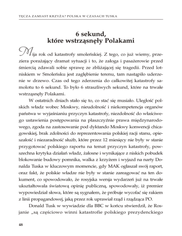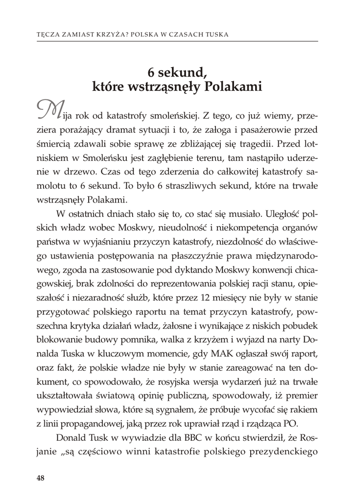 T Ę C Z A Z A M I A S T K R Z Y Ż A ? P O L S K A W C Z A S A C H TU S K A 6 sekund, które wstrząsnęły Polakami M ija rok od katastrofy smoleńskiej. Z tego, co już wiemy, przeziera porażający dramat sytuacji i to, że załoga i pasażerowie przed śmiercią zdawali sobie sprawę ze zbliżającej się tragedii. Przed lotniskiem w Smoleńsku jest zagłębienie terenu, tam nastąpiło uderzenie w drzewo. Czas od tego zderzenia do całkowitej katastrofy samolotu to 6 sekund. To było 6 straszliwych sekund, które na trwałe wstrząsnęły Polakami. W ostatnich dniach stało się to, co stać się musiało. Uległość polskich władz wobec Moskwy, nieudolność i niekompetencja organów państwa w wyjaśnianiu przyczyn katastrofy, niezdolność do właściwego ustawienia postępowania na płaszczyźnie prawa międzynarodowego, zgoda na zastosowanie pod dyktando Moskwy konwencji chicagowskiej, brak zdolności do reprezentowania polskiej racji stanu, opieszałość i niezaradność służb, które przez 12 miesięcy nie były w stanie przygotować polskiego raportu na temat przyczyn katastrofy, powszechna krytyka działań władz, żałosne i wynikające z niskich pobudek blokowanie budowy pomnika, walka z krzyżem i wyjazd na narty Donalda Tuska w kluczowym momencie, gdy MAK ogłaszał swój raport, oraz fakt, że polskie władze nie były w stanie zareagować na ten dokument, co spowodowało, że rosyjska wersja wydarzeń już na trwałe ukształtowała światową opinię publiczną, spowodowały, iż premier wypowiedział słowa, które są sygnałem, że próbuje wycofać się rakiem z linii propagandowej, jaką przez rok uprawiał rząd i rządząca PO. Donald Tusk w wywiadzie dla BBC w końcu stwierdził, że Rosjanie „są częściowo winni katastrofie polskiego prezydenckiego 48 I . S O R R Y, T A K Ą M A M Y I I I R P samolotu w Smoleńsku, ale się do tego nie przyznają”. Ponadto dodał, iż „próbują zatuszować” część okoliczności katastrofy. Tym samym przyznał rację tym, którzy od początku domagali się właściwej postawy polskich władz wobec narodowej tragedii, rzeczowego śledztwa i reprezentowania polskiej racji stanu. Ci Polacy byli ośmieszani i wyszydzani nie tylko przez przedstawicieli władzy, ale również przez służalcze wobec rządzących media i usłużnych komentatorów oraz tak zwane autorytety moralne, którzy ręka w rękę z Moskwą lansowali tezę o rzekomych naciskach na pilotów. Kwestia, czy wypowiedź premiera to nagłe olśnienie, czy raczej socjotechniczny trik, by zneutralizować opinię publiczną zbulwersowaną nieudolnością władz w sprawie wyjaśnienia przyczyn katastrofy, jest pytaniem otwartym. Dla wielu ludzi wierzących w minionym roku po katastrofie szczególnie bolesna była walka z krzyżem na Krakowskim Przedmieściu. Krzyż został postawiony jako święty znak miłości i odkupienia, by upamiętnić modlitwą i zadumą ofiary katastrofy prezydenckiego samolotu, wśród których byli przecież przedstawiciele różnych środowisk społecznych i politycznych. Jednak jego obecność i palące się znicze zostały najwyraźniej uznane przez polityków PO za groźną dla ich kalkulacji politycznych kanwę budowania mitu Lecha Kaczyńskiego. Walka z krzyżem stała się tym samym walką o usuwanie materialnych śladów pamięci po ofiarach katastrofy. „Tylko pod krzyżem, tylko pod tym znakiem, Polska jest Polską, a Polak Polakiem”. Któż nie zna tego słynnego dwuwiersza, który w prostych i jasnych słowach oddaje istniejący u nas od wieków fenomen przywiązania do zbudowanej na fundamencie chrześcijaństwa tradycji kultury polskiej. Dlatego między innymi z krzyżem walczyli zaborcy, Niemcy i Sowieci w czasach II wojny światowej, 49 T Ę C Z A Z A M I A S T K R Z Y Ż A ? P O L S K A W C Z A S A C H TU S K A a po wojnie komuniści. Dziś z krzyżem walczy „obóz postępu i demokracji”. W chwilach szczególnych Polacy odczuwają nieodpartą potrzebę bycia razem, by w jedności zamanifestować swoją postawę, swoje uczucia i oczekiwania. Tragedia smoleńska zamyka kolejny rozdział w naszych dziejach. 10 kwietnia na stałe wejdzie do kalendarium historii, a kto tego nie rozumie, ten nie rozumie istoty polskości. „Nasz Dziennik”, 9–10.04.2011 r. Śpiewak operetkowy B ardzo lubię operetkowe widowiska muzyczne, w których słowo mówione przeplata się z muzyką i akcją sceniczną o komediowym zabarwieniu. Szanuję i cenię osoby obdarzone pięknym głosem i występujące na scenie. Mam w rodzinie artystów śpiewaków oraz aktorów, a dla ludzi sceny mam uznanie i zapewniam, że tytuł felietonu absolutnie się do nich nie odnosi. Rzecz dotyczy tych polityków, którzy swoją służbę publiczną zamieniają w groteskową tragikomedię, a nawet w konwencję żenującej tragifarsy. Problem polega bowiem na tym, że osoby, które rządzą i powinny dbać o dobro wspólne, niekiedy zachowują się tak, jakby występowały w operetce. W pierwszym akcie śpiewają o tym, jak wspaniałych czynów dokonają, jak pokonają kryzys, a Polskę przemienią w kraj powszechnej miłości i szczęśliwości oraz krainę mlekiem i miodem płynącą, a w ostatnim akcie w bólach schodzą ze sceny „pokonani” przez rzeczywistość, zapominając o tym, co sami wcześniej wyśpiewywali. 50 I . S O R R Y, T A K Ą M A M Y I I I R P W operetce pod tytułem „Polska w budowie”, upichconej i skomponowanej przez autorów zajmujących się PR, w głównej roli jest obsadzony Donald Tusk. Gra „charyzmatycznego” premiera. W I akcie, który rozgrywał się w 2007 roku, przez trzy godziny śpiewał solową partię nazywaną exposé o tym, jak wspaniałych dokona czynów, które go opromienią wieczną chwałą. Złożył ponad 120 obietnic, które brzmiały pięknie i nawet spodobały się widowni. W drugim akcie było już gorzej, z szumnych zapowiedzi zrealizowano może kilka, przy czym odwracano kota ogonem i