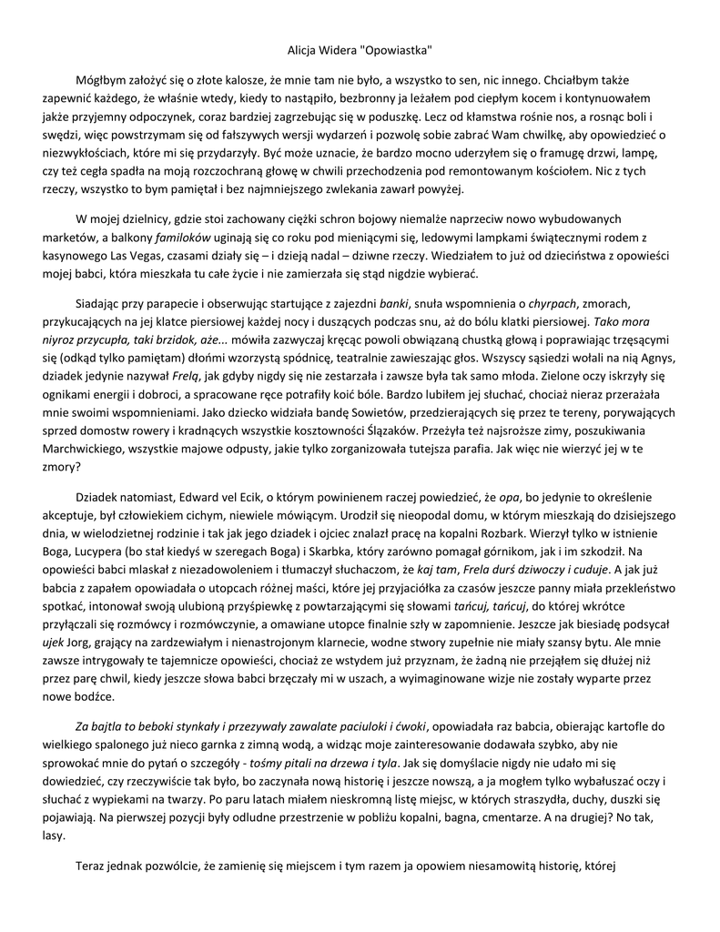 Alicja Widera "Opowiastka" Mógłbym założyć się o złote kalosze, że mnie tam nie było, a wszystko to sen, nic innego. Chciałbym także zapewnić każdego, że właśnie wtedy, kiedy to nastąpiło, bezbronny ja leżałem pod ciepłym kocem i kontynuowałem jakże przyjemny odpoczynek, coraz bardziej zagrzebując się w poduszkę. Lecz od kłamstwa rośnie nos, a rosnąc boli i swędzi, więc powstrzymam się od fałszywych wersji wydarzeń i pozwolę sobie zabrać Wam chwilkę, aby opowiedzieć o niezwykłościach, które mi się przydarzyły. Być może uznacie, że bardzo mocno uderzyłem się o framugę drzwi, lampę, czy też cegła spadła na moją rozczochraną głowę w chwili przechodzenia pod remontowanym kościołem. Nic z tych rzeczy, wszystko to bym pamiętał i bez najmniejszego zwlekania zawarł powyżej. W mojej dzielnicy, gdzie stoi zachowany ciężki schron bojowy niemalże naprzeciw nowo wybudowanych marketów, a balkony familoków uginają się co roku pod mieniącymi się, ledowymi lampkami świątecznymi rodem z kasynowego Las Vegas, czasami działy się – i dzieją nadal – dziwne rzeczy. Wiedziałem to już od dzieciństwa z opowieści mojej babci, która mieszkała tu całe życie i nie zamierzała się stąd nigdzie wybierać. Siadając przy parapecie i obserwując startujące z zajezdni banki, snuła wspomnienia o chyrpach, zmorach, przykucających na jej klatce piersiowej każdej nocy i duszących podczas snu, aż do bólu klatki piersiowej. Tako mora niyroz przycupła, taki brzidok, aże... mówiła zazwyczaj kręcąc powoli obwiązaną chustką głową i poprawiając trzęsącymi się (odkąd tylko pamiętam) dłońmi wzorzystą spódnicę, teatralnie zawieszając głos. Wszyscy sąsiedzi wołali na nią Agnys, dziadek jedynie nazywał Frelą, jak gdyby nigdy się nie zestarzała i zawsze była tak samo młoda. Zielone oczy iskrzyły się ognikami energii i dobroci, a spracowane ręce potrafiły koić bóle. Bardzo lubiłem jej słuchać, chociaż nieraz przerażała mnie swoimi wspomnieniami. Jako dziecko widziała bandę Sowietów, przedzierających się przez te tereny, porywających sprzed domostw rowery i kradnących wszystkie kosztowności Ślązaków. Przeżyła też najsroższe zimy, poszukiwania Marchwickiego, wszystkie majowe odpusty, jakie tylko zorganizowała tutejsza parafia. Jak więc nie wierzyć jej w te zmory? Dziadek natomiast, Edward vel Ecik, o którym powinienem raczej powiedzieć, że opa, bo jedynie to określenie akceptuje, był człowiekiem cichym, niewiele mówiącym. Urodził się nieopodal domu, w którym mieszkają do dzisiejszego dnia, w wielodzietnej rodzinie i tak jak jego dziadek i ojciec znalazł pracę na kopalni Rozbark. Wierzył tylko w istnienie Boga, Lucypera (bo stał kiedyś w szeregach Boga) i Skarbka, który zarówno pomagał górnikom, jak i im szkodził. Na opowieści babci mlaskał z niezadowoleniem i tłumaczył słuchaczom, że kaj tam, Frela durś dziwoczy i cuduje. A jak już babcia z zapałem opowiadała o utopcach różnej maści, które jej przyjaciółka za czasów jeszcze panny miała przekleństwo spotkać, intonował swoją ulubioną przyśpiewkę z powtarzającymi się słowami tańcuj, tańcuj, do której wkrótce przyłączali się rozmówcy i rozmówczynie, a omawiane utopce finalnie szły w zapomnienie. Jeszcze jak biesiadę podsycał ujek Jorg, grający na zardzewiałym i nienastrojonym klarnecie, wodne stwory zupełnie nie miały szansy bytu. Ale mnie zawsze intrygowały te tajemnicze opowieści, chociaż ze wstydem już przyznam, że żadną nie przejąłem się dłużej niż przez parę chwil, kiedy jeszcze słowa babci brzęczały mi w uszach, a wyimaginowane wizje nie zostały wyparte przez nowe bodźce. Za bajtla to beboki stynkały i przezywały zawalate paciuloki i ćwoki, opowiadała raz babcia, obierając kartofle do wielkiego spalonego już nieco garnka z zimną wodą, a widząc moje zainteresowanie dodawała szybko, aby nie sprowokać mnie do pytań o szczegóły - tośmy pitali na drzewa i tyla. Jak się domyślacie nigdy nie udało mi się dowiedzieć, czy rzeczywiście tak było, bo zaczynała nową historię i jeszcze nowszą, a ja mogłem tylko wybałuszać oczy i słuchać z wypiekami na twarzy. Po paru latach miałem nieskromną listę miejsc, w których straszydła, duchy, duszki się pojawiają. Na pierwszej pozycji były odludne przestrzenie w pobliżu kopalni, bagna, cmentarze. A na drugiej? No tak, lasy. Teraz jednak pozwólcie, że zamienię się miejscem i tym razem ja opowiem niesamowitą historię, której doświadczyłem osobiście. Być może nie będzie tak spektakularna jak opowieści umy Agnys, ale musicie wybaczyć doświadczenie moje w tej dziedzinie jest umiarkowanie marne. Od zawsze uwielbiałem spacerować z moim ryszawym czteronogim kompanem po nieco zapomnianej łące, rozciągającej się na obrzeżach mojej dzielnicy, na której rosły dziko między innymi mlecze, stokrotki i bylice. Podziwiałem przebiegające przez wąską ścieżkę polne myszy, zbierałem duże, ptasie pióra, wtykałem sobie je za ucho jak prawdziwy Indianin i maszerowałem po zawijasach drogi, aż do zwalonego drzewa. Dalej już zaczynał się groźny las, określany przez moją babcię jako chałupa Maludego. Nieraz przestrzegała przed nim i straszyła, że stąd wdycki boroki wyparzały wylynkowane. Pewnego chłodnego, październikowego dnia, kiedy liście sprawiały wrażenie zardzewiałych i opadały z drzew w rytmie przyjemnie wiejącego wiatru, a na drogach błyszczały małe kałuże - pozostałości popołudniowego deszczu również wybrałem się w tamtą stronę z moim czteronogiem. Przeszliśmy parę kroków, uważając na rozpoczynające swoją migrację ślimacze rodziny, nim dostrzegłem ciemny kształt, biegnący w stronę lasu. Atos nie mógł być gorszy. Z całą swoją siłą rosnącego kundla, urwał się ze smyczy i ruszył w pogoń za nieznanym ucie