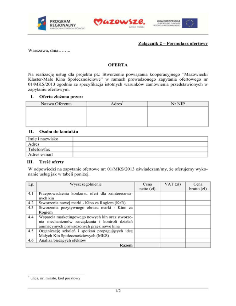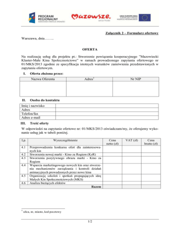 Załącznik 2 – Formularz ofertowy Warszawa, dnia…….. OFERTA Na realizację usług dla projektu pt.: Stworzenie powiązania kooperacyjnego ”Mazowiecki Klaster-Małe Kina Społecznościowe” w ramach prowadzonego zapytania ofertowego nr 01/MKS/2013 zgodnie ze specyfikacja istotnych warunków zamówienia przedstawionych w zapytaniu ofertowym. I. Oferta złożona przez: Nazwa Oferenta II. Adres1 Nr NIP Osoba do kontaktu Imię i nazwisko Adres Telefon/fax Adres e-mail III. Treść oferty W odpowiedzi na zapytanie ofertowe nr: 01/MKS/2013 oświadczam/my, że oferujemy wykonanie usług jak w tabeli poniżej. Lp. Wyszczególnienie 4.1 Przeprowadzenia konkursu ofert dla zainteresowanych kin Stworzenia nowej marki - Kino za Rogiem (KzR) Stworzenia pozytywnego obrazu marki - Kino za Rogiem Wsparcia marketingowego nowych kin oraz stworzenia mechanizmów zarządzania i kontroli działań animacyjnych prowadzonych przez nowe kina Organizację szkoleń i spotkań propagujących ideę Małych Kin Społecznościowych (MKS) Analiza bieżących efektów Razem 4.2 4.3 4.4 4.5 4.6 1 Cena netto (zł) ulica, nr, miasto, kod pocztowy 1/2 VAT (zł) Cena brutto (zł) Niniejszym załączam/y opisy2 do poszczególnych punktów zapytania ofertowego z tabeli powyżej: 4.1 Przeprowadzenia konkursu ofert dla zainteresowanych kin 4.2 Stworzenia nowej marki - Kino za Rogiem (KzR) 4.3 Stworzenia pozytywnego obrazu marki - Kino za Rogiem 4.4 Wsparcia marketingowego nowych kin oraz stworzenia mechanizmów zarządzania i kontroli działań animacyjnych prowadzonych przez nowe kina 4.5 Organizację szkoleń i spotkań propagujących ideę Małych Kin Społecznościowych (MKS) 4.6 Analiza bieżących efektów IV. Oświadczenie Cena podana w ofercie uwzględnia wszystkie koszty wykonania zamówienia; Zobowiązuję/my się wykonać przedmiot zamówienia w terminie do 31.12.2013 roku; Zapoznałem/liśmy się z treścią zapytania ofertowego i nie wnoszę/my zastrzeżeń; Jestem/śmy związany/i/a niniejszą ofertą przez 30 dni od dnia, w którym upływa termin składania ofert wskazany w zaproszeniu do składania ofert. …………………………………………………………. (imię i nazwisko, stanowisko, pieczątka firmowa) (podpis osoby/osób uprawnionej do reprezentowania Wykonawcy) 2 Proszę opisać działania jakie Państwo zamierzacie wykonać w poszczególnych punktach zapytania ofertowego 2/2