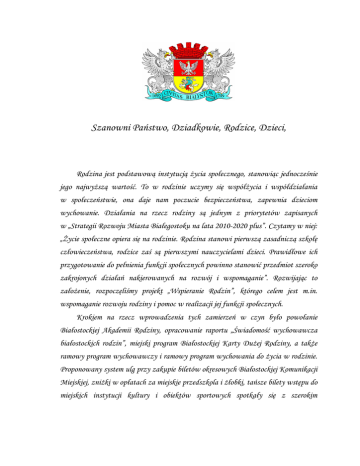Szanowni Państwo, Dziadkowie, Rodzice, Dzieci, Rodzina jest podstawową instytucją życia społecznego, stanowiąc jednocześnie jego najwyższą wartość. To w rodzinie uczymy się współżycia i współdziałania w społeczeństwie, ona daje nam poczucie bezpieczeństwa, zapewnia dzieciom wychowanie. Działania na rzecz rodziny są jednym z priorytetów zapisanych w „Strategii Rozwoju Miasta Białegostoku na lata 2010-2020 plus”. Czytamy w niej: „Życie społeczne opiera się na rodzinie. Rodzina stanowi pierwszą zasadniczą szkołę człowieczeństwa, rodzice zaś są pierwszymi nauczycielami dzieci. Prawidłowe ich przygotowanie do pełnienia funkcji społecznych powinno stanowić przedmiot szeroko zakrojonych działań nakierowanych na rozwój i wspomaganie”. Rozwijając to założenie, rozpoczęliśmy projekt „Wspieranie Rodzin”, którego celem jest m.in. wspomaganie rozwoju rodziny i pomoc w realizacji jej funkcji społecznych. Krokiem na rzecz wprowadzenia tych zamierzeń w czyn było powołanie Białostockiej Akademii Rodziny, opracowanie raportu „Świadomość wychowawcza białostockich rodzin”, miejski program Białostockiej Karty Dużej Rodziny, a także ramowy program wychowawczy i ramowy program wychowania do życia w rodzinie. Proponowany system ulg przy zakupie biletów okresowych Białostockiej Komunikacji Miejskiej, zniżki w opłatach za miejskie przedszkola i żłobki, tańsze bilety wstępu do miejskich instytucji kultury i obiektów sportowych spotkały się z szerokim zainteresowaniem w naszej społeczności. Liczę, że podjęte i planowane działania przyniosą kolejne rozwiązania, służące białostockim rodzinom. Z okazji Międzynarodowego Dnia Rodziny, obchodzonego w tym roku już po raz dwudziesty, życzę wszystkim Rodzinom Miasta Białegostoku, by w swych wysiłkach na rzecz budowy naszej społeczności i naszego wspólnego dobra zawsze odnajdywały radość i satysfakcję. Jestem przekonany, że miejski samorząd zawsze będzie partnerem w Państwa staraniach. Prezydent Miasta Białegostoku Białystok, 15 maja 2014 roku