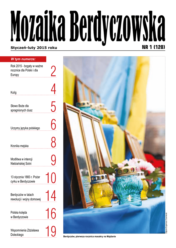 NR 1 (120) Styczeń-luty 2015 roku Rok 2015 - bogaty w ważne rocznice dla Polski i dla Europy Kulig Słowo Boże dla spragnionych dusz Uczymy języka polskiego Kronika mejska Modlitwa w intencji Niebiańskiej Sotni 13 stycznia 1883 r. Pożar cyrku w Berdyczowie Berdyczów w latach rewolucji i wojny domowej Polska kolęda w Berdyczowie Wspomnienia Zdzisława Doleckiego 2 4 5 6 8 9 10 14 16 19 Zdjęcie Eugeniusz Czerniecki W tym numerze: Berdyczów, pierwsza rocznica masakry na Majdanie Wydarzenia w Polsce 1-II 2015 Rok 2015 - bogaty w ważne rocznice dla Polski i dla Europy 2015 rok przyniesie wiele ważnych dla Polski i Europy rocznic. Mija wtedy m.in. 70 lat od wyzwolenia KL Auschwitz i zakończenia II wojny światowej oraz 75. rocznica Zbrodni Katyńskiej. To rok, w którym przypada także 35. roczni- ca Sierpnia’80 i 25. rocznica pierwszych powszechnych wyborów prezydenckich, które wygrał Lech Wałęsa. W 2015 r. mija też 10 lat od śmierci papieża Jana Pawła II i 5 lat od katastrofy smoleńskiej. Polska ma szansę zostać liderem ekoinnowacji Polska może stać się światowym potentatem w tworzeniu technologii ekologicznych. Wyzwania w dziedzinie ekologii, z którymi polskie firmy muszą sobie radzić na krajowym podwórku, zmuszają je do pracy nad nowoczesnymi rozwiązaniami. A te w następnej kolejności będą mogły być eksportowane do innych krajów. Polskę i kraje unijne czekają w najbliższych latach poważne zadania. Emisja CO2 w krajach UE ma w 15 lat zostać zredukowana o 40 proc. 27 proc. energii ma pochodzić ze źródeł odnawialnych. W tym czasie do 30 proc. ma zostać zredukowana ilość odpadów, których nie poddaje się recyklingowi, a KE pracuje nad jeszcze bardziej rygorystycznym planem. Jednocześnie UE wspiera prace nad rozwiązaniem tych kwestii. W ciągu najbliższych pięciu lat Polska może liczyć na ponad 27 mld euro z unijnego programu operacyjnego Infrastruktura i Środowisko oraz na 8,6 mld euro z programu Inteligentny Rozwój. Duża część tych pieniędzy będzie wspierać badania oraz inwestycje związane z ochroną środowiska. Polacy ewakuowani z Donbasu odwiedzili Sejm oraz Senat - Jesteście w miejscu dla nas wyjątkowym, bo w sercu demokracji. (…) Bardzo mi miło, że rozpoczynacie wizytę w Warszawie właśnie od Sejmu - powiedziała wicemarszałek Elżbieta Radziszewska, witając w parlamencie grupę osób polskiego pochodzenia, które z powodu konfliktu na wschodzie Ukrainy musiały opuścić swoje domy, lecz znalazły schronienie w naszym kraju. Wicemarszałek Radziszewska podkreśliła długą, bo ponad 500-letnią tradycję polskiego parlamentaryzmu, z której - jak zaznaczyła - możemy być dumni. Przypomniała, że od 1493 r. mamy w Polsce dwuizbowy parlament. Elżbieta Radziszewska mówiła też o Sejmie, jako miejscu stanowienia prawa i o związanych z nim wartościach takich jak suwerenność i wolność. Goście mogli zobaczyć m.in. hall głów- 2 ny Sejmu, w tym tablice upamiętniające posłów-ofiary II wojny światowej oraz parlamentarzystów, którzy zginęli w katastrofie pod Smoleńskiem, Salę Kolumnową i kuluary przy sali plenarnej. W programie zwiedzania mieli też galerię sali posiedzeń, gdzie wiedzą o pracy posłów i historii polskiego parlamentaryzmu dzielili się z nimi przewodnicy z Wszechnicy Sejmowej. Na trasie wycieczki po gmachu przy Wiejskiej był także korytarz marszałkowski oraz budynek Senatu. Odwiedzający parlament to osoby polskiego pochodzenia, które były w grupie ewakuowanych przez Ministerstwo Spraw Zagranicznych w styczniu br. z ogarniętej walkami wschodniej Ukrainy. Wśród nich są głównie rodziny z dziećmi oraz osoby starsze. Polacy z Donbasu trafili m.in. do ośrodka w Rybakach. Walentynki: Polacy wydadzą nawet 1,5 mld zł Polacy polubili święto zakochanych. Nie obchodzą go hucznie, raczej kameralnie, ale rosną walentynkowe budżety Polaków. To okazja dla handlowców, którzy po okresie styczniowego spowolnienia liczą na wzrost liczby klientów. Nie ma więc co liczyć na promocyjne ceny najpopularniejszych w to święto kwiatów, słodyczy i perfum. Szacuje się, że na prezenty i świętowanie dnia zakochanych Polacy mogą wydać nawet 1,5 mld zł. Fiskus tylko z tytułu podatku VAT zarobi ok. 170 mln zł. Z badania SW Research wynika, że 38,4 proc. kobiet oraz 41,6 proc. mężczyzn zamierza wydać na walentynki od 51 do 100 zł. Z kolei 15,8 proc. kobiet oraz 21,5 proc. mężczyzn chce wydać więcej, a niemal co czwarta badana osoba, choć planuje obchodzić to święto, chce wydać mniej niż 50 zł. Opinie publiczne I-II 2015 W imieniu Polaków na Ukrainie Dziś Ukraina, państwo którego obywatelami jesteśmy także my – miejscowi Polacy, stoi chyba przed największym wyzwaniem w całej historii swojego istnienia na mapie świata. Rosyjski agresor, nie reagując na wyrazy „zaniepokojenia” ze strony krajów Europy i USA, dzień za dniem pomaga wspieranym militarnie przez niego separatystom rozszerzać kontrolowaną przez nich strefę na Donbasie, równając z ziemią coraz to nowe miasta i wsie. Wbrew opiniom wielu ekspertów, Putin nie zatrzymał się na Krymie. Sztucznie zainicjowana przez rosyjskie służby specjalne rebelia w Doniecku i Ługańsku, już pochłonęła tysiące ofiar, także polskiego Zdjęcie nnm.me Obserwując wydarzenia na wschodzie Ukrainy, my – miejscowi Polacy, nie możemy stać biernie wobec tego co się dzieje z naszą ojczyzną, skropioną krwią powstańców styczniowych, żołnierzy Wojska Polskiego, broniących „Naszej i Waszej Wolności”, ofiar represji NKWD w latach 30. XX wieku i bratobójczego konfliktu na Wołyniu w latach 1943-44. pochodzenia. Do walki ze wspieranymi militarnie i finansowo prorosyjskimi terrorystami wstali z bronią w ręku nasi rodacy – Polacy z Mościsk, Lwowa, Żytomierza i Krasiłowa... W nierównej bitwie oni ramię w ramię z Ukraińcami, Białorusinami i przedstawicielami innych na