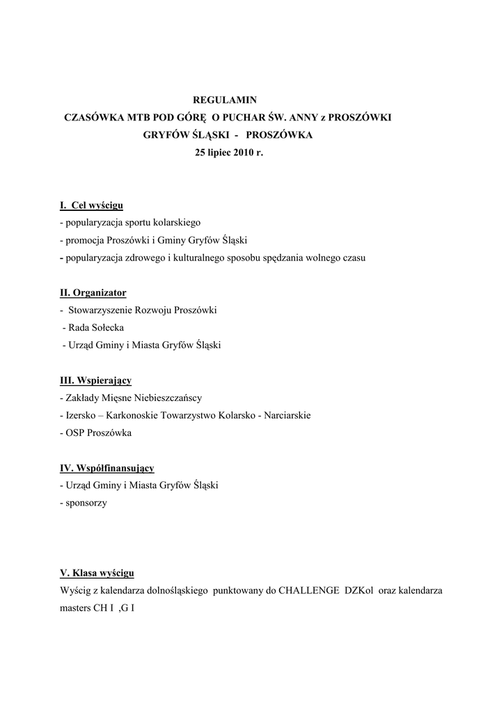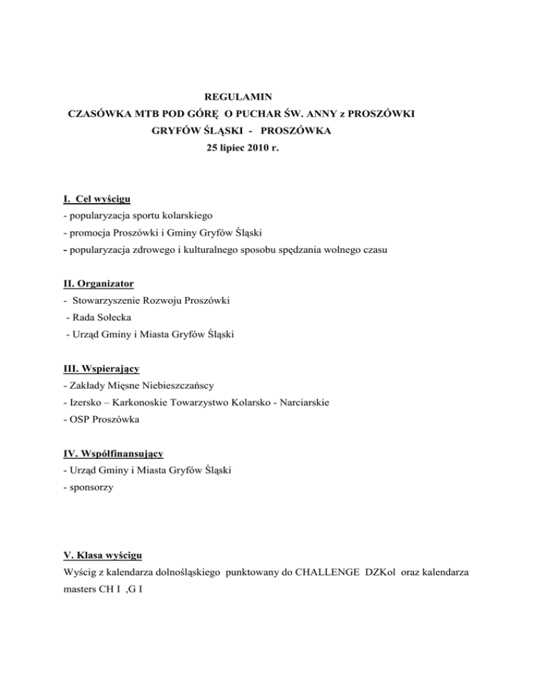 REGULAMIN CZASÓWKA MTB POD GÓRĘ O PUCHAR ŚW. ANNY z PROSZÓWKI GRYFÓW ŚLĄSKI - PROSZÓWKA 25 lipiec 2010 r. I. Cel wyścigu - popularyzacja sportu kolarskiego - promocja Proszówki i Gminy Gryfów Śląski - popularyzacja zdrowego i kulturalnego sposobu spędzania wolnego czasu II. Organizator - Stowarzyszenie Rozwoju Proszówki - Rada Sołecka - Urząd Gminy i Miasta Gryfów Śląski III. Wspierający - Zakłady Mięsne Niebieszczańscy - Izersko – Karkonoskie Towarzystwo Kolarsko - Narciarskie - OSP Proszówka IV. Współfinansujący - Urząd Gminy i Miasta Gryfów Śląski - sponsorzy V. Klasa wyścigu Wyścig z kalendarza dolnośląskiego punktowany do CHALLENGE DZKol oraz kalendarza masters CH I ,G I VI. Uczestnictwo W wyścigu uczestniczą zawodnicy zaliczający się do kategorii Masters oraz Kobiety i MęŜczyźni w kategorii (młodzik, junior mł., junior i senior) Prawo startu posiadają zawodnicy posiadający licencję kolarską na rok 2010, badania lekarskie a niezrzeszeni startują po wypełnieniu oświadczenia. VII. Biuro wyścigu Biuro zawodów: Gryfów Śląski( Ratusz) Zgłoszenia w dniu zawodów od godz. 8.00 do godz.10.00 w biurze wyścigu 10.15 – odprawa techniczna w Biurze Zawodów VIII. Termin i miejsce wyścigu: Wyścig odbędzie się w dniu 25.07.2010 r. na trasie Gryfów Śląski – Proszówka Start godz.11.00 Gryfów Śląski Meta : Proszówka Góra Św. Anny – Kapliczka IX. Sposób przeprowadzenia wyścigu: - jazda indywidualna na czas pod górę rozegrana zostanie w 22 kategoriach W dniu 25.07.2010r. (niedziela) Dystans 7 km. Start zawodników co 1 min. W przypadku większej ilości zawodników starty co 30 sek Zakończenie około godz. 14.00 – Góra Św. Anny (meta) Wyścig odbędzie się zgodnie z przepisami PZKol. i niniejszym regulaminem. Wyścig jest rozgrywany w następujących kategoriach wiekowych licencja i niezrzeszeni : Młodzik/czka 13 -14 lat rocznik 1997-1996 Junior/ka mł. 15 -16 lat rocznik 1995-1994 Junior/ka 17 -18 lat rocznik 1993-1992 Senior/ka Masters 19 - lat rocznik 1991 i starszy/a Kat. I 30 - 39 lat rocznik 1980-1971 Kat. II 40 - 49 lat rocznik 1970-1961 Kat. III 50 - 59 lat rocznik 1960-1951 Kat. IV 60 - 69 lat rocznik 1950-1941 Kat. V 70 - i starsi rocznik 1940 i starsi Startujący winni: posiadać pełny kask, sprawny technicznie rower górski z dwoma czynnymi hamulcami, zawodnicy z licencją aktualne badania lekarskie, zawodnicy bez licencji wypełnią zgłoszenie do wyścigu a Ci którzy nie ukończyli 18 lat winni posiadać pisemną zgodę rodzica lub prawnego opiekuna zezwalającą na start w wyścigu. X Klasyfikacja : Zwycięzcą wyścigu zostanie zawodnik, który uzyska najlepszy czas przejazdu na powyŜszym dystansie. XI. Finansowanie: Opłata startowa w wyścigu wynosi wg stawek PZKol i kalendarza masters na rok 2010. Koszty uczestnictwa pokrywają sami uczestnicy. Koszty organizacyjne i komisji sędziowskiej pokrywa organizator. XII. Nagrody: Puchar za najlepszy czas przejazdu – „Puchar Św. Anny”. Nagrody rzeczowe I do III miejsca Dyplomy od I do VI miejsce JeŜeli w danej kategorii będzie mniej niŜ 10 zawodników/czek , nagradzany będzie tylko zwycięzca. KaŜdy uczestnik wyścigu, po oddaniu numeru startowego otrzyma bon na posiłek (kiełbaska do ogniska) XIII. Postanowienia Końcowe: Komisję sędziowską wyznaczy Kolegium DZKol na wniosek organizatora. Sędzia Główny wyścigu Wiesław Kucab z Jeleniej Góry tel. Kom. 607 495 737 Organizator nie odpowiada za wypadki spowodowane przez zawodników bądź osoby towarzyszące w trakcie trwania wyścigu. Organizator nie ponosi odpowiedzialności za rzeczy skradzione , zagubione lub zniszczone przed , w trakcie i po imprezie. Organizator w porozumieniu z sędzią głównym zastrzegają sobie prawo ewentualnych zmian w regulaminie we wszystkich sprawach w nim nie ujętych. Zawodnicy powinni posiadać ubezpieczenie NW i OC XI. Osoby odpowiedzialne za organizację imprezy - Sekretarz Biura Zawodów Agnieszka August tel…501 306 950………….. Adres szpitala: Jelenia Góra, ul. Ogińskiego 6, tel. +48 (075) 75-31-905, 75-42-048 Lwówek Śl. , ul. Morcinka 7, tel. +48(75) 792 01 04 Regulamin zatwierdzony w dniu 26.05.2010 Tadeusz Daszkiewicz DZKol
