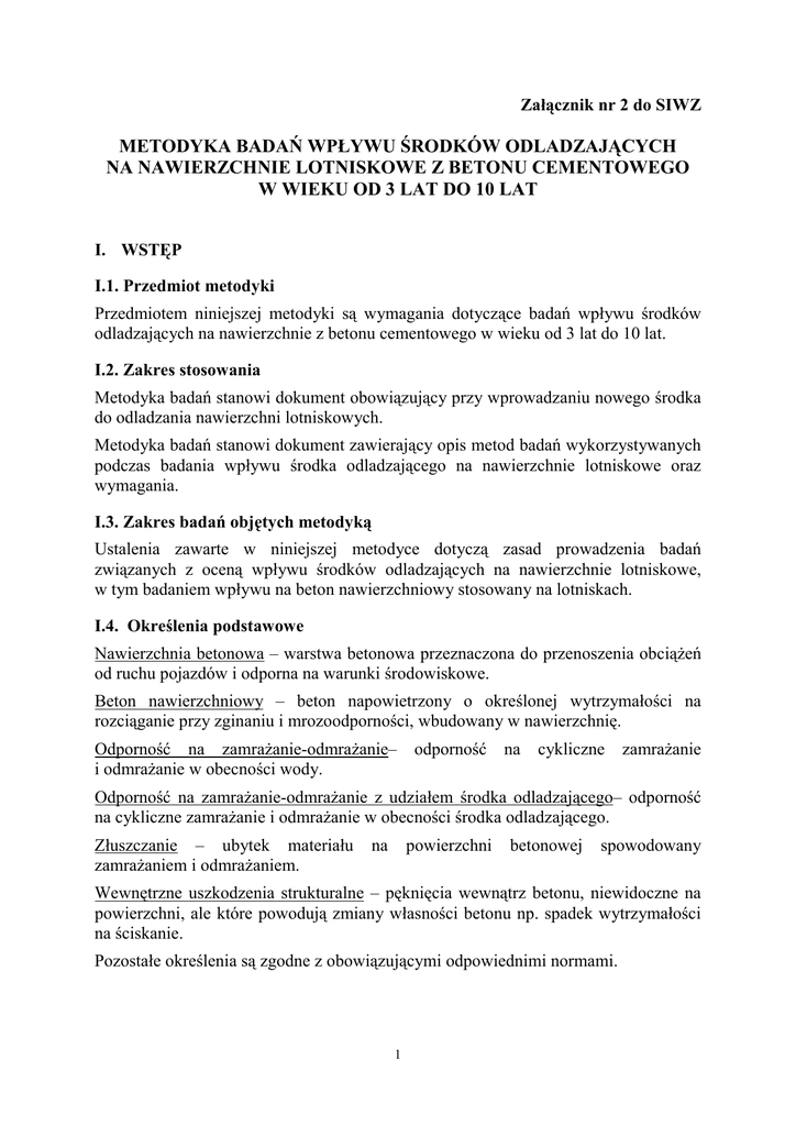 Załącznik nr 2 do SIWZ METODYKA BADAŃ WPŁYWU ŚRODKÓW ODLADZAJĄCYCH NA NAWIERZCHNIE LOTNISKOWE Z BETONU CEMENTOWEGO W WIEKU OD 3 LAT DO 10 LAT I. WSTĘP I.1. Przedmiot metodyki Przedmiotem niniejszej metodyki są wymagania dotyczące badań wpływu środków odladzających na nawierzchnie z betonu cementowego w wieku od 3 lat do 10 lat. I.2. Zakres stosowania Metodyka badań stanowi dokument obowiązujący przy wprowadzaniu nowego środka do odladzania nawierzchni lotniskowych. Metodyka badań stanowi dokument zawierający opis metod badań wykorzystywanych podczas badania wpływu środka odladzającego na nawierzchnie lotniskowe oraz wymagania. I.3. Zakres badań objętych metodyką Ustalenia zawarte w niniejszej metodyce dotyczą zasad prowadzenia badań związanych z oceną wpływu środków odladzających na nawierzchnie lotniskowe, w tym badaniem wpływu na beton nawierzchniowy stosowany na lotniskach. I.4. Określenia podstawowe Nawierzchnia betonowa – warstwa betonowa przeznaczona do przenoszenia obciążeń od ruchu pojazdów i odporna na warunki środowiskowe. Beton nawierzchniowy – beton napowietrzony o określonej wytrzymałości na rozciąganie przy zginaniu i mrozoodporności, wbudowany w nawierzchnię. Odporność na zamrażanie-odmrażanie– i odmrażanie w obecności wody. odporność na cykliczne zamrażanie Odporność na zamrażanie-odmrażanie z udziałem środka odladzającego– odporność na cykliczne zamrażanie i odmrażanie w obecności środka odladzającego. Złuszczanie – ubytek materiału zamrażaniem i odmrażaniem. na powierzchni betonowej spowodowany Wewnętrzne uszkodzenia strukturalne – pęknięcia wewnątrz betonu, niewidoczne na powierzchni, ale które powodują zmiany własności betonu np. spadek wytrzymałości na ściskanie. Pozostałe określenia są zgodne z obowiązującymi odpowiednimi normami. 1 II. MATERIAŁY II.1 Ogólne wymagania dotyczące materiałów Ogólne wymagania dotyczące materiałów odnoszące się do własności fizykochemicznych, wpływu na środowisko, sposobu obchodzenia się, zasad przechowywania, sposobu stosowania, podano w kartach charakterystyki, kartach bezpieczeństwa i specyfikacjach technicznych opracowanych przez producenta. II.2. Środki odladzające w postaci płynnej Należy stosować środki odladzające dostępne w handlu, odpowiadające wymaganiom dokumentu SAE AMS 1435 [1]. II.3. Środki odladzające w postaci stałej Należy stosować środki odladzające dostępne w handlu, odpowiadające wymaganiom dokumentu SAE AMS 1431 [2]. Do badań stosować roztwory nasycone w 20ºC. III. BADANIA LABORATORYJNE III.1. Próbki do badań (próbki nie zabezpieczone i zabezpieczone preparatem do hydrofobizacji betonu) III.1.1. Próbki do badań w postaci odwiertów rdzeniowych o średnicy 15 cm pobrane z ułożonej nawierzchni, zgodnie z PN-EN 12504-1:2011. Pobrane odwierty zabezpieczyć przed utratą wilgoci. III.1.2. Plastry wycięte z odwiertu rdzeniowego wg PN-V-83002:1999. III.1.3. Próbki wycięte z górnej warstwy odwiertu rdzeniowego pobranego z nawierzchni o wymiarach co najmniej 3x3x3 cm. III.2.Badania betonu III.2.1. gęstość objętościowaokreślić wg PN-EN 12390-7:2011. III.2.2. wytrzymałość na ściskanieokreślić wg PN-EN 12390-3:2011. Wyniki badań nie powinny być niższe niż podane w recepcie. III.2.3. nasiąkliwość w wodzieokreślić zgodnie z PN-B-6250:1988. Uzyskana średnia wartość nasiąkliwości nie powinna być większa niż 5 %. III.3. Badania trwałości betonu nawierzchniowego narażonego na oddziaływanie mrozu i środków odladzających III.3.1. mrozoodporność metodą zwykłąokreślić wg PN-B-6250:1988 pkt. 6.5 (nasączanie próbek w wodzie, rozmrażanie w wodzie). Wymagania: F200, ubytek masy ≤ 5,0 %, spadek wytrzymałości ≤ 20 %. III.3.2. nasiąkliwość w środku odladzającymokreślić stosując metodęzwykłą wg 2 PN-88/B-06250 pkt. 6.4.zmodyfikowaną. Różnica polega na tym, że zamiast wody stosuje się środek odladzający. Uzyskana średnia wartość nasiąkliwości nie powinna być większa niż 5 %. III.3.3. odporność na środki odladzające, metoda A - Badanie wykonać zgodnie z metodą badania mrozoodporności podaną w normie PN-B-6250:1988 pkt.6.5, z tym, że próbkę nasączyć w środku odladzającym, po czym próbkę poddać 200 cyklom zamrażania – odmrażania polegającym na zamrażaniu całej próbki w powietrzu i odmrażaniu w środku odladzającym (środek odladzający w obiegu zamkniętym w komorze zamrażalniczej). Wymagania: F200, ubytek masy ≤ 5,0 %, spadek wytrzymałości na ściskanie ≤ 20 %. III.3.4. odporność na środki odladzające, metoda B - Badanie wykonać zgodnie z metodą badania mrozoodporności podaną w normie PN-B-6250:1988 pkt.6.5, z tym, że próbkę nasączyć w środku odladzającym, po czym próbkę poddać 200 cyklom zamrażania – odmrażania polegającym na zamrażaniu całej próbki w powietrzu i odmrażaniu w wodzie. Co 50 cykli próbkę wyjąć z komory zamrażalniczej podczas cyklu rozmrażania i umieścić ją w środku odladzającym na 5 dni, po czym ponownie włożyć do komory zamrażalniczej. Wymagania: F200, ubytek masy ≤ 5,0 %, spadek wytrzymałości na ściskanie ≤ 20 %. III.3.5. odporność na środki odladzające, metoda C - Badanie wykonać zgodnie z metodą badania mrozoodporności podaną w normie PN-B-6250:1988 pkt.6.5, z tym, że próbkę nasączyć w środku odladzającym, po czym próbkę poddać 200 cyklom zamrażania – odmrażania polegającym na zamrażaniu całej próbki w środku odladzającym i odmrażaniu w środku odladzającym (próbki umieszczone w pojemniku). Wymagania: F200, ubytek masy ≤ 5,0 %, spadek wytrzymałości na ściskanie≤ 20 %. III.3.6. odporność na powierzchniowe złuszczanie- Badanie wykonać wg PKN-CEN/TS 12390-9:2007 (metoda referencyjna, wykonać 112 cykli).Masa materiału złuszczonego nie powinna przekraczać 0,01 kg/m2). III.3.7. o