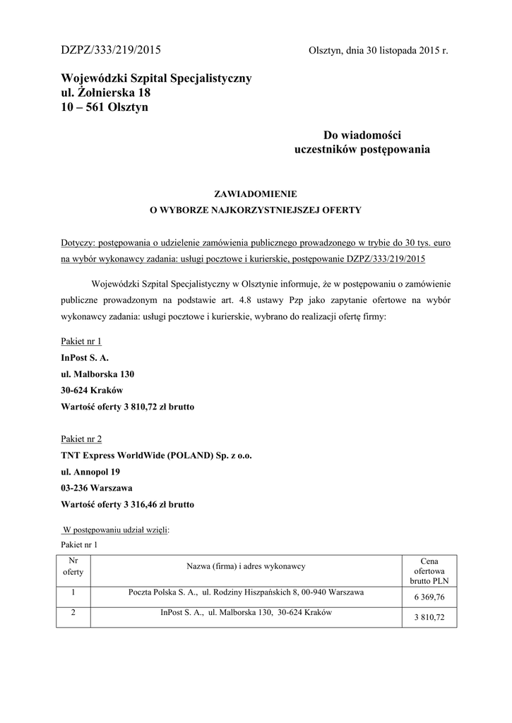 DZPZ/333/219/2015 Olsztyn, dnia 30 listopada 2015 r. Wojewódzki Szpital Specjalistyczny ul. Żołnierska 18 10 – 561 Olsztyn Do wiadomości uczestników postępowania ZAWIADOMIENIE O WYBORZE NAJKORZYSTNIEJSZEJ OFERTY Dotyczy: postępowania o udzielenie zamówienia publicznego prowadzonego w trybie do 30 tys. euro na wybór wykonawcy zadania: usługi pocztowe i kurierskie, postępowanie DZPZ/333/219/2015 Wojewódzki Szpital Specjalistyczny w Olsztynie informuje, że w postępowaniu o zamówienie publiczne prowadzonym na podstawie art. 4.8 ustawy Pzp jako zapytanie ofertowe na wybór wykonawcy zadania: usługi pocztowe i kurierskie, wybrano do realizacji ofertę firmy: Pakiet nr 1 InPost S. A. ul. Malborska 130 30-624 Kraków Wartość oferty 3 810,72 zł brutto Pakiet nr 2 TNT Express WorldWide (POLAND) Sp. z o.o. ul. Annopol 19 03-236 Warszawa Wartość oferty 3 316,46 zł brutto W postępowaniu udział wzięli: Pakiet nr 1 Nr oferty Nazwa (firma) i adres wykonawcy 1 Poczta Polska S. A., ul. Rodziny Hiszpańskich 8, 00-940 Warszawa 2 InPost S. A., ul. Malborska 130, 30-624 Kraków Cena ofertowa brutto PLN 6 369,76 3 810,72 Pakiet nr 2 Nr oferty Nazwa (firma) i adres wykonawcy 1 TNT Express WorldWide (POLAND) Sp. z o.o., ul. Annopol 19, 03-236 Warszawa Cena ofertowa brutto PLN 3 316,46 Uzasadnienie wyboru: Wybrana oferta spełnia wymagania określone w przyjętym kryterium wyboru jakim była cena. Podpisanie umowy: Umowa w sprawie zamówienia publicznego zostanie jednostronnie podpisana (3 egz.) i wysłana pocztą. DYREKTOR WSS W OLSZTYNIE Irena Kierzkowska (Podpis osoby uprawnionej)