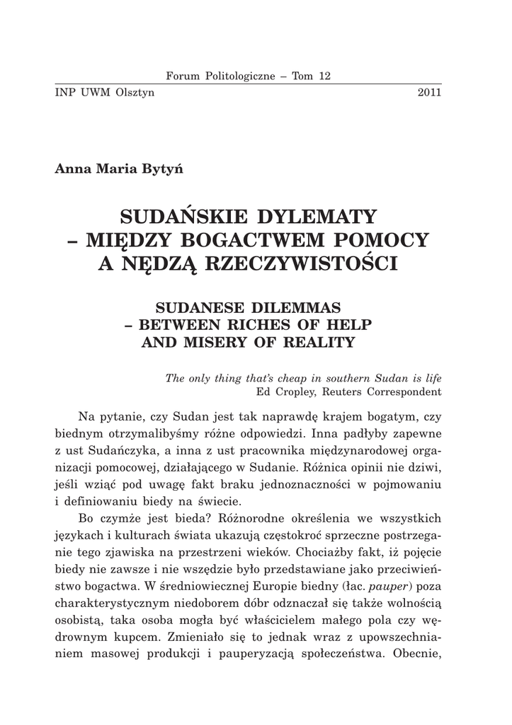Forum Politologiczne Tom 12 INP UWM Olsztyn 2011 Anna Maria Bytyñ SUDAÑSKIE DYLEMATY MIÊDZY BOGACTWEM POMOCY A NÊDZ¥ RZECZYWISTOCI SUDANESE DILEMMAS BETWEEN RICHES OF HELP AND MISERY OF REALITY The only thing that's cheap in southern Sudan is life Ed Cropley, Reuters Correspondent Na pytanie, czy Sudan jest tak naprawdê krajem bogatym, czy biednym otrzymalibymy ró¿ne odpowiedzi. Inna pad³yby zapewne z ust Sudañczyka, a inna z ust pracownika miêdzynarodowej organizacji pomocowej, dzia³aj¹cego w Sudanie. Ró¿nica opinii nie dziwi, jeli wzi¹æ pod uwagê fakt braku jednoznacznoci w pojmowaniu i definiowaniu biedy na wiecie. Bo czym¿e jest bieda? Ró¿norodne okrelenia we wszystkich jêzykach i kulturach wiata ukazuj¹ czêstokroæ sprzeczne postrzeganie tego zjawiska na przestrzeni wieków. Chocia¿by fakt, i¿ pojêcie biedy nie zawsze i nie wszêdzie by³o przedstawiane jako przeciwieñstwo bogactwa. W redniowiecznej Europie biedny (³ac. pauper) poza charakterystycznym niedoborem dóbr odznacza³ siê tak¿e wolnoci¹ osobist¹, taka osoba mog³a byæ w³acicielem ma³ego pola czy wêdrownym kupcem. Zmienia³o siê to jednak wraz z upowszechnianiem masowej produkcji i pauperyzacj¹ spo³eczeñstwa. Obecnie, 368 Anna Maria Bytyñ w naszym krêgu kulturowym bieda to po prostu brak mo¿liwoci zaspokajania podstawowych potrzeb. Inaczej w Afryce, tam pojêcia bieda i bogactwo definiowane by³y (i jeli tradycja jest podtrzymywana nadal s¹) zupe³nie inaczej, w oderwaniu od pieni¹dza i kolorowego telewizora. Bogactwem czêsto jest po prostu potomstwo, bied¹ jego brak. Jakkolwiek jednak opisywaæ biedê, wspólnym mianownikiem dla wszystkich opcji zawsze bêdzie pojêcie niedostatku, braku. Kiedy jednak definiujemy biedê jako brak rzeczy niezbêdnych do ¿ycia, pojawiaj¹ siê pytania: Co tak naprawdê nale¿y do rzeczy niezbêdnych i dla kogo? Kto definiuje biedê i czy na pewno mo¿na pozwoliæ sobie tutaj na uniwersalizm? Mamy tu do czynienia z pewn¹ dwuznacznoci¹ dla jednego to ju¿ bieda, dla kogo innego jeszcze nie. Istnieje co najmniej kilka kategorii biedy i co najmniej kilkanacie jej powa¿niejszych definicji. W kontekcie przedstawianego tutaj tematu ciekaw¹ jawi siê opinia Majid Rajnehmy i¿ dwuznacznoæ [w pojmowaniu biedy A.M. Bytyñ] zaczyna siê w momencie, kiedy przekracza siê granice kultur rodzimych1. W przypadku Sudanu Po³udniowego kwestia biedy nie wydaje siê a¿ tak z³o¿ona. Tam przyczyn biedy upatruje siê jednoznacznie w d³ugoletniej wojnie, która spowodowa³a nie tylko dewastacjê rodowiska i habitatu, ale tak¿e za³amanie funkcjonowania tradycyjnych form spo³eczno-gospodarczych miejscowych plemion. Dodatkowo skutkiem wojny by³ brak jakichkolwiek pañstwowych inwestycji rozwojowych. Faktem jest jedn¹ z g³ównych przyczyn biedy w Sudanie Po³udniowym jest wojna domowa, która trwa³a w³aciwie (z jedenastoletni¹ przerw¹) od uzyskania niepodleg³oci w 1956 roku do roku 2005. Po podpisaniu wówczas (1 stycznia 2005 roku) porozumienia pokojowego sytuacja ta, jak obiecywa³a spo³ecznoæ miêdzynarodowa, mia³a siê zmieniaæ, Sudan Po³udniowy mia³ siê rozwijaæ, podnosiæ z nêdzy. A czy tak siê sta³o? Czy piêæ lat po podpisaniu pokoju Sudan bogaci siê, a Sudañczykom ubywa problemów i ¿yje 1 M. Rajnehma, Bieda, w: Dialogi o Rozwoju, red. B. Lisocka-Jaegermann, Warszawa 2007, s. 3637. Sudañskie dylematy miêdzy bogactwem pomocy a nêdz¹... 369 im siê lepiej? A jeli tak czy to tylko dziêki organizacjom miêdzynarodowym? Jak du¿e s¹ pieni¹dze, które oferuje siê Po³udniu, i na co s¹ przeznaczane? Czy dotowane w Sudan fundusze zaspokajaj¹ pierwsze i podstawowe potrzeby mieszkañców? Jeli nie to dlaczego? Na te pytania spróbujê odpowiedzieæ poni¿ej. Niniejszy artyku³ jest prób¹ analizy sytuacji spo³eczno-ekonomicznej dzisiejszego Sudanu Po³udniowego w kontekcie wspomnianej pomocy miêdzynarodowej, kraju, ponad 40 lat nêkanego wojn¹ domow¹, przed którym w niedalekiej perspektywie stoi mo¿liwoæ uzyskania niepodleg³oci; regionu Afryki, do którego rocznie nap³ywaj¹ setki milionów dolarów pomocy miêdzynarodowej. Przedstawiona zostanie nie tylko obecna sytuacja tego regionu, ale tak¿e zarysowany zostanie profil dzia³alnoci najwa¿niejszych organizacji miêdzynarodowych2, dzia³aj¹cych na tym terenie, przy czym rozwa¿ona zostanie wysokoæ dostarczanej pomocy w stosunku do rezultatów jakie ona przynosi. Sytuacja Sudanu Po³udniowego po popisaniu porozumienia pokojowego (Comprehensive Peace Agreement, CPA) na pocz¹tku 2005 roku by³a bardzo niestabilna. W rzeczywistoci bowiem nigdy nie by³o jednolitego g³osu i stanowiska Po³udniowców. Nawet g³ówny przywódca ruch partyzanckiego, John Garang, opiewany jako bohater walk o niepodleg³oæ Sudanu Po³udniowego po pierwsze pocz¹tkowo wcale nie optowa³ za niepodleg³oci¹, a jedynie za autonomi¹3, a po wtóre jego g³os by³ tylko g³osem ludu Dinka, a na omawianych terenach zamieszkuje jeszcze sporo innych grup etnicznych rolników i pasterzy, wspominaj¹c chocia¿by Nuerów, którzy niemal od zawsze byli w stanie wojny z Dinka. Dalej, to w³anie konflikty plemienne utrudnia³y na Po³udniu nie tylko jakiekolwiek procesy zjednoczeniowe, ale i rozwojowe. Walcz¹ce ze sob¹ plemiona 2 Dalej miêdzynarodowe organizacje pozarz¹dowe w angielskim skrócie NGOs Non-Governmental Organisations (NGOs). 3 M. Z¹bek, Sudan pod rz¹dami fundamentalistów (19891995), w: Róg Afryki, red. J. Mantel-Nieæko, M. Z¹bek, Warszawa 1999, s. 152, 161, 165. 370 Anna Maria Bytyñ nie potrafi³y dzia³aæ wspólnie przeciwko oddzia³om rz¹dowym i taka sytuacja rysuje siê tak¿e obecnie. Po zakoñczeniu wojny w³adza w autonomicznym regionie Sudan Po³udniowy przesz³a znów w rêce przedstawicieli plemienia Dinka. Pierwszym prezydentem zosta³ gen. John Garang, jednak zgin¹³ tragicznie w katastrofie lotniczej ju¿ w lipcu 2005 roku. Jego nastêpca Salva Kiir Mayardit p