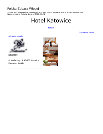 Polska Zobacz Więcej Źródło: http://polskazobaczwiecej.pl/pzw/oferty-za-pol-ceny/r856043678,Hotel-Katowice.html Wygenerowano: Sobota, 4 marca 2017, 10:23 Hotel Katowice Powrót Szczegóły oferty zakwaterowanie Kontakt al. Korfantego 9, 40-951 Katowice Katowice, śląskie