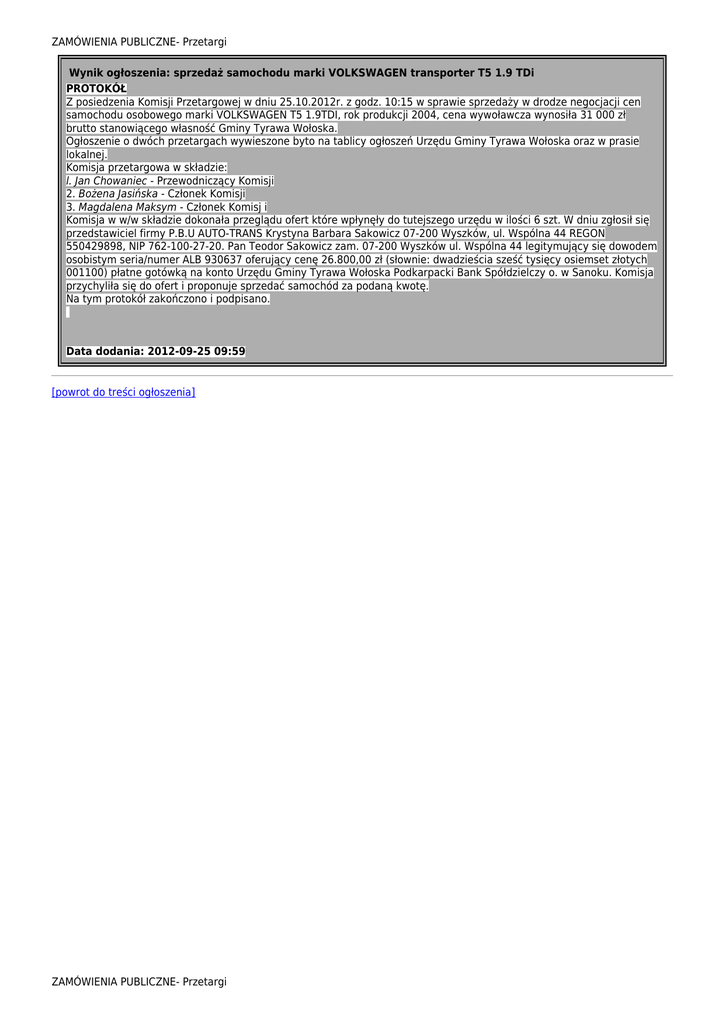 ZAMÓWIENIA PUBLICZNE- Przetargi Wynik ogłoszenia: sprzedaż samochodu marki VOLKSWAGEN transporter T5 1.9 TDi PROTOKÓŁ Z posiedzenia Komisji Przetargowej w dniu 25.10.2012r. z godz. 10:15 w sprawie sprzedaży w drodze negocjacji cen samochodu osobowego marki VOLKSWAGEN T5 1.9TDI, rok produkcji 2004, cena wywoławcza wynosiła 31 000 zł brutto stanowiącego własność Gminy Tyrawa Wołoska. Ogłoszenie o dwóch przetargach wywieszone byto na tablicy ogłoszeń Urzędu Gminy Tyrawa Wołoska oraz w prasie lokalnej. Komisja przetargowa w składzie: l. Jan Chowaniec - Przewodniczący Komisji 2. Bożena Jasińska - Członek Komisji 3. Magdalena Maksym - Członek Komisj i Komisja w w/w składzie dokonała przeglądu ofert które wpłynęły do tutejszego urzędu w ilości 6 szt. W dniu zgłosił się przedstawiciel firmy P.B.U AUTO-TRANS Krystyna Barbara Sakowicz 07-200 Wyszków, ul. Wspólna 44 REGON 550429898, NIP 762-100-27-20. Pan Teodor Sakowicz zam. 07-200 Wyszków ul. Wspólna 44 legitymujący się dowodem osobistym seria/numer ALB 930637 oferujący cenę 26.800,00 zł (słownie: dwadzieścia sześć tysięcy osiemset złotych 001100) płatne gotówką na konto Urzędu Gminy Tyrawa Wołoska Podkarpacki Bank Spółdzielczy o. w Sanoku. Komisja przychyliła się do ofert i proponuje sprzedać samochód za podaną kwotę. Na tym protokół zakończono i podpisano. Data dodania: 2012-09-25 09:59 [powrot do treści ogłoszenia] ZAMÓWIENIA PUBLICZNE- Przetargi