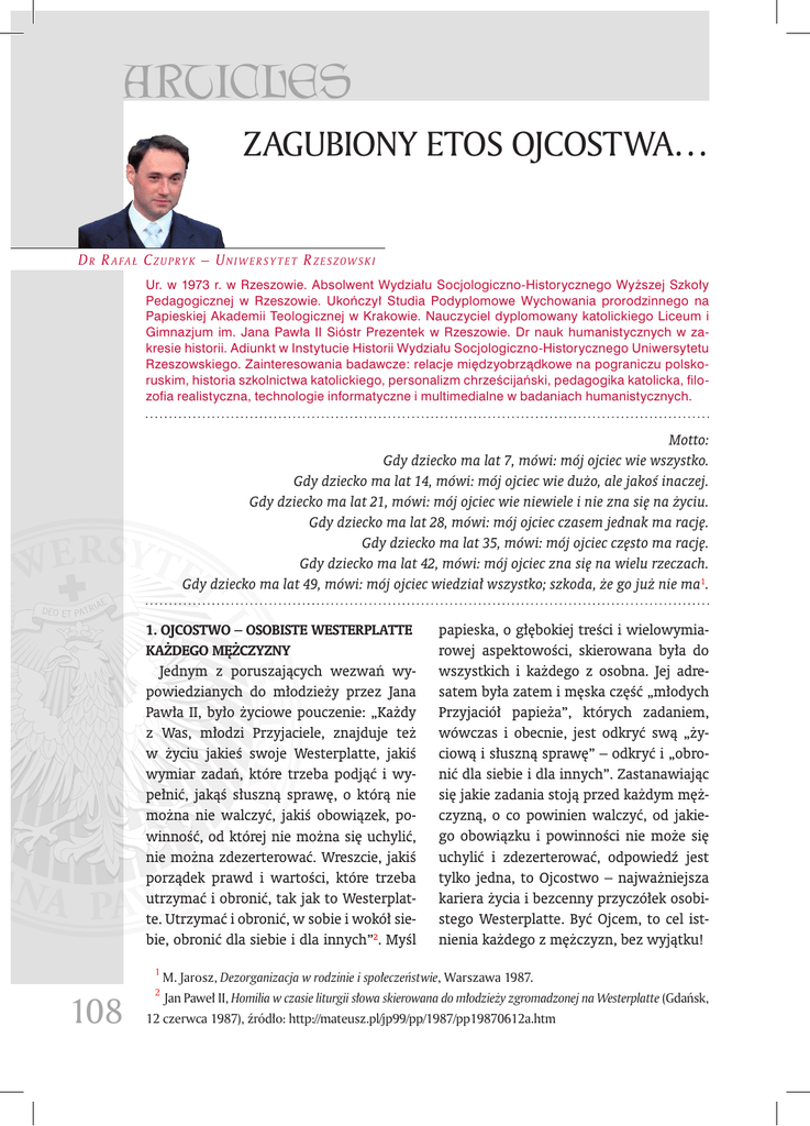 ARTICLES ZAGUBIONY ETOS OJCOSTWA… Dr R a fa ł Cz u pry k – Un i w e r s y t e t R z e szow sk i Ur. w 1973 r. w Rzeszowie. Absolwent Wydziału Socjologiczno-Historycznego Wyższej Szkoły Pedagogicznej w Rzeszowie. Ukończył Studia Podyplomowe Wychowania prorodzinnego na Papieskiej Akademii Teologicznej w Krakowie. Nauczyciel dyplomowany katolickiego Liceum i Gimnazjum im. Jana Pawła II Sióstr Prezentek w Rzeszowie. Dr nauk humanistycznych w zakresie historii. Adiunkt w Instytucie Historii Wydziału Socjologiczno-Historycznego Uniwersytetu Rzeszowskiego. Zainteresowania badawcze: relacje międzyobrządkowe na pograniczu polskoruskim, historia szkolnictwa katolickiego, personalizm chrześcijański, pedagogika katolicka, filozofia realistyczna, technologie informatyczne i multimedialne w badaniach humanistycznych. Motto: Gdy dziecko ma lat 7, mówi: mój ojciec wie wszystko. Gdy dziecko ma lat 14, mówi: mój ojciec wie dużo, ale jakoś inaczej. Gdy dziecko ma lat 21, mówi: mój ojciec wie niewiele i nie zna się na życiu. Gdy dziecko ma lat 28, mówi: mój ojciec czasem jednak ma rację. Gdy dziecko ma lat 35, mówi: mój ojciec często ma rację. Gdy dziecko ma lat 42, mówi: mój ojciec zna się na wielu rzeczach. Gdy dziecko ma lat 49, mówi: mój ojciec wiedział wszystko; szkoda, że go już nie ma1. 1. Ojcostwo – osobiste Westerplatte każdego mężczyzny Jednym z poruszających wezwań wypowiedzianych do młodzieży przez Jana Pawła II, było życiowe pouczenie: „Każdy z Was, młodzi Przyjaciele, znajduje też w życiu jakieś swoje Westerplatte, jakiś wymiar zadań, które trzeba podjąć i wypełnić, jakąś słuszną sprawę, o którą nie można nie walczyć, jakiś obowiązek, powinność, od której nie można się uchylić, nie można zdezerterować. Wreszcie, jakiś porządek prawd i wartości, które trzeba utrzymać i obronić, tak jak to Westerplatte. Utrzymać i obronić, w sobie i wokół siebie, obronić dla siebie i dla innych”2. Myśl 108 papieska, o głębokiej treści i wielowymiarowej aspektowości, skierowana była do wszystkich i każdego z osobna. Jej adresatem była zatem i męska część „młodych Przyjaciół papieża”, których zadaniem, wówczas i obecnie, jest odkryć swą „życiową i słuszną sprawę” – odkryć i „obronić dla siebie i dla innych”. Zastanawiając się jakie zadania stoją przed każdym mężczyzną, o co powinien walczyć, od jakiego obowiązku i powinności nie może się uchylić i zdezerterować, odpowiedź jest tylko jedna, to Ojcostwo – najważniejsza kariera życia i bezcenny przyczółek osobistego Westerplatte. Być Ojcem, to cel istnienia każdego z mężczyzn, bez wyjątku! 1 M. Jarosz, Dezorganizacja w rodzinie i społeczeństwie, Warszawa 1987. 2 Jan Paweł II, Homilia w czasie liturgii słowa skierowana do młodzieży zgromadzonej na Westerplatte (Gdańsk, 12 czerwca 1987), źródło: http://mateusz.pl/jp99/pp/1987/pp19870612a.htm ARTYKUŁY 2. Etos ojcostwa Właściwy obraz Ojca ukazuje Biblia. Bóg Biblii jest: doskonały (por. Mt 5,48), miłosierny (por. Mi 7,18), daje dobre dary (por. Mt 7,11), prowadzi i chroni (por. J 10,27-29), zależy Mu na człowieku (por. 1P 5,7), karci w razie potrzeby (por. Hbr 12,5-11), troszczy się i karmi (por. Oz 11, 3-4), sądzi obiektywnie (por. 1P 1,17), przybiera za synów (por. Rz 8,15). Ojcostwo Boga jest źródłem i prawzorem wszelkiego ojcostwa na ziemi (por. Ef 3,14-15). Ewangeliczna prawda wiary mówi: Bóg jest Ojcem Jezusa Chrystusa i wszystkich ludzi (por. Mt 7,21; Mt 5,45). Podobieństwo zatem do Boga wskazuje każdemu mężczyźnie sposób realizacji jego osobistego, życiowego powołania, którym jest ojcostwo. O powołaniu tym bardzo jasno wypowiedział się Jan Paweł II pisząc w Adhortacji Familiaris Consortio: „Mężczyzna, ukazując i przeżywając na ziemi ojcostwo samego Boga, powołany jest do zabezpieczenia równego rozwoju wszystkim członkom rodziny. Spełni to zadanie przez wielkoduszną odpowiedzialność za życie poczęte pod sercem matki, przez troskliwe pełnienie obowiązku wychowania, dzielonego ze współmałżonką, przez pracę, która nigdy nie rozbija rodziny, ale ją utwierdza w spójni i stałości, przez dawanie świadectwa dojrzałego życia chrześcijańskiego, które skutecznie wprowadza dzieci w żywe doświadczenie Chrystusa i Kościoła” (FC, n. 25)3. Zacytowany tekst stanowi wspaniałe streszczenie istoty ojcostwa. Zawiera zarówno odpowiedź 3 na pytanie, co stanowi najgłębszy sens bycia ojcem, jego wartość i tajemnicę oraz w jaki sposób realizować to zaszczytne powołanie. Papieska myśl definiuje etos ojcostwa – ideał, który zakorzeniony w określonym systemie wartości, wyraża tożsamość mężczyzny, jego „przyrodzoną” misję życia i gwarancję samorealizacji. Odpowiedzialnie zatem potraktowane ojcostwo egzemplifikuje samowychowanie siebie do pełnienia roli ojca, wybór żony – matki dla swych dzieci i troska o jej rozwój, stworzenie warunków do przyjęcia dziecka (założenie rodziny), zaplanowanie poczęcia, udział w poczęciu, towarzyszenie w rozwoju dziecka do porodu, udział w porodzie (niekoniecznie fizyczna obecność, ale zasadniczo towarzyszenie – obecność duchowa), dalej udział w wychowaniu dzieci, uczenie ich rozumienia świata, wprowadzanie w świat dorosłych, wprowadzanie zasad dających poczucie bezpieczeństwa i stabilności. Jednym słowem odpowiedzialne ojcostwo, to roztropne i czułe przewodzenie rodzinie na wszystkich etapach życia rodzinnego, to „test kompetencji” rozwiązywany przez całe życie4. Mężczyzna w roli ojca, to powołanie każdego chłopca. Oznacza to, iż ojcostwo w żadnym razie nie jest zarezerwowane tylko dla wybranych. Pragnienie przekazania życia i odpowiedzialności za życie jest wpisane w naturę wszystkich mężczyzn. Co więcej, pragnienie rozumiane nie tylko w sensie fizycznym ale także w znaczeniu duchowym. 
