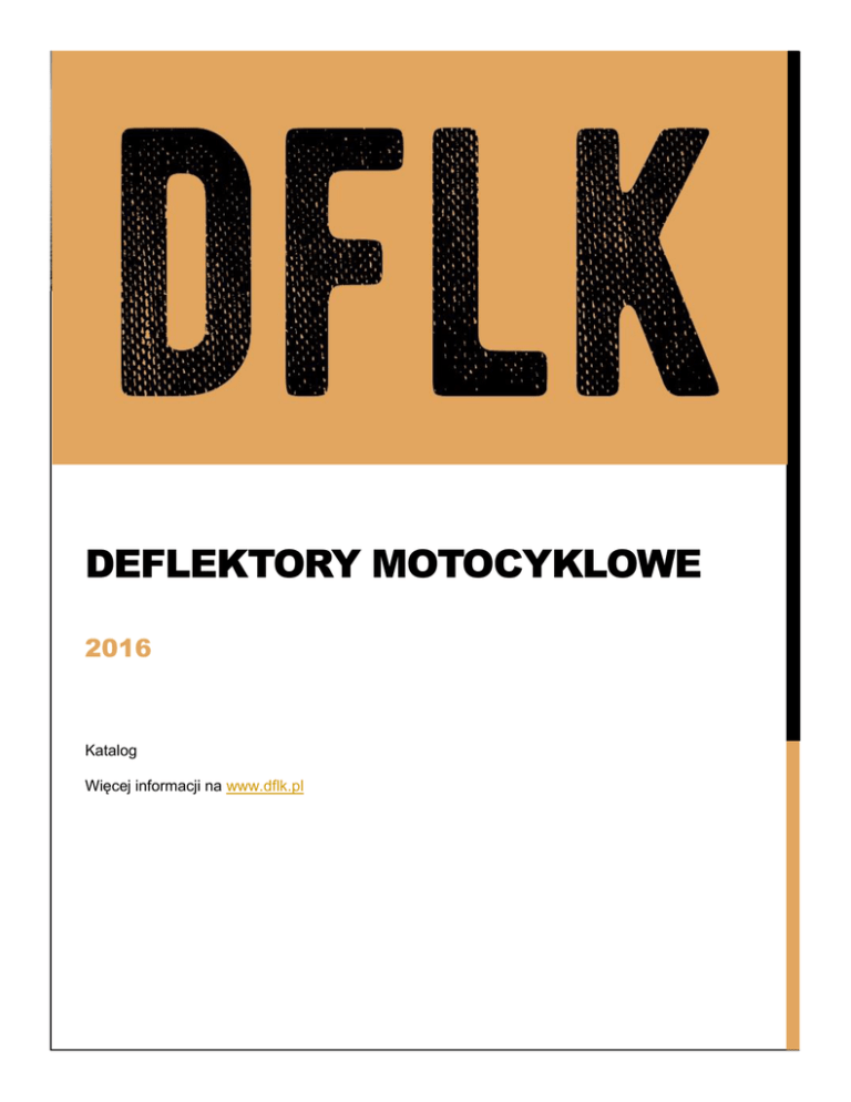DEFLEKTORY MOTOCYKLOWE 2016 Katalog Więcej informacji na www.dflk.pl DEFLEKTORY MOTOCYKLOWE 2016 Budujemy markę nowoczesnych i niezawodnych akcesoriów motocyklowych. Produkowane przez nas deflektory motocyklowe zostały zaprojektowane z myślą o jak najwydajniejszym osłonięciu kierującego pojazdem przed podmuchami wiatru czy deszczem. Przyświecał nam pomysł stworzenia niezawodnych deflektorów pasujących do każdego motocykla 1 Cechy produktu Uniwersalny Kształt, możliwość regulacji w dwóch płaszczyznach i dowolność ugięcia materiału szyby pozwala na zastosowanie deflektora w wielu motocyklach i skuterach Wytrzymały Szyba deflektora wykonana jest z odpornego na pęknięcia poliwęglanu, co oprócz doskonałych właściwości wytrzymałościowych zapobiega uszkodzeniu deflektora zagrażającego motocykliście. Dodatkowo aluminiowe uchwyty bardzo dobrze mocują konstrukcję na szybie motocykla. Odporny na warunki atmosferyczne Produkcja uchwytów ze stopu aluminium typu 5754 i elementów złącznych ze stali nierdzewnej zapobiega korozji. 2 Deflektory są dostępne w czterech wariantach Wariant 1, High Cechuje się wysoką i szeroką szybą. Zastosowanie w motocyklach turystycznych, w których jest istotna bardzo dobra ochrona przed wiatrem. Wariant 2, Low Niska i szeroka szyba. Zastosowanie w motocyklach turystycznych, gdy potrzeba jest jedynie niewielka poprawa aerodynamiki oryginalnej szyby. 3 Wariant 3, Optimal Zastosowanie w motocyklach, w których poszukiwane jest zoptymalizowanie ochrony przed powiewami wiatru i możliwie jak najniższy opór powietrza. Wariant 4, Enduro Najwyższa szyba, idealna do motocykli enduro i cross. 4 Parametry techniczne deflektorów Wartość 220 – 270 gram 100% Poliwęglan z ochroną UV Aluminium 5754 Stal nierdzewna A2 40° 10 mm Parametr Masa Materiał szyby Materiał uchwytów Materiał elementów złącznych Regulacja pochylenia Regulacja wysokości Zachęcamy do kontaktu Witryna: www.dflk.pl E-mail: [email protected] 5