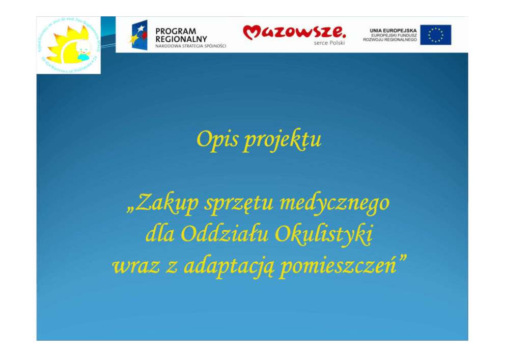 Opis projektu „Zakup sprzę sprzętu medycznego dla Oddział Oddziału Okulistyki wraz z adaptacją adaptacją pomieszczeń pomieszczeń” Szpital Dziecięcy im. prof. dr. med. Jana Bogdanowicza Samodzielny Publiczny Zakład Opieki Zdrowotnej, z siedzibą przy ul. Niekłańskiej 4/24 w Warszawie realizował w latach 2014-2015 projekt współfinansowany przez Unię Europejską ze środków Europejskiego Funduszu Rozwoju Regionalnego w ramach Regionalnego Programu Operacyjnego Województwa Mazowieckiego 2007-2013 oraz ze środków budżetu państwa pod nazwą: „Zakup sprzętu medycznego dla Oddziału Okulistyki wraz z adaptacją pomieszczeń”. Aparat do elektrofizjologii Całkowita wartość projektu: 991 913,20 PLN Kwota dofinansowania z EFRR: 842 969,39 PLN Kwota dofinansowania z budżetu państwa: 138 842,02 PLN W TRAKCIE REALIZACJI PROJEKTU ZAKUPILIŚMY 1. Fakoemulsyfikator z witrektomią tylną. 2. Aparat do elektrofizjologii. 3. Funduskamerę. 4. Laser do zabiegów na siatkówce oka. 5. Autorefraktometr ręczny. 6. Ręczną lampę szczelinową. 7. Panel optotypów z polaryzacją. 8. Diopromierz. 9. Wziernik pośredni z wyposażeniem. 10. Tonometr ręczny aplanacyjny. CEL PROJEKTU Celem głównym projektu jest poprawa dostępności i jakości opieki zdrowotnej ludności, w szczególności dzieci z obszaru Mazowsza. Istotnym elementem zwiększenia bezpieczeństwa zdrowotnego i poprawy warunków rozwoju ludności jest poprawa infrastruktury ochrony zdrowia, standardów wyposażenia w sprzęt medyczny oraz zwiększenia skuteczności działań w stanach zagrożenia zdrowotnego. Realizacja projektu ma służyć leczeniu dzieci z województwa mazowieckiego w przypadkach zagrożenia dla zdrowia. Podstawowym rezultatem będzie zwiększenie zakresu specjalistycznych badań okulistycznych w zakresie chorób takich jak: odwarstwianie siatkówki, niedrożności naczyń siatkówki, otwory siatkówki (w tym otwór w plamce), błony przed i posiatkówkowe, krwotoki podsiatkówkowe, niektóre zmiany powstające w następstwie zwyrodnienia siatkówki związanego z wiekiem, urazy gałki ocznej przenikające oraz stany pourazowe oka, także z obecnością ciała obcego we wnętrzu oka, powikłania wcześniej wykonanych zabiegów na oku: stany zapalne, krwotoki, jaskra następowa i inne zmiany atologiczne w ciele szklistym: stany zapalne i pozapalne doprowadzające do znacznego pogorszenia widzenia. Funduskamera