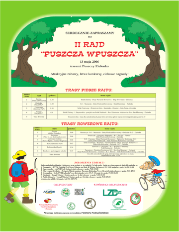 SERDECZNIE ZAPRASZAMY na II RAJD “PUSZCZA WPUSZCZA” 13 maja 2006 trasami Puszczy Zielonka Atrakcyjne zabawy, łatwe konkursy, ciekawe nagrody! TRASY PIESZE RAJDU: numer trasy start 1 Tuczno (Pętla autobusowa) 8.30 Szlak Zielony - Duży Pierścień Rowerowy - Słup Drewniany - Zielonka 2 Owińska (Stacja PKP) 8.30 R-1 - Maruszka - Duży Pierścień Rowerowy - Słup Drewniany - Zielonka 3 Czerwonak (Dworzec PKP) 8.30 Szlak Czerwony - Dziewicza Góra - Kamińsko - Okoniec - Huta Pusta - Zielonka 4 Promno (Stacja PKP) 830 Szlak Zielony - J. Stęszewskie - przejście na Szlak Niebieski - Rez. Klasztorne Modrzewie - Rez. Las Mieszany - Zielonka 5 Trasa dowolna trasa rajdu godzina Trasa dowolna - trasa dla samodzielnych grup, które powinny zgłosić się na mecie najpóźniej do godz.12.30 TRASY ROWEROWE RAJDU: numer trasy 1 2 3 start Poznań (Malta Źródełko) Swarzędz (Pętla S1, os. Kościuszkowców) Murowana Goślina (Nowy Rynek, Zielone Wzgórza) 9.00 Gruszczyn - R-1 - Maruszka - Duży Pierścień Rowerowy.- Gwiazda - R-3 - Zielonka 9.00 Gruszczyk - Uzarzewo -Biskupice - R-2 - Tuczno - Pławno Mały Pierścień Rowerowy - Zielonka R-2 - Czernice - Duży Pierścień Rowerowy - Dąbrówka Kościelna - R-4 Leśniczówka Głęboczek - Mały Pierścień Rowerowy - Zielonka Szlak Czerwony - Rejowiec - Niedźwiedziny - Duży Pierścień Rowerowy Dąbrówka Kościelna - Gwiazda - R-3 - Zielonka Eurovelo 2 - Węglowo - R-3 - Krześlice - Bednary Trakt Bednarski - Zielonka Turostowo - Pierścień Powiatowy R-3 - Rez. Las Mieszany - Gwiazda Duży Pierścień Rowerowy - Czernice - R-2 - Pławno - Mały Pierścień Rowerowy - Zielonka trasa dla samodzielnych grup, które powinny zgłosić się na mecie najpóźniej do godz. 12.30 9.00 Skoki (dworzec PKP) 9.45 5 Pobiedziska (Rynek) 9.30 6 Kiszkowo (parking przy szkole) 9.30 7 Trasa dowolna 4 trasa rajdu godzina ZGŁOSZENIA UDZIAŁU: Zgłoszenia indywidualne i zbiorowe oraz wpłaty w wysokości 5 zł od osoby będą przyjmowane do dnia 10 maja br. w: 1. Poznaniu – PTTK Oddział P-ń Nowe Miasto, os. Boh. II Wojny Światowej 29, 9-10 maja br., godz. 16.30-18.00 2. Czerwonaku – AKWEN ul. Leśna 6, dni robocze w godz. 7.00-15.00 3. Murowanej Goślinie – Związek Międzygminny Puszcza Zielonka, Nowy Rynek 8, dni robocze w godz. 9.00-15.00 4. Swarzędzu – Koło PTTK „Łaziki”, os. Kościuszkowców 39, 9-10 maja br. godz. 17.00-18.00 5. Skokach – Urząd Miasta i Gminy, pok. nr 1, dni robocze w godz. 9.00-15.00 6. Pobiedziskach – Urząd Miasta i Gminy, pok. nr 44, dni robocze w godz. 9.00-15.00 informacje: [email protected], tel. 506 145 176 ORGANIZATORZY WSPÓ£PRACA ORGANIZACYJNA * * Impreza dofinansowana ze środków POWIATU POZNAŃSKIEGO