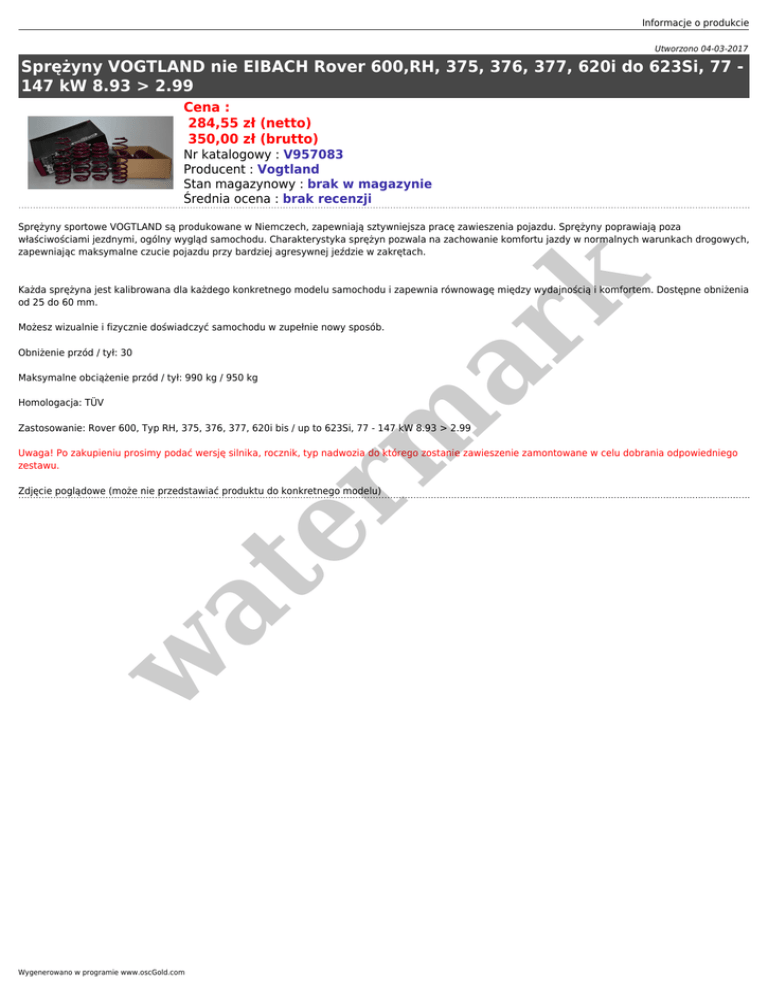 Informacje o produkcie Utworzono 04-03-2017 Sprężyny VOGTLAND nie EIBACH Rover 600,RH, 375, 376, 377, 620i do 623Si, 77 147 kW 8.93 > 2.99 Cena : 284,55 zł (netto) 350,00 zł (brutto) Nr katalogowy : V957083 Producent : Vogtland Stan magazynowy : brak w magazynie Średnia ocena : brak recenzji er m ar k Sprężyny sportowe VOGTLAND są produkowane w Niemczech, zapewniają sztywniejsza pracę zawieszenia pojazdu. Sprężyny poprawiają poza właściwościami jezdnymi, ogólny wygląd samochodu. Charakterystyka sprężyn pozwala na zachowanie komfortu jazdy w normalnych warunkach drogowych, zapewniając maksymalne czucie pojazdu przy bardziej agresywnej jeździe w zakrętach. Każda sprężyna jest kalibrowana dla każdego konkretnego modelu samochodu i zapewnia równowagę między wydajnością i komfortem. Dostępne obniżenia od 25 do 60 mm. Możesz wizualnie i fizycznie doświadczyć samochodu w zupełnie nowy sposób. Obniżenie przód / tył: 30 Maksymalne obciążenie przód / tył: 990 kg / 950 kg Homologacja: TÜV Zastosowanie: Rover 600, Typ RH, 375, 376, 377, 620i bis / up to 623Si, 77 - 147 kW 8.93 > 2.99 Uwaga! Po zakupieniu prosimy podać wersję silnika, rocznik, typ nadwozia do którego zostanie zawieszenie zamontowane w celu dobrania odpowiedniego zestawu. w at Zdjęcie poglądowe (może nie przedstawiać produktu do konkretnego modelu) Wygenerowano w programie www.oscGold.com