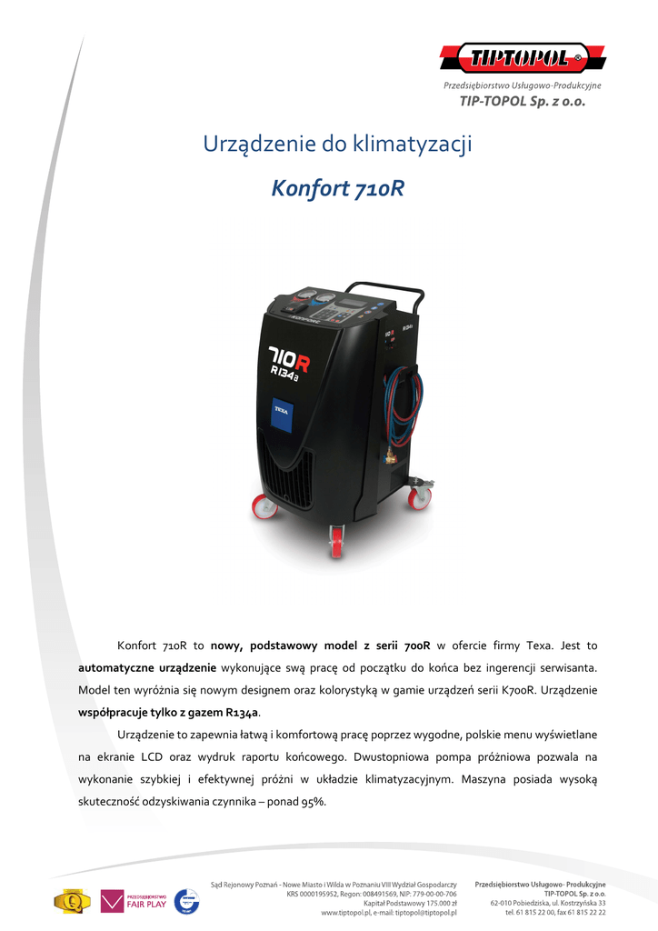 Urządzenie do klimatyzacji Konfort 710R Konfort 710R to nowy, podstawowy model z serii 700R w ofercie firmy Texa. Jest to automatyczne urządzenie wykonujące swą pracę od początku do końca bez ingerencji serwisanta. Model ten wyróżnia się nowym designem oraz kolorystyką w gamie urządzeń serii K700R. Urządzenie współpracuje tylko z gazem R134a. Urządzenie to zapewnia łatwą i komfortową pracę poprzez wygodne, polskie menu wyświetlane na ekranie LCD oraz wydruk raportu końcowego. Dwustopniowa pompa próżniowa pozwala na wykonanie szybkiej i efektywnej próżni w układzie klimatyzacyjnym. Maszyna posiada wysoką skuteczność odzyskiwania czynnika – ponad 95%. Dane techniczne Chłodziwo R134a Wyświetlacz LCD, 80 znaków Butla na czynnik 10 kg, podgrzewana Pompa próżniowa Dwufazowa, przepustowość 100l/min Wtrysk oleju, barwnika UV Sterowane czasowo Zawory Sterowane ręcznie Przewody węże, dł. 3m SAE J2196 Wymiary 1053 x 606 x 706 Waga 89 kg Funkcje ogólne • Baza danych: auta osobowe, dostawcze, ciężarowe oraz maszyny rolnicze, • Dwa typy obsługi: automatyczny z bazy danych pojazdów oraz programowalny przez obsługującego, • Możliwość wyboru pojedynczych funkcji tj. odsysanie gazu, próżnia, wtrysk, napełnianie, • Wydruk raportów, • Automatyczne napełnianie układu, • Test szczelności, • Automatyczny wtrysk oleju/UV – dysza czasowa, • Możliwość aktualizacji bazy danych (za dopłatą), • Możliwość dopisywania własnych pojazdów. Wyposażenie standardowe • Drukarka termiczna, • Baner reklamowy, • 6kg gazu R134a, 240 ml oleju, 100 ml barwnika UV. Strona 2/4 Wyposażenie dodatkowe Nr katalogowy Opis TXACKF01 Zestaw do przepłukiwania klimatyzacji TX74350900 Zdjęcie Zestaw przewodów przedłużających 3m do urządzeń Konfort Zalety maszyny Baza danych Największa na rynku baza danych zawierająca takie pojazdy jak: - auta osobowe, - auta dostawcze, - pojazdy ciężarowe, - maszyny rolnicze. Regularnie uzupełniana (za dopłatą) przez producenta stanowi solidną pozycję wyposażenia maszyny. Bardzo dobre parametry techniczne Na tle konkurencji urządzenie oferuje bardzo dobre parametry oraz wyposażenie techniczne: - dwustopniowa pompa próżniowa, - odzysk gazu powyżej 95%, - pas podgrzewający butlę, który ułatwia obsługę pojazdów w niskich temperaturach, Drukarka termiczna Pozwala raportować każdą czynność wykonaną przez urządzenie. Strona 3/4 Możliwość przedłużenia przewodów obsługowych o 3m Opcja szczególnie pomocna przy obsłudze maszyn rolniczych gdzie złącza serwisowe umieszczone są wysoko. Łatwość obsługi Duży wyświetlacz oraz polskie komunikaty pozwalają na łatwiejsze posługiwanie się menu. Rozbudowane menu Możliwość ustawiania wielu parametrów ręcznie, dopisywanie pojazdów oraz inne funkcje czynią pracę bardziej profesjonalną. Pozwala to mechanikowi w profesjonalny sposób wpływać na pracę urządzenia. 2-letnia gwarancja Producent otacza maszyną 2-letnią gwarancją, liczoną od momentu uruchomienia urządzenia. Strona 4/4