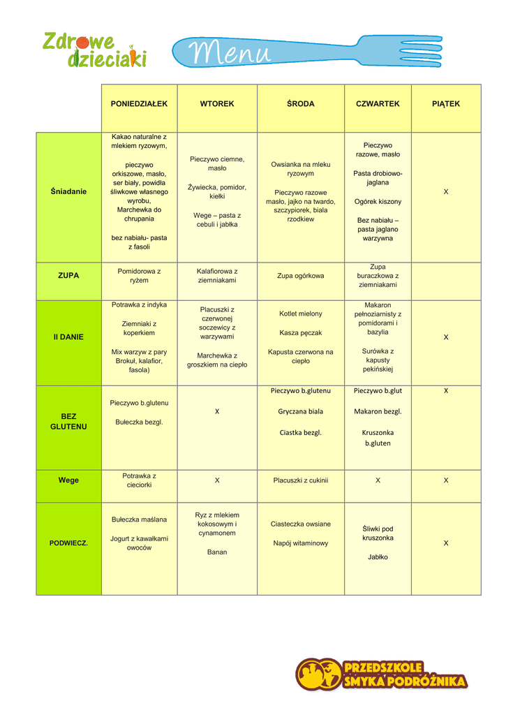 PONIEDZIAŁEK WTOREK ŚRODA Kakao naturalne z mlekiem ryzowym, Śniadanie pieczywo orkiszowe, masło, ser biały, powidła śliwkowe własnego wyrobu, Marchewka do chrupania Pieczywo ciemne, masło Żywiecka, pomidor, kiełki Wege – pasta z cebuli i jabłka Pomidorowa z ryżem Potrawka z indyka II DANIE Ziemniaki z koperkiem Mix warzyw z pary Brokuł, kalafior, fasola) Kalafiorowa z ziemniakami Placuszki z czerwonej soczewicy z warzywami Owsianka na mleku ryzowym Pieczywo razowe masło, jajko na twardo, szczypiorek, biala rzodkiew Zupa ogórkowa Kotlet mielony Kasza pęczak Pasta drobiowojaglana X Ogórek kiszony Bez nabiału – pasta jaglano warzywna Zupa buraczkowa z ziemniakami Makaron pełnoziarnisty z pomidorami i bazylia Kapusta czerwona na ciepło Surówka z kapusty pekińskiej Pieczywo b.glutenu Pieczywo b.glut Gryczana biala Makaron bezgl. Ciastka bezgl. Kruszonka b.gluten X Placuszki z cukinii X Ryz z mlekiem kokosowym i cynamonem Ciasteczka owsiane Marchewka z groszkiem na ciepło PIĄTEK Pieczywo razowe, masło bez nabiału- pasta z fasoli ZUPA CZWARTEK X X Pieczywo b.glutenu X BEZ GLUTENU Bułeczka bezgl. Wege Potrawka z cieciorki Bułeczka maślana PODWIECZ. Jogurt z kawałkami owoców Napój witaminowy Banan Śliwki pod kruszonka Jabłko X X
