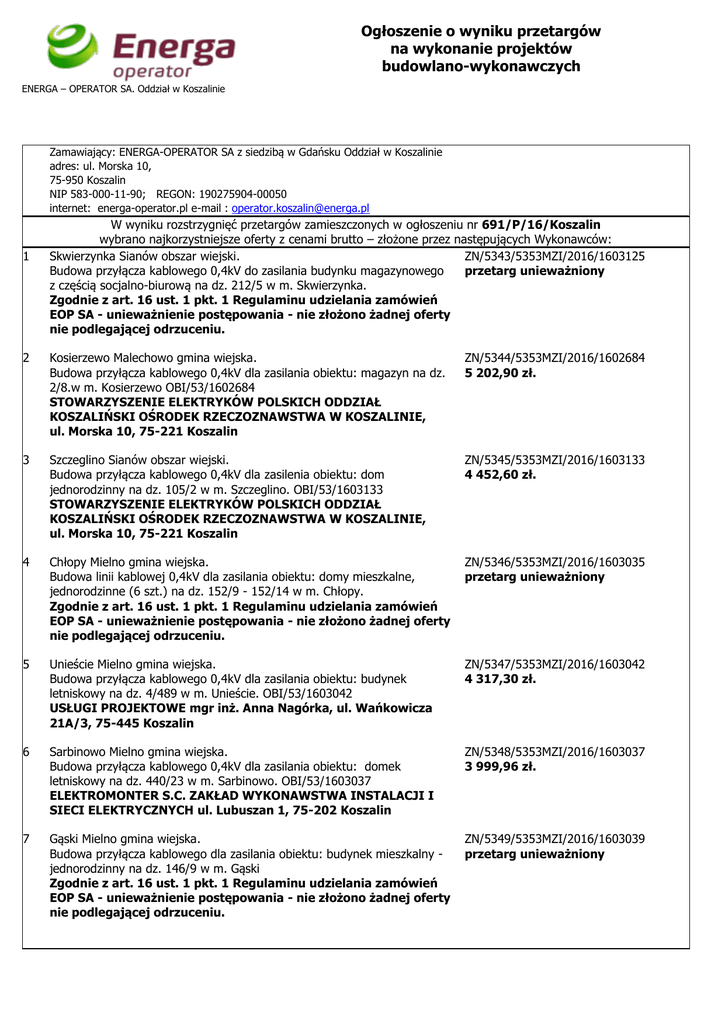 Ogłoszenie o wyniku przetargów na wykonanie projektów budowlano-wykonawczych ENERGA – OPERATOR SA. Oddział w Koszalinie Zamawiający: ENERGA-OPERATOR SA z siedzibą w Gdańsku Oddział w Koszalinie adres: ul. Morska 10, 75-950 Koszalin NIP 583-000-11-90; REGON: 190275904-00050 internet: energa-operator.pl e-mail : [email protected] 1 W wyniku rozstrzygnięć przetargów zamieszczonych w ogłoszeniu nr 691/P/16/Koszalin wybrano najkorzystniejsze oferty z cenami brutto – złożone przez następujących Wykonawców: Skwierzynka Sianów obszar wiejski. ZN/5343/5353MZI/2016/1603125 Budowa przyłącza kablowego 0,4kV do zasilania budynku magazynowego przetarg unieważniony z częścią socjalno-biurową na dz. 212/5 w m. Skwierzynka. Zgodnie z art. 16 ust. 1 pkt. 1 Regulaminu udzielania zamówień EOP SA - unieważnienie postępowania - nie złożono żadnej oferty nie podlegającej odrzuceniu. 2 Kosierzewo Malechowo gmina wiejska. Budowa przyłącza kablowego 0,4kV dla zasilania obiektu: magazyn na dz. 2/8.w m. Kosierzewo OBI/53/1602684 STOWARZYSZENIE ELEKTRYKÓW POLSKICH ODDZIAŁ KOSZALIŃSKI OŚRODEK RZECZOZNAWSTWA W KOSZALINIE, ul. Morska 10, 75-221 Koszalin ZN/5344/5353MZI/2016/1602684 5 202,90 zł. 3 Szczeglino Sianów obszar wiejski. Budowa przyłącza kablowego 0,4kV dla zasilenia obiektu: dom jednorodzinny na dz. 105/2 w m. Szczeglino. OBI/53/1603133 STOWARZYSZENIE ELEKTRYKÓW POLSKICH ODDZIAŁ KOSZALIŃSKI OŚRODEK RZECZOZNAWSTWA W KOSZALINIE, ul. Morska 10, 75-221 Koszalin ZN/5345/5353MZI/2016/1603133 4 452,60 zł. 4 Chłopy Mielno gmina wiejska. Budowa linii kablowej 0,4kV dla zasilania obiektu: domy mieszkalne, jednorodzinne (6 szt.) na dz. 152/9 - 152/14 w m. Chłopy. Zgodnie z art. 16 ust. 1 pkt. 1 Regulaminu udzielania zamówień EOP SA - unieważnienie postępowania - nie złożono żadnej oferty nie podlegającej odrzuceniu. ZN/5346/5353MZI/2016/1603035 przetarg unieważniony 5 Unieście Mielno gmina wiejska. Budowa przyłącza kablowego 0,4kV dla zasilania obiektu: budynek letniskowy na dz. 4/489 w m. Unieście. OBI/53/1603042 USŁUGI PROJEKTOWE mgr inż. Anna Nagórka, ul. Wańkowicza 21A/3, 75-445 Koszalin ZN/5347/5353MZI/2016/1603042 4 317,30 zł. 6 Sarbinowo Mielno gmina wiejska. Budowa przyłącza kablowego 0,4kV dla zasilania obiektu: domek letniskowy na dz. 440/23 w m. Sarbinowo. OBI/53/1603037 ELEKTROMONTER S.C. ZAKŁAD WYKONAWSTWA INSTALACJI I SIECI ELEKTRYCZNYCH ul. Lubuszan 1, 75-202 Koszalin ZN/5348/5353MZI/2016/1603037 3 999,96 zł. 7 Gąski Mielno gmina wiejska. Budowa przyłącza kablowego dla zasilania obiektu: budynek mieszkalny jednorodzinny na dz. 146/9 w m. Gąski Zgodnie z art. 16 ust. 1 pkt. 1 Regulaminu udzielania zamówień EOP SA - unieważnienie postępowania - nie złożono żadnej oferty nie podlegającej odrzuceniu. ZN/5349/5353MZI/2016/1603039 przetarg unieważniony Ogłoszenie o wyniku przetargów na wykonanie projektów budowlano-wykonawczych ENERGA – OPERATOR SA. Oddział w Koszalinie 8 Sarbinowo Mielno gmina wiejska. Budowa przyłącza kablowego dla zasilania obiektu: dom jednorodzinny na dz. 123/9 w m. Sarbinowo. Zgodnie z art. 16 ust. 1 pkt. 1 Regulaminu udzielania zamówień EOP SA - unieważnienie postępowania - nie złożono żadnej oferty nie podlegającej odrzuceniu. ZN/5350/5353MZI/2016/1603041 przetarg unieważniony 9 Sarbinowo Mielno gmina wiejska nr dział.: 440/10 Budowa przyłącza kablowego dla zasilania obiektu: budynek mieszkalny, jednorodzinny na dz. 440/10 w m. Sarbinowo. OBI/53/1603043 ELEKTROMONTER S.C. ZAKŁAD WYKONAWSTWA INSTALACJI I SIECI ELEKTRYCZNYCH, ul. Lubuszan 1, 75-202 Koszalin ZN/5351/5353MZI/2016/1603043 4 499,34 zł. 10 Chłopy Mielno gmina wiejska. Budowa przyłącza kablowego dla zasilania obiektu: budynek usługowy na dz. 187/9 w m. Chłopy. Zgodnie z art. 16 ust. 1 pkt. 1 Regulaminu udzielania zamówień EOP SA - unieważnienie postępowania - nie złożono żadnej oferty nie podlegającej odrzuceniu. ZN/5352/5353MZI/2016/1603044 przetarg unieważniony Sporządziła: Ewelina Przewoźna Koszalin, dnia 21-12-2016