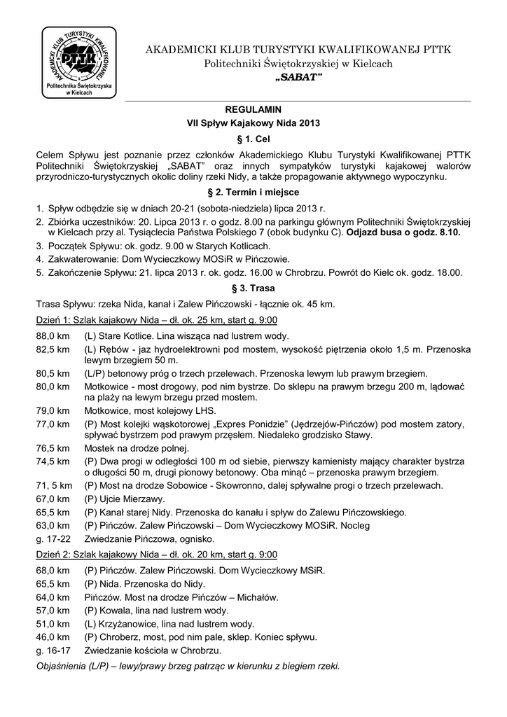 AKADEMICKI KLUB TURYSTYKI KWALIFIKOWANEJ PTTK Politechniki Świętokrzyskiej w Kielcach „SABAT” REGULAMIN VII Spływ Kajakowy Nida 2013 § 1. Cel Celem Spływu jest poznanie przez członków Akademickiego Klubu Turystyki Kwalifikowanej PTTK Politechniki Świętokrzyskiej „SABAT” oraz innych sympatyków turystyki kajakowej walorów przyrodniczo-turystycznych okolic doliny rzeki Nidy, a także propagowanie aktywnego wypoczynku. § 2. Termin i miejsce 1. Spływ odbędzie się w dniach 20-21 (sobota-niedziela) lipca 2013 r. 2. Zbiórka uczestników: 20. Lipca 2013 r. o godz. 8.00 na parkingu głównym Politechniki Świętokrzyskiej w Kielcach przy al. Tysiąclecia Państwa Polskiego 7 (obok budynku C). Odjazd busa o godz. 8.10. 3. Początek Spływu: ok. godz. 9.00 w Starych Kotlicach. 4. Zakwaterowanie: Dom Wycieczkowy MOSiR w Pińczowie. 5. Zakończenie Spływu: 21. lipca 2013 r. ok. godz. 16.00 w Chrobrzu. Powrót do Kielc ok. godz. 18.00. § 3. Trasa Trasa Spływu: rzeka Nida, kanał i Zalew Pińczowski - łącznie ok. 45 km. Dzień 1: Szlak kajakowy Nida – dł. ok. 25 km, start g. 9:00 88,0 km 82,5 km 80,5 km 80,0 km 79,0 km 77,0 km 76,5 km 74,5 km 71, 5 km 67,0 km 65,5 km 63,0 km g. 17-22 (L) Stare Kotlice. Lina wisząca nad lustrem wody. (L) Rębów - jaz hydroelektrowni pod mostem, wysokość piętrzenia około 1,5 m. Przenoska lewym brzegiem 50 m. (L/P) betonowy próg o trzech przelewach. Przenoska lewym lub prawym brzegiem. Motkowice - most drogowy, pod nim bystrze. Do sklepu na prawym brzegu 200 m, lądować na plaży na lewym brzegu przed mostem. Motkowice, most kolejowy LHS. (P) Most kolejki wąskotorowej „Expres Ponidzie” (Jędrzejów-Pińczów) pod mostem zatory, spływać bystrzem pod prawym przęsłem. Niedaleko grodzisko Stawy. Mostek na drodze polnej. (P) Dwa progi w odległości 100 m od siebie, pierwszy kamienisty mający charakter bystrza o długości 50 m, drugi pionowy betonowy. Oba minąć – przenoska prawym brzegiem. (P) Most na drodze Sobowice - Skowronno, dalej spływalne progi o trzech przelewach. (P) Ujcie Mierzawy. (P) Kanał starej Nidy. Przenoska do kanału i spływ do Zalewu Pińczowskiego. (P) Pińczów. Zalew Pińczowski – Dom Wycieczkowy MOSiR. Nocleg Zwiedzanie Pińczowa, ognisko. Dzień 2: Szlak kajakowy Nida – dł. ok. 20 km, start g. 9:00 68,0 km 65,5 km 64,0 km 57,0 km 51,0 km 46,0 km g. 16-17 (P) Pińczów. Zalew Pińczowski. Dom Wycieczkowy MSiR. (P) Nida. Przenoska do Nidy. Pińczów. Most na drodze Pińczów – Michałów. (P) Kowala, lina nad lustrem wody. (L) Krzyżanowice, lina nad lustrem wody. (P) Chroberz, most, pod nim pale, sklep. Koniec spływu. Zwiedzanie kościoła w Chrobrzu. Objaśnienia (L/P) – lewy/prawy brzeg patrząc w kierunku z biegiem rzeki. § 4. Uczestnictwo 1. Uczestnikiem Spływu mogą być członkowie i sympatycy AKTK PTTK Politechniki Świętokrzyskiej w Kielcach, którzy ukończyli 18 lat i posiadają dobry stan zdrowia, po wpłaceniu wpisowego. Osoby niepełnoletnie mogą uczestniczyć w Spływie po uprzednim złożeniu pisemnego oświadczenia podpisanego przez rodzica lub opiekuna prawnego. 2. Liczba miejsc: 24. Decyduje kolejność zapisów. 3. Zapisy odbywają się tylko wpłacie wpisowego w terminie do 30 czerwca 2013 r. Wpisowe jest bezzwrotne. 4. Wpisowe: 120 zł/os. – członkowie AKTK (z opłaconymi składkami), 135zł/os. - pozostali uczestnicy. 5. Organizator (w ramach wpisowego) zapewnia sprawny sprzęt pływający z wyposażeniem, miejsce noclegowe (z pościelą), ognisko (bez prowiantu), ubezpieczenie NNW oraz transport z miejsca zbiórki do miejsca startu i z miejsca zakończenia na miejsce zbiórki. § 5 Obowiązki uczestników 1. Posiadać odpowiedni ubiór i ekwipunek, w tym prowiant i zażywane leki. 2. Przestrzegać Karty Turysty, przepisów przeciwpożarowych oraz ochrony przyrody. 3. Przestrzegać zasad bezpieczeństwa poruszania się po wodzie, a w szczególności nosić kamizelkę ratunkową, zachowywać bezpieczną odległość pomiędzy kajakami oraz nie odłączać się od grupy. 4. Należycie dbać o powierzony sprzęt. Uczestnik odpowiada za szkody w sprzęcie [powstałe z winy umyślnej. 5. Stosować się do postanowień Organizatorów. § 6. Postanowienia końcowe 1. Impreza odbędzie się bez względu na warunki atmosferyczne. W razie wyjątkowo trudnych warunków atmosferycznych harmonogram dnia lub trasa mogą ulec zmianie. 2. Impreza nie ma charakteru zarobkowego. Uczestnicy pokrywają koszty organizacji, proporcjonalnie do liczby zapisanych osób. 3. Podczas imprezy obowiązuje zakaz spożywania alkoholu oraz innych środków odurzających. 4. Uczestnicy biorą udział w imprezie na własne ryzyko, a Organizatorzy nie ponoszą odpowiedzialności za zdarzenia losowe zaistniałe podczas imprezy, a także za mienie uczestników. § 7. Organizatorzy i kierownictwo 1. 2. Kierownik Spływu: Grzegorz Idkowiak – tel. 506 597 331. Obsługa organizacyjna i zapisy: Krzysztof Sabat – tel. 505 573 552. Prezes AKTK Krzysztof Sabat 2
