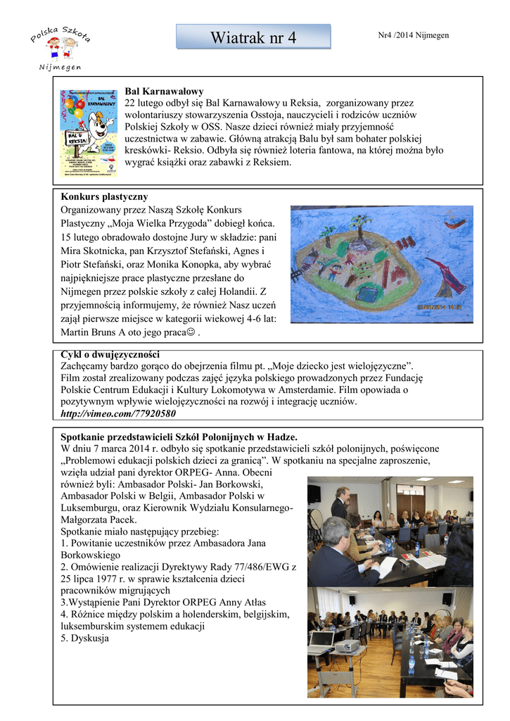 Wiatrak nr 4 Nr4 /2014 Nijmegen Bal Karnawałowy 22 lutego odbył się Bal Karnawałowy u Reksia, zorganizowany przez wolontariuszy stowarzyszenia Osstoja, nauczycieli i rodziców uczniów Polskiej Szkoły w OSS. Nasze dzieci również miały przyjemność uczestnictwa w zabawie. Główną atrakcją Balu był sam bohater polskiej kreskówki- Reksio. Odbyła się również loteria fantowa, na której można było wygrać książki oraz zabawki z Reksiem. Konkurs plastyczny Organizowany przez Naszą Szkołę Konkurs Plastyczny „Moja Wielka Przygoda” dobiegł końca. 15 lutego obradowało dostojne Jury w składzie: pani Mira Skotnicka, pan Krzysztof Stefański, Agnes i Piotr Stefański, oraz Monika Konopka, aby wybrać najpiękniejsze prace plastyczne przesłane do Nijmegen przez polskie szkoły z całej Holandii. Z przyjemnością informujemy, że również Nasz uczeń zajął pierwsze miejsce w kategorii wiekowej 4-6 lat: Martin Bruns A oto jego praca . Cykl o dwujęzyczności Zachęcamy bardzo gorąco do obejrzenia filmu pt. „Moje dziecko jest wielojęzyczne”. Film został zrealizowany podczas zajęć języka polskiego prowadzonych przez Fundację Polskie Centrum Edukacji i Kultury Lokomotywa w Amsterdamie. Film opowiada o pozytywnym wpływie wielojęzyczności na rozwój i integrację uczniów. http://vimeo.com/77920580 Spotkanie przedstawicieli Szkół Polonijnych w Hadze. W dniu 7 marca 2014 r. odbyło się spotkanie przedstawicieli szkół polonijnych, poświęcone „Problemowi edukacji polskich dzieci za granicą”. W spotkaniu na specjalne zaproszenie, wzięła udział pani dyrektor ORPEG- Anna. Obecni również byli: Ambasador Polski- Jan Borkowski, Ambasador Polski w Belgii, Ambasador Polski w Luksemburgu, oraz Kierownik Wydziału KonsularnegoMałgorzata Pacek. Spotkanie miało następujący przebieg: 1. Powitanie uczestników przez Ambasadora Jana Borkowskiego 2. Omówienie realizacji Dyrektywy Rady 77/486/EWG z 25 lipca 1977 r. w sprawie kształcenia dzieci pracowników migrujących 3.Wystąpienie Pani Dyrektor ORPEG Anny Atłas 4. Różnice między polskim a holenderskim, belgijskim, luksemburskim systemem edukacji 5. Dyskusja Wiatrak nr 4 Nr4 /2014 Nijmegen Dyskusja miała bardzo ciekawy przebieg. Udało nam się wiele dowiedzieć o funkcjonowaniu innych polonijnych szkół w Holandii, oraz o tym jak inni nauczyciele radzą sobie z nauką dzieci języka polskiego. Dowiedziałyśmy się również o różnych projektach, i pomocach dydaktycznych oferowanych przez ORPEG. A co najważniejsze, dosyć dogłębnie omówiliśmy temat edukacji polskich dzieci za granicą. Kartka z kalendarza: KWIECIEŃ 1 kwietnia 2 kwietnia 12 kwietnia 12/13 kwietnia 20 kwietnia 21 kwietnia Prima Aprilis Międzynarodowy Dzień Książki dla Dzieci Zajęcia szkolne z Jajeczkiem Polska Wiosna Filmowa - Utrecht Wielkanoc Poniedziałek Wielkanocny Szkolna Biblioteka Miło nam poinformować, że Nasza Szkolna Biblioteka poszerzyła swoje zasoby o nowe pozycje książkowe dla Naszych najmłodszych Pociech. Serdecznie zapraszamy do wypożyczania i czytania Dzieciom. Ciekawe zdjęcie: Mati w Disneylandzie!