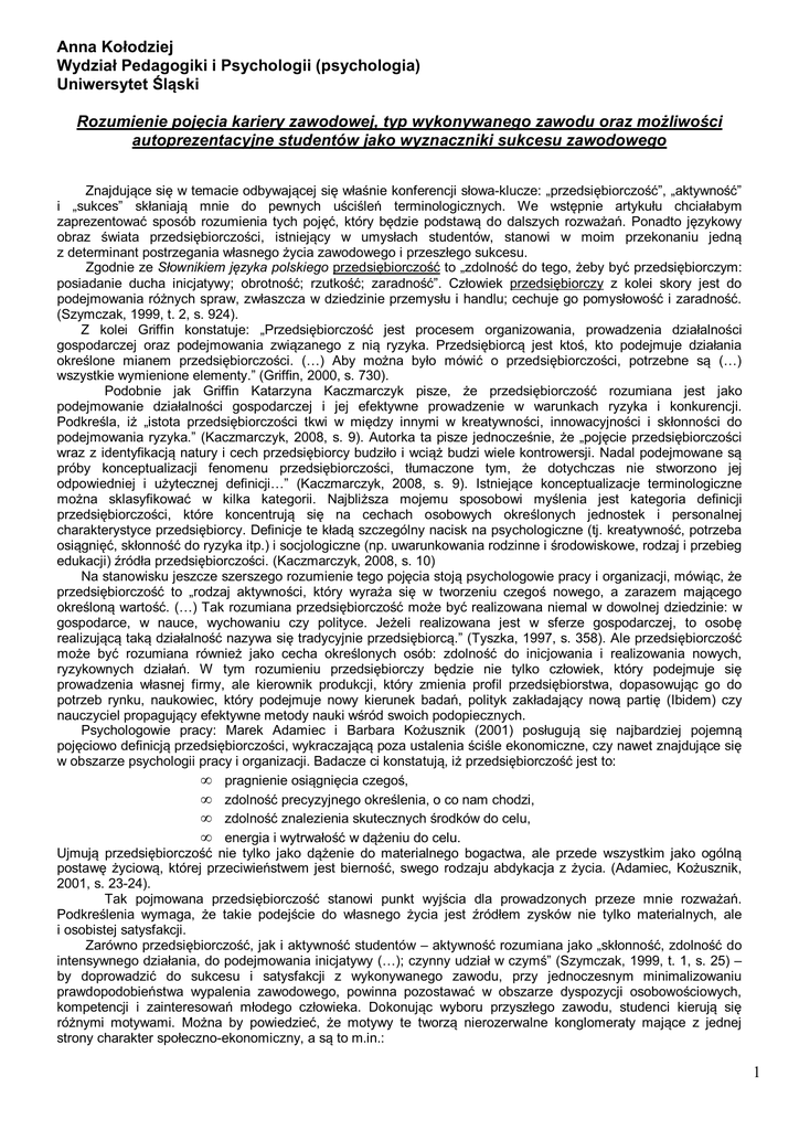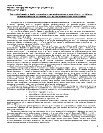Anna Kołodziej Wydział Pedagogiki i Psychologii (psychologia) Uniwersytet Śląski Rozumienie pojęcia kariery zawodowej, typ wykonywanego zawodu oraz możliwości autoprezentacyjne studentów jako wyznaczniki sukcesu zawodowego Znajdujące się w temacie odbywającej się właśnie konferencji słowa-klucze: „przedsiębiorczość”, „aktywność” i „sukces” skłaniają mnie do pewnych uściśleń terminologicznych. We wstępnie artykułu chciałabym zaprezentować sposób rozumienia tych pojęć, który będzie podstawą do dalszych rozważań. Ponadto językowy obraz świata przedsiębiorczości, istniejący w umysłach studentów, stanowi w moim przekonaniu jedną z determinant postrzegania własnego życia zawodowego i przeszłego sukcesu. Zgodnie ze Słownikiem języka polskiego przedsiębiorczość to „zdolność do tego, żeby być przedsiębiorczym: posiadanie ducha inicjatywy; obrotność; rzutkość; zaradność”. Człowiek przedsiębiorczy z kolei skory jest do podejmowania różnych spraw, zwłaszcza w dziedzinie przemysłu i handlu; cechuje go pomysłowość i zaradność. (Szymczak, 1999, t. 2, s. 924). Z kolei Griffin konstatuje: „Przedsiębiorczość jest procesem organizowania, prowadzenia działalności gospodarczej oraz podejmowania związanego z nią ryzyka. Przedsiębiorcą jest ktoś, kto podejmuje działania określone mianem przedsiębiorczości. (…) Aby można było mówić o przedsiębiorczości, potrzebne są (…) wszystkie wymienione elementy.” (Griffin, 2000, s. 730). Podobnie jak Griffin Katarzyna Kaczmarczyk pisze, że przedsiębiorczość rozumiana jest jako podejmowanie działalności gospodarczej i jej efektywne prowadzenie w warunkach ryzyka i konkurencji. Podkreśla, iż „istota przedsiębiorczości tkwi w między innymi w kreatywności, innowacyjności i skłonności do podejmowania ryzyka.” (Kaczmarczyk, 2008, s. 9). Autorka ta pisze jednocześnie, że „pojęcie przedsiębiorczości wraz z identyfikacją natury i cech przedsiębiorcy budziło i wciąż budzi wiele kontrowersji. Nadal podejmowane są próby konceptualizacji fenomenu przedsiębiorczości, tłumaczone tym, że dotychczas nie stworzono jej odpowiedniej i użytecznej definicji…” (Kaczmarczyk, 2008, s. 9). Istniejące konceptualizacje terminologiczne można sklasyfikować w kilka kategorii. Najbliższa mojemu sposobowi myślenia jest kategoria definicji przedsiębiorczości, które koncentrują się na cechach osobowych określonych jednostek i personalnej charakterystyce przedsiębiorcy. Definicje te kładą szczególny nacisk na psychologiczne (tj. kreatywność, potrzeba osiągnięć, skłonność do ryzyka itp.) i socjologiczne (np. uwarunkowania rodzinne i środowiskowe, rodzaj i przebieg edukacji) źródła przedsiębiorczości. (Kaczmarczyk, 2008, s. 10) Na stanowisku jeszcze szerszego rozumienie tego pojęcia stoją psychologowie pracy i organizacji, mówiąc, że przedsiębiorczość to „rodzaj aktywności, który wyraża się w tworzeniu czegoś nowego, a zarazem mającego określoną wartość. (…) Tak rozumiana przedsiębiorczość może być realizowana niemal w dowolnej dziedzinie: w gospodarce, w nauce, wychowaniu czy polityce. Jeżeli realizowana jest w sferze gospodarczej, to osobę realizującą taką działalność nazywa się tradycyjnie przedsiębiorcą.” (Tyszka, 1997, s. 358). Ale przedsiębiorczość może być rozumiana również jako cecha określonych osób: zdolność do inicjowania i realizowania nowych, ryzykownych działań. W tym rozumieniu przedsiębiorczy będzie nie tylko człowiek, który podejmuje się prowadzenia własnej firmy, ale kierownik produkcji, który zmienia profil przedsiębiorstwa, dopasowując go do potrzeb rynku, naukowiec, który podejmuje nowy kierunek badań, polityk zakładający nową partię (Ibidem) czy nauczyciel propagujący efektywne metody nauki wśród swoich podopiecznych. Psychologowie pracy: Marek Adamiec i Barbara Kożusznik (2001) posługują się najbardziej pojemną pojęciowo definicją przedsiębiorczości, wykraczającą poza ustalenia ściśle ekonomiczne, czy nawet znajdujące się w obszarze psychologii pracy i organizacji. Badacze ci konstatują, iż przedsiębiorczość jest to: • pragnienie osiągnięcia czegoś, • zdolność precyzyjnego określenia, o co nam chodzi, • zdolność znalezienia skutecznych środków do celu, • energia i wytrwałość w dążeniu do celu. Ujmują przedsiębiorczość nie tylko jako dążenie do materialnego bogactwa, ale przede wszystkim jako ogólną postawę życiową, której przeciwieństwem jest bierność, swego rodzaju abdykacja z życia. (Adamiec, Kożusznik, 2001, s. 23-24). Tak pojmowana przedsiębiorczość stanowi punkt wyjścia dla prowadzonych przeze mnie rozważań. Podkreślenia wymaga, że takie podejście do własnego życia jest źródłem zysków nie tylko materialnych, ale i osobistej satysfakcji. Zarówno przedsiębiorczość, jak i aktywność studentów – aktywność rozumiana jako „skłonność, zdolność do intensywnego działania, do podejmowania inicjatywy (…); czynny udział w czymś” (Szymczak, 1999, t. 1, s. 25) – by doprowadzić do sukcesu i satysfakcji z wykonywanego zawodu, przy jednoczesnym minimalizowaniu prawdopodobieństwa wypalenia zawodowego, powinna pozostawać w obszarze dyspozycji osobowościowych, kompetencji i zainteresowań młodego człowieka. Dokonując wyboru przyszłego zawodu, studenci kierują się różnymi motywami. Można by powiedzieć, że motywy te tworzą nierozerwalne konglomeraty mające z jednej strony charakter społeczno-ekonomiczny, a są to m.in.: 1 • • • • postrzeganie zawodu, szacunek uwarunkowany czasem i miejscem, oczekiwania wobec dochodów, relacja zaangażowanie – korzyść, Z drugiej strony mamy do czynienia z motywacją subiektywną, a zatem z: • przydatnością, • obrazem samego siebie, bowiem zawód jest częścią samoświadomości;