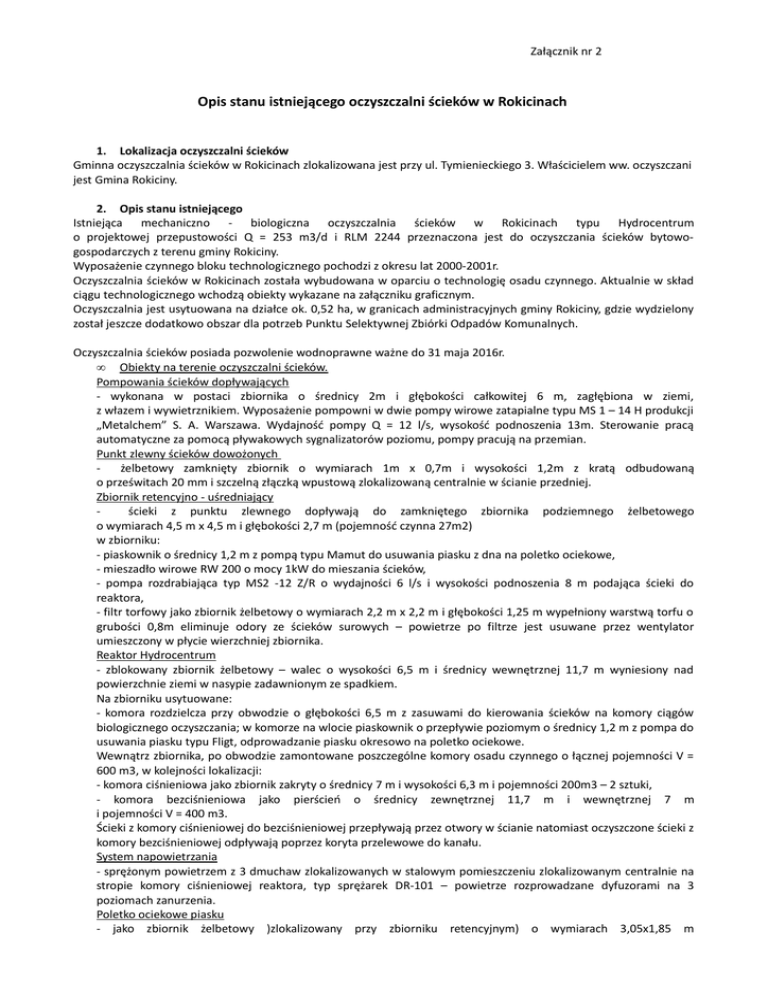 Załącznik nr 2 Opis stanu istniejącego oczyszczalni ścieków w Rokicinach 1. Lokalizacja oczyszczalni ścieków Gminna oczyszczalnia ścieków w Rokicinach zlokalizowana jest przy ul. Tymienieckiego 3. Właścicielem ww. oczyszczani jest Gmina Rokiciny. 2. Opis stanu istniejącego Istniejąca mechaniczno - biologiczna oczyszczalnia ścieków w Rokicinach typu Hydrocentrum o projektowej przepustowości Q = 253 m3/d i RLM 2244 przeznaczona jest do oczyszczania ścieków bytowogospodarczych z terenu gminy Rokiciny. Wyposażenie czynnego bloku technologicznego pochodzi z okresu lat 2000-2001r. Oczyszczalnia ścieków w Rokicinach została wybudowana w oparciu o technologię osadu czynnego. Aktualnie w skład ciągu technologicznego wchodzą obiekty wykazane na załączniku graficznym. Oczyszczalnia jest usytuowana na działce ok. 0,52 ha, w granicach administracyjnych gminy Rokiciny, gdzie wydzielony został jeszcze dodatkowo obszar dla potrzeb Punktu Selektywnej Zbiórki Odpadów Komunalnych. Oczyszczalnia ścieków posiada pozwolenie wodnoprawne ważne do 31 maja 2016r. • Obiekty na terenie oczyszczalni ścieków. Pompowania ścieków dopływających - wykonana w postaci zbiornika o średnicy 2m i głębokości całkowitej 6 m, zagłębiona w ziemi, z włazem i wywietrznikiem. Wyposażenie pompowni w dwie pompy wirowe zatapialne typu MS 1 – 14 H produkcji „Metalchem” S. A. Warszawa. Wydajność pompy Q = 12 l/s, wysokość podnoszenia 13m. Sterowanie pracą automatyczne za pomocą pływakowych sygnalizatorów poziomu, pompy pracują na przemian. Punkt zlewny ścieków dowożonych żelbetowy zamknięty zbiornik o wymiarach 1m x 0,7m i wysokości 1,2m z kratą odbudowaną o prześwitach 20 mm i szczelną złączką wpustową zlokalizowaną centralnie w ścianie przedniej. Zbiornik retencyjno - uśredniający ścieki z punktu zlewnego dopływają do zamkniętego zbiornika podziemnego żelbetowego o wymiarach 4,5 m x 4,5 m i głębokości 2,7 m (pojemność czynna 27m2) w zbiorniku: - piaskownik o średnicy 1,2 m z pompą typu Mamut do usuwania piasku z dna na poletko ociekowe, - mieszadło wirowe RW 200 o mocy 1kW do mieszania ścieków, - pompa rozdrabiająca typ MS2 -12 Z/R o wydajności 6 l/s i wysokości podnoszenia 8 m podająca ścieki do reaktora, - filtr torfowy jako zbiornik żelbetowy o wymiarach 2,2 m x 2,2 m i głębokości 1,25 m wypełniony warstwą torfu o grubości 0,8m eliminuje odory ze ścieków surowych – powietrze po filtrze jest usuwane przez wentylator umieszczony w płycie wierzchniej zbiornika. Reaktor Hydrocentrum - zblokowany zbiornik żelbetowy – walec o wysokości 6,5 m i średnicy wewnętrznej 11,7 m wyniesiony nad powierzchnie ziemi w nasypie zadawnionym ze spadkiem. Na zbiorniku usytuowane: - komora rozdzielcza przy obwodzie o głębokości 6,5 m z zasuwami do kierowania ścieków na komory ciągów biologicznego oczyszczania; w komorze na wlocie piaskownik o przepływie poziomym o średnicy 1,2 m z pompa do usuwania piasku typu Fligt, odprowadzanie piasku okresowo na poletko ociekowe. Wewnątrz zbiornika, po obwodzie zamontowane poszczególne komory osadu czynnego o łącznej pojemności V = 600 m3, w kolejności lokalizacji: - komora ciśnieniowa jako zbiornik zakryty o średnicy 7 m i wysokości 6,3 m i pojemności 200m3 – 2 sztuki, - komora bezciśnieniowa jako pierścień o średnicy zewnętrznej 11,7 m i wewnętrznej 7 m i pojemności V = 400 m3. Ścieki z komory ciśnieniowej do bezciśnieniowej przepływają przez otwory w ścianie natomiast oczyszczone ścieki z komory bezciśnieniowej odpływają poprzez koryta przelewowe do kanału. System napowietrzania - sprężonym powietrzem z 3 dmuchaw zlokalizowanych w stalowym pomieszczeniu zlokalizowanym centralnie na stropie komory ciśnieniowej reaktora, typ sprężarek DR-101 – powietrze rozprowadzane dyfuzorami na 3 poziomach zanurzenia. Poletko ociekowe piasku - jako zbiornik żelbetowy )zlokalizowany przy zbiorniku retencyjnym) o wymiarach 3,05x1,85 m i głebokości 1,65 m, zgłebiony w ziemi przykryty blachą, na dnie warstwa filtracyjna żwirowa z sączkami o średnicy 100 mm zbierającymi odciek. Zbiornik osadu nadmiernego - jako zbiornik żelbetowy podziemny o wymiarach 4,5x4,5 m i głebokości 2,7 m przykryty blachami drewnianymi z pompą osadową Zenit Draga 100 T o wydajności 7,9 m3/h Urządzenie do wapnowania ścieków - zainstalowane w budynku technologicznym (razem z instalacją Draimad) składa się z dwuczęściowego zbiornika na wapno, ślimakowego podajnika wapna, pompy dawkującej mleko wapienne do komory rozdzielczej reaktora biologicznego. - obecnie nie funkcjonujące. Stacja odwadniania osadu Urządzenie 12 – workowe Draimad 12 BCAVPK zasadniczą część instalacji odwadniania osadu stanowi moduł ze stali nierdzewnej, w którym mocuje się worki z tkaniny filtracyjnej. Osad jest pompowany do otwartej komory rozdzielczej znajdującej się w górnej części modułu. Z komory rozdzielczej osad rozlewa się do odpowiednio zamocowanych worków, woda filtruje na zewnątrz, zaś części stale osadu pozostają wewnątrz worków. Filtracja jest wymuszana nadciśnieniem za pomocą sprężarki powietrza. Dla efektywniejszego odwadniania zastosowano dodawanie do rurociągu osadowego polielektrolitu poprawiającego sedymentację oraz neutralizującego przykre zapachy. Odcieki z odwadniania kierowane są do kanalizacji wewnętrznej oczyszczalni. Worki z odwodnionym osadem składowane są obok budynku na specjalnym wybetonowanym (niezadaszonym) składowisku. Instalacja przygotowania i dozowania flokulantu składa się z dozownika, zbiornika, mieszadła i pompy. Studzienka pomiarowa - zlokalizowana na kanale odpływowym ścieków oczyszczonych, w studzience zamontowano przepływomierz konduktometryczny PSK. Wylot ścieków - kolektor PCV o średnicy fi 250 odprowadzający grawitacyjnie ścieki oczyszczone z wylotem w skarpie rzeki, obetonowanym, oba brzegi rzeki oraz dno wzm