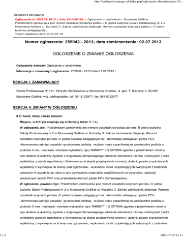 1z2 http://bzp0.portal.uzp.gov.pl/index.php?ogloszenie=show&pozycja=25... Ogłoszenie powiązane: Ogłoszenie nr 252908-2013 z dnia 2013-07-01 r. Ogłoszenie o zamówieniu - Murowana Goślina Przedmiotem zamówienia jest remont posadzek korytarza parteru i II pietra budynku Szkoły Podstawowej nr 2 w Murowanej Goślinie ul. Kutrzeby 3. Zakres zamówienia obejmuje: Remont posadzek korytarza parteru i II pietra budynku polegających... Termin składania ofert: 2013-07-19 Numer ogłoszenia: 255942 - 2013; data zamieszczenia: 02.07.2013 OGŁOSZENIE O ZMIANIE OGŁOSZENIA Ogłoszenie dotyczy: Ogłoszenia o zamówieniu. Informacje o zmienianym ogłoszeniu: 252908 - 2013 data 01.07.2013 r. SEKCJA I: ZAMAWIAJĄCY Szkoła Podstawowa Nr 2 im. Henryka Sienkiewicza w Murowanej Goślinie, ul. gen. T. Kutrzeby 3, 62-095 Murowana Goślina, woj. wielkopolskie, tel. 061 8122977, fax. 061 8122977. SEKCJA II: ZMIANY W OGŁOSZENIU II.1) Tekst, który należy zmienić: Miejsce, w którym znajduje się zmieniany tekst: II.1.4). W ogłoszeniu jest: Przedmiotem zamówienia jest remont posadzek korytarza parteru i II pietra budynku Szkoły Podstawowej nr 2 w Murowanej Goślinie ul. Kutrzeby 3. Zakres zamówienia obejmuje: Remont posadzek korytarza parteru i II pietra budynku polegających na: -demontażu istniejących płytek PCV, -klamrowaniu pęknięć posadzki -gruntowaniu podłoża, -wylaniu masy szpachlowej na powierzchni podłoża o grubości 5 cm, -dostawie i montażu wykładziny typu TARKETT I Q OPTIMA zgodnie z przedmiarem robót w tym ułożeniu wykładziny zgodnie z wytycznymi Zamawiającego odnośnie szerokości rulonów i kolorystyki ( kolor wykładziny zostanie uzgodniony z Wykonawcą na etapie podpisywania umowy), ułożeniu pasów przyściennych wykładziny z wywinięciu na ścianę oraz zgrzewaniu, -wykonaniu robót uzupełniających związanych z zadaniem opisanych w przedmiarze robot w tym wywiezieniu materiałów rozbiórkowych na wysypisko, utylizacji zniszczonych płytek PCV oraz przekazaniu dobrych płytek PCV Zamawiającemu.. W ogłoszeniu powinno być: Przedmiotem zamówienia jest remont posadzek korytarza parteru i II pietra budynku Szkoły Podstawowej nr 2 w Murowanej Goślinie ul. Kutrzeby 3. Zakres zamówienia obejmuje: Remont posadzek korytarza parteru i II pietra budynku polegających na: -demontażu istniejących płytek PCV, -klamrowaniu pęknięć posadzki -gruntowaniu podłoża, -wylaniu masy szpachlowej na powierzchni podłoża o grubości 5 mm, -dostawie i montażu wykładziny typu TARKETT I Q OPTIMA zgodnie z przedmiarem robót w tym ułożeniu wykładziny zgodnie z wytycznymi Zamawiającego odnośnie szerokości rulonów i kolorystyki ( kolor wykładziny zostanie uzgodniony z Wykonawcą na etapie podpisywania umowy), ułożeniu pasów przyściennych wykładziny z wywinięciu na ścianę oraz zgrzewaniu, -wykonaniu robót uzupełniających związanych z zadaniem 2013-07-02 13:51 2z2 http://bzp0.portal.uzp.gov.pl/index.php?ogloszenie=show&pozycja=25... opisanych w przedmiarze robot w tym wywiezieniu materiałów rozbiórkowych na wysypisko, utylizacji zniszczonych płytek PCV oraz przekazaniu dobrych płytek PCV Zamawiającemu.. 2013-07-02 13:51