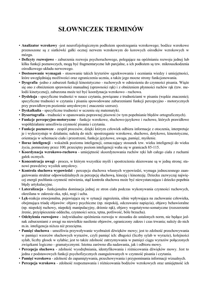 SŁOWNICZEK TERMINÓW • Analizator wzrokowy -jest neurofizjologicznym podłożem spostrzegania wzrokowego; bodźce wzrokowe przenoszone są z siatkówki gałki ocznej nerwem wzrokowym do korowych ośrodków wzrokowych w mózgu. • Deficyty rozwojowe - zaburzenia rozwoju psychoruchowego, polegające na opóźnianiu rozwoju jednej lub kilku funkcji poznawczych, mogą być fragmentaryczne lub parcjalne, a ich podłożem są tzw. mikrouszkodzenia ośrodkowego układu nerwowego. • Dostosowanie wymagań - stosowanie takich kryteriów egzekwowania i oceniania wiedzy i umiejętności, które uwzględniają możliwości oraz ograniczenia ucznia, a także jego mocne strony funkcjonowania. • Dysgrafia -jedno z zaburzeń funkcji kinestetyczno - ruchowych w odniesieniu do czynności pisania. Wiąże się ono z obniżeniem sprawności manualnej (sprawności rąk) i z obniżeniem płynności ruchów rąk (tzw. melodii kinetycznej), zaburzona może też być koordynacja wzrokowo - ruchowa. • Dysleksja - specyficzne trudności w nauce czytania, powiązane z trudnościami w pisaniu (wąskie znaczenie); specyficzne trudności w czytaniu i pisaniu spowodowane zaburzeniami funkcji percepcyjno - motorycznych przy prawidłowym poziomie umysłowym ( znaczenie szersze). • Dyskalkulia - specyficzne trudności w uczeniu się matematyki. • Dysortografia - trudności w opanowaniu poprawnej pisowni (w tym popełnianie błędów ortograficznych). • Funkcje percepcyjno-motoryczne - funkcje wzrokowe, słuchowo-językowe i ruchowe, których prawidłowe współdziałanie umożliwia czynność pisania i czytania. • Funkcje poznawcze - zespół procesów, dzięki którym człowiek odbiera informacje z otoczenia, interpretuje je i wykorzystuje w działaniu; należą do nich: spostrzeganie wzrokowe, słuchowe, dotykowe, kinestetyczne, orientacja w schemacie ciała i przestrzeni, funkcje językowe, uwaga, pamięć, myślenie. • Iloraz inteligencji - wskaźnik poziomu inteligencji, oznaczający stosunek tzw. wieku inteligencji do wieku życia, pomnożony przez 100; przeciętny poziom inteligencji waha się w granicach 85-115. • Koordynacja wzrokowo-ruchowa - umiejętność skoordynowania ruchów ręki lub całego ciała z ruchami gałek ocznych. • Koncentracja uwagi - proces, w którym wszystkie myśli i spostrzeżenia skierowane są w jedną stronę; stanowi prawdziwy wysiłek umysłowy. • Kontrola słuchowa wypowiedzi - percepcja słuchowa własnych wypowiedzi, wymaga jednoczesnego zaangażowania struktur odpowiedzialnych za percepcję słuchową, kinezję i kinestezję. Dziecku zazwyczaj najwięcej energii pochłania czynność mówienia, stąd kontrola słuchowa może być niewystarczająca i dziecko popełnia błędy artykulacyjne. • Lateralizacja - funkcjonalna dominacja jednej ze stron ciała podczas wykonywania czynności ruchowych, określana w zakresie oka, ręki, nogi i ucha. • Lęk-reakcja emocjonalna, pojawiająca się w sytuacji zagrożenia, silnie wpływająca na zachowanie człowieka, obejmująca triadę objawów: objawy psychiczne (np. niepokój, odczuwanie napięcia), objawy behawioralne (np. niepokój ruchowy, niepokój manipulacyjny, drżenie rąk), objawy wegetatywno-somatyczne (rozszerzenie źrenic, przyśpieszenie oddechu, czynności serca, tętna, potliwość, bóle brzucha). • Odchylenia rozwojowe - indywidualne opóźnienia rozwoju w stosunku do ustalonych norm, nie będące jednak zaburzeniami z uwagi na niewielkie nasilenie objawów, ograniczony zakres i czas trwania; należy do nich m.in. inteligencja niższa niż przeciętna. • Pamięć słuchowa - umożliwia przywoływanie wyobrażeń dźwięków mowy; jest to zdolność przechowywania w pamięci wzorców słuchowych wyrazów, czyli pamięć ich: długości (liczby sylab w wyrazie), kolejności sylab, liczby głosek w sylabie; jest to także zdolność zatrzymywania w pamięci ciągu wyrazów połączonych związkami logiczno - gramatycznymi. Istotna zarówno dla nadawania, jak i odbioru mowy. • Percepcja słuchowa - zdolność wyodrębniania, identyfikowania i różnicowania dźwięków mowy. Jest to jedna z podstawowych funkcji psychofizycznych zaangażowanych w czynność pisania i czytania. • Pamięć wzrokowa - zdolność do zapamiętywania, przechowywania i przypominania informacji wizualnych. • Percepcja wzrokowa - zdolność rozpoznawania i różnicowania bodźców wzrokowych oraz umiejętność ich • • • • • • • • • • interpretowania przez odniesienie do poprzednich doświadczeń, stanowi podstawę niemalże wszystkich działań człowieka. Słuch fizjologiczny (fizyczny) - zdolność odbioru, analizy i syntezy zjawisk akustycznych, zdolność słyszenia fal dźwiękowych o częstotliwości 16-50000 drgań na sekundę (częstotliwość drgań dla mowy 1008000 drgań na sekundę). Obniżenie słyszalności w pewnych zakresach powoduje niedokładność odbioru konkretnych dźwięków mowy (np. gorszą słyszalność częstotliwości powyżej 4000 drgań na sek. - trudności w różnicowaniu s:sz:ś; z:ż:ź; c:cz:ć) - zaburzenie powoduje niedosłuch, głuchotę. Słuch muzyczny -jedna z podstawowych zdolności muzycznych. Jest właściwością złożoną, w której można wyróżnić kilka odrębnych, nie zawsze zależnych od siebie jakości: słuch wysokościowy (melodyczny), harmoniczny (analityczny), rytmiczny, tembrowy (barwowy), dynamiczny. Słuch wysokościowy, czyli zdolność do rozróżniania wysokości dźwięków, może być relatywny (względny) lub absolutny. Posiadanie słuchu relatywnego pozwala na określenie wysokości dźwięku na podstawie rozpoznania interwału dzielącego go od dźwięku wzorcowego. Słuch absolutny rejestruje bezwzględną wysokość każdego dźwięku. Ten rodzaj słuchu ma około 5% ludzi. Jest on prawdopodobnie zdolnością wrodzoną i ujawnia się we wczesnym dzieciństwie. Słuch fonematyczny (fonologiczny) - umiejętność odróżniania 