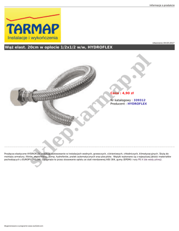 Informacje o produkcie Utworzono 04-03-2017 ap .p l Wąż elast. 20cm w oplocie 1/2x1/2 w/w, HYDROFLEX Nr katalogowy : 339312 Producent : HYDROFLEX le p .t a rm Cena : 4,90 zł sk Przyłącza elastyczne HYDROFLEX znajdują zastosowanie w instalacjach wodnych, grzewczych, ciśnieniowych, chłodniczych, klimatyzacyjnych. Służą do montażu armatury, filtrów, wodomierzy, pomp, hydroforów, pralek automatycznych oraz piecyków. Wężyki wykonane są z najwyższej jakości materiałów pochodzących z EUROPY i POLSKI. Osiągnięto to przez stosowanie oplotu ze stali nierdzewnej AISI 304, gumy (EPDM) i rury PE-X (do wody pitnej). Wygenerowano w programie www.oscGold.com ap rm .t a le p sk .p l sk le p .t a rm ap .p l Informacje o produkcie Wygenerowano w programie www.oscGold.com sk le p .t a rm ap .p l Wąż w oplocie stalowym do baterii, spłuczki 1/2 x 1/2", z gwintem wewnętrznym, L - 20 cm, HYDROFLEX - tania wysyłka.
