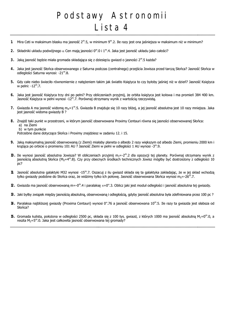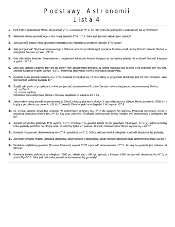 Podstawy Astronomii Lista 4 1. Mira Ceti w maksimum blasku ma jasność 2m.5, w minimum 9m.2. Ile razy jest ona jaśniejsza w maksimum niż w minimum? 2. Składniki układu podwójnego Cen mają jasności 0m.0 i 1m.4. Jaka jest jasność układu jako całości? 3. Jaką jasność będzie miała gromada składająca się z dziesięciu gwiazd o jasności 2m.5 każda? 4. Jaka jest jasność Słońca obserwowanego z Saturna podczas (centralnego) przejścia Jowisza przed tarczą Słońca? Jasność Słońca w odległości Saturna wynosi: -21m.8. 5. Gdy całe niebo świeciło równomiernie z natężeniem takim jak światło Księżyca to czy byłoby jaśniej niż w dzień? Jasność Księżyca w pełni: -12m.7. 6. Jaka jest jasność Księżyca trzy dni po pełni? Przy obliczeniach przyjmij, że orbita księżyca jest kołowa i ma promień 384 400 km. Jasność Księżyca w pełni wynosi -12m.7. Porównaj otrzymany wynik z wartością rzeczywistą. 7. Gwiazda A ma jasność widomą mA=1m.5. Gwiazda B znajduje się 10 razy bliżej, a jej jasność absolutna jest 10 razy mniejsza. Jaka jest jasność widoma gwiazdy B ? 8. Znajdź taki punkt w przestrzeni, w którym jasność obserwowana Proximy Centauri równa się jasności obserwowanej Słońca: a) na Ziemi b) w tym punkcie Potrzebne dane dotyczące Słońca i Proximy znajdziesz w zadaniu 12. i 15. 9. Jaką maksymalną jasność obserwowaną (z Ziemi) miałaby planeta o albedo 2 razy większym od albedo Ziemi, promieniu 2000 km i krążąca po orbicie o promieniu 101 AU ? Jasność Ziemi w pełni w odległości 1 AU wynosi -3m.9. 10. Ile wynosi jasność absolutna Jowisza? W obliczeniach przyjmij mJ=-2m.2 dla opozycji tej planety. Porównaj otrzymany wynik z jasnością absolutną Słońca (MS=4m.8). Czy przy obecnych środkach technicznych Jowisz mógłby być dostrzeżony z odległości 10 pc? 11. Jasność absolutna galaktyki M32 wynosi -15m.7. Oszacuj z ilu gwiazd składa się ta galaktyka zakładając, że w jej skład wchodzą tylko gwiazdy podobne do Słońca oraz, że widzimy tylko ich połowę. Jasność obserwowana Słońca wynosi mS=-26m.7. 12. Gwiazda ma jasność obserwowaną m=-0m.4 i paralaksę =0''.3. Oblicz jaki jest moduł odległości i jasność absolutna tej gwiazdy. 13. Jaki byłby związek między jasnością absolutną, obserwowaną i odległością, gdyby jasność absolutna była zdefiniowana przez 100 pc ? 14. Paralaksa najbliższej gwiazdy (Proxima Centauri) wynosi 0''.76 a jasność obserwowana 10m.5. Ile razy ta gwiazda jest słabsza od Słońca? 15. Gromada kulista, położona w odległości 2500 pc, składa się z 100 tys. gwiazd, z których 1000 ma jasność absolutną M1=0m.0, a reszta M2=5m.0. Jaka jest całkowita jasność obserwowana tej gromady?