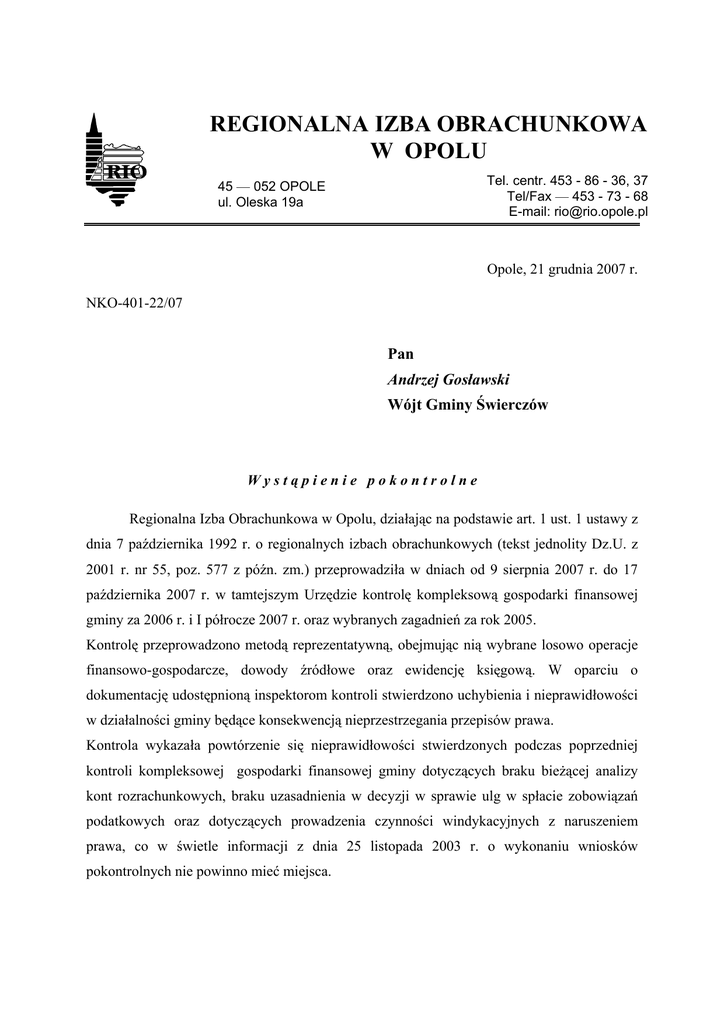 REGIONALNA IZBA OBRACHUNKOWA W OPOLU Tel. centr. 453 - 86 - 36, 37 Tel/Fax — 453 - 73 - 68 E-mail: [email protected] 45 — 052 OPOLE ul. Oleska 19a Opole, 21 grudnia 2007 r. NKO-401-22/07 Pan Andrzej Gosławski Wójt Gminy Świerczów Wystąpienie pokontrolne Regionalna Izba Obrachunkowa w Opolu, działając na podstawie art. 1 ust. 1 ustawy z dnia 7 października 1992 r. o regionalnych izbach obrachunkowych (tekst jednolity Dz.U. z 2001 r. nr 55, poz. 577 z późn. zm.) przeprowadziła w dniach od 9 sierpnia 2007 r. do 17 października 2007 r. w tamtejszym Urzędzie kontrolę kompleksową gospodarki finansowej gminy za 2006 r. i I półrocze 2007 r. oraz wybranych zagadnień za rok 2005. Kontrolę przeprowadzono metodą reprezentatywną, obejmując nią wybrane losowo operacje finansowo-gospodarcze, dowody źródłowe oraz ewidencję księgową. W oparciu o dokumentację udostępnioną inspektorom kontroli stwierdzono uchybienia i nieprawidłowości w działalności gminy będące konsekwencją nieprzestrzegania przepisów prawa. Kontrola wykazała powtórzenie się nieprawidłowości stwierdzonych podczas poprzedniej kontroli kompleksowej gospodarki finansowej gminy dotyczących braku bieżącej analizy kont rozrachunkowych, braku uzasadnienia w decyzji w sprawie ulg w spłacie zobowiązań podatkowych oraz dotyczących prowadzenia czynności windykacyjnych z naruszeniem prawa, co w świetle informacji z dnia 25 listopada 2003 r. o wykonaniu wniosków pokontrolnych nie powinno mieć miejsca. 2 Na uwagę zasługuje fakt, że niektóre nieprawidłowości stwierdzone przez kontrolujących zostały w trakcie kontroli usunięte, a dotyczyło to między innymi: − rozliczenia nieistniejącego zobowiązania wobec PKO BP O/Namysłów na kwotę 1.500 zł wykazanego na koncie pomimo jego spłaty oraz rozliczenia nadpłaty w podatku dochodowym od osób fizycznych, − sporządzenia kompletnego sprawozdania jednostkowego Rb-Z za okres od początku roku do dnia 30.06.2007r., − wyrównania pracownikom Urzędu Gminy zaniżonych nagród jubileuszowych, − skorygowania w sprawozdaniach Rb-27S i Rb-PDP za 2006 r. i I półrocze 2007 r., błędnie wykazanych skutków decyzji w sprawie odroczeń, umorzeń, − sporządzenia prawidłowego wykazu osób prawnych i fizycznych oraz jednostek organizacyjnych nieposiadających osobowości prawnej, którym w 2006 r. udzielono ulg, odroczeń i umorzeń w zakresie podatków lub rozłożono ich spłatę na raty, − wszczęcia z urzędu postępowania w sprawie określenia zobowiązania podatkowego podatnika podatku od środków transportowych należnego za 2007 r., − zawarcia umowy użyczenia lokalu dla Komendy Wojewódzkiej Policji, − zaprowadzenia rejestru spraw - aktów notarialnych przesyłanych do Urzędu przez notariuszy, − wezwania dłużnika do zapłaty należności z tytułu zaległych opłat rocznych za zajęcie pasa drogowego, − podjęcia w dniu 16.10.2007 r. przez Radę Gminy uchwał w sprawie: − zmiany uchwały nr IX/46/2007 z dnia 14.09.2007 r. w sprawie zmiany w Statucie Gminy Świerczów, − przyjęcia „Programu współpracy z organizacjami pozarządowymi oraz podmiotami prowadzącymi działalność pożytku publicznego na rok 2007, − trybu postępowania o udzielenie dotacji, sposobu jej rozliczania oraz sposobu kontroli wykonania zleconego zadania, − zmiany uchwały nr XVI/95/2004 z dnia 10.12.2004 r. w sprawie ustalenia wysokości stawek opłat za zajęcie pasa drogowego. Ustalenia kontroli opisano w protokole kontroli doręczonym Panu w dniu 30 października 2007 r. Do ustaleń zawartych w protokole kontroli zastrzeżeń nie wniesiono. 3 1.Ustalenia kontroli W trakcie kontroli stwierdzono m.in. następujące nieprawidłowości: Urząd Gminy 1. Nieprzestrzeganie przepisów z zakresu rachunkowości, polegające na: − oznaczeniu urządzeń księgowych Gminnego Ośrodka Kultury w Świerczowie w sposób nieprawidłowy, tj. nazwą Urzędu Gminy, który prowadzi obsługę księgową Ośrodka (protokół kontroli str. 13), − niewykazywaniu obrotów za poszczególne okresy sprawozdawcze (miesiące) w zestawieniu obrotów i sald sporządzanych dla organu (protokół kontroli str. 14), − nieanalizowaniu zapisów ewidencji księgowej konta 080 – Inwestycje, niewprowadzaniu w okresie sprawozdawczym do ksiąg rachunkowych zdarzeń, które nastąpiły w tym okresie (protokół kontroli str. 15-16, 141-143, 150-151, 153), − niedostosowaniu zapisów w zakładowym planie kont do obowiązujących przepisów prawa w zakresie prowadzenia ewidencji na kontach 224, 240, 980 bądź zamieszczenie w nim kont 134 i 225 służących do księgowania operacji gospodarczych niewystępujących w jednostce budżetowej oraz niedokonaniu aktualizacji zasad funkcjonowania kont: 222, 234 i 810 (protokół kontroli str. 21 – 22, 36, 117), − nieprowadzeniu ewidencji księgowej bądź nieprawidłowym jej prowadzeniu na kontach: 011, 222, 223, 290, 130, 134, 221, 750, 760 i 902 (protokół kontroli str. 22, 27, 41, 53-54, 109, 150, 153-154), − księgowaniu operacji gospodarczych niezgodnie z zasadami funkcjonowania kont (protokół kontroli str. 25, 111, 113, 125-126), − prowadzeniu ewidencji analitycznej wydatków w podziałkach klasyfikacji budżetowej nieprzewidzianych przepisami prawa (protokół kontroli str. 112-114), − prowadzeniu ewidencji księgowej Urzędu jako jednostki budżetowej oraz jednostek oświatowych – szkół podstawowych, gimnazjum i przedszkola we wspólnych urządzeniach księgowych (protokół kontroli str. 13, 22, 111), − przyjmowaniu na stan środków trwałych na podstawie dowodów księgowych niezawierających wymaganych informacji (protokół kontroli s. 150, 152-154), Odpowiedzialność ponosi Skarbnik oraz Wójt. 4 2. Niesporządzenie odrębnych bilansów jednostkowych dla poszczególnych jednostek budżetowych oraz wykazanie w bilansie jednostkowym Urzędu danych w zakresie należności i zobowiązań (konto