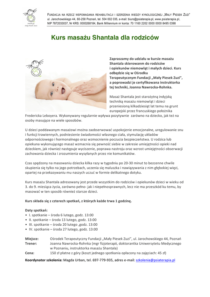 FUNDACJA NA RZECZ WSPOMAGANIA REHABILITACJI I SZERZENIA WIEDZY KYNOLOGICZNEJ „M AŁY PIESEK ZUZI” ul. Jarochowskiego 44, 60-258 Poznań, tel. 504 002 035, e-mail: [email protected], www.psiaterapia.pl, NIP 7872033037, Nr KRS: 0000268184, Bank Millennium nr konta: 70 1160 2202 0000 0000 8495 0398 Kurs masażu Shantala dla rodziców Zapraszamy do udziału w kursie masażu Shantala skierowanm do rodziców i opiekunów niemowląt i małych dzieci. Kurs odbędzie się w Ośrodku Terapeutycznym Fundacji „Mały Piesek Zuzi”, a poprowadzi je certyfikowana instruktorka tej techniki, Joanna Nawrocka-‐Rohnka. Masaż Shantala jest starożytną indyjską techniką masażu niemowląt i dzieci przeniesioną kilkadziesiąt lat temu na grunt europejski przez francuskiego położnika Fredericka Leboyera. Wykonywany regularnie wpływa pozytywnie zarówno na dziecko, jak też na osoby masujące na wiele sposobów. U dzieci poddawanym masażowi można zaobserwować uspokojenie emocjonalne, uregulowanie snu i funkcji trawiennych, podniesienie świadomości własnego ciała, stymulację układów odpornościowego i hormonalnego oraz wzmocnienie poczucia bezpieczeństwa. U rodzica lub opiekuna wykonującego masaż wzmacnia się pewność siebie w zakresie umiejętności opieki nad dzieckiem, jak również następuje wyciszenie, poprawa nastroju oraz wzrost umiejętności obserwacji zachowania dziecka i zrozumienia wysyłanych przez nie komunikatów. Czas spędzony na masowaniu dziecka kilka razy w tygodniu po 20-‐30 minut to bezcenne chwile skupienia się tylko na jego potrzebach, uczenia się maluszka i nawiązywania z nim głębokiej więzi, opartej na przekazywaniu mu naszych uczuć w formie delikatnego dotyku. Kurs masażu Shantala adresowany jest przede wszystkim do rodziców i opiekunów dzieci w wieku od 3. do 9. miesiąca życia, zarówno pełno-‐ jak i niepełnosprawnych, lecz nie ma przeszkód ku temu, by masować w ten sposób również starsze dzieci. Kurs składa się z czterech spotkań, z których każde trwa 1 godzinę. Daty spotkań: • I. spotkanie – środa 6 lutego, godz. 13:00 • II. spotkanie – środa 13 lutego, godz. 13:00 • III. spotkanie – środa 20 lutego ,godz. 13:00 • IV. spotkanie – środa 27 lutego, godz. 13:00 Miejsce: Ośrodek Terapeutyczny Fundacji „Mały Piesek Zuzi”, ul. Jarochowskiego 44, Poznań Trener: Joanna Nawrocka-‐Rohnka (mgr fizjoterapii, doktorantka Uniwersytetu Medycznego w Poznaniu, instruktorka masażu Shantala) Cena: 150 zł płatne z góry (koszt jednego spotkania opłacony na zajęciach: 45 zł) Koordynator szkolenia: Magda Urban, tel. 697-‐779-‐935, adres e-‐mail: [email protected]