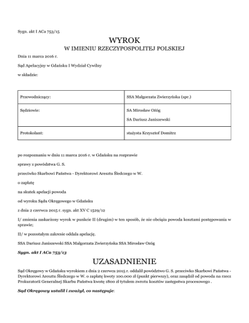 Sygn. akt I ACa 753/15 WYROK W IMIENIU RZECZYPOSPOLITEJ POLSKIEJ Dnia 11 marca 2016 r. Sąd Apelacyjny w Gdańsku I Wydział Cywilny w składzie: Przewodniczący: SSA Małgorzata Zwierzyńska (spr.) Sędziowie: SA Mirosław Ożóg SA Dariusz Janiszewski Protokolant: stażysta Krzysztof Domitrz po rozpoznaniu w dniu 11 marca 2016 r. w Gdańsku na rozprawie sprawy z powództwa G. S. przeciwko Skarbowi Państwa - Dyrektorowi Aresztu Śledczego w W. o zapłatę na skutek apelacji powoda od wyroku Sądu Okręgowego w Gdańsku z dnia 2 czerwca 2015 r. sygn. akt XV C 1529/12 I/ zmienia zaskarżony wyrok w punkcie II (drugim) w ten sposób, że nie obciąża powoda kosztami postępowania w sprawie; II/ w pozostałym zakresie oddala apelację. SSA Dariusz Janiszewski SSA Małgorzata Zwierzyńska SSA Mirosław Ozóg Sygn. akt I ACa 753/13 UZASADNIENIE Sąd Okręgowy w Gdańsku wyrokiem z dnia 2 czerwca 2015 r. oddalił powództwo G. S. przeciwko Skarbowi Państwa Dyrektorowi Aresztu Śledczego w W. o zapłatę kwoty 100.000 zł (punkt pierwszy), oraz zasądził od powoda na rzecz Prokuratorii Generalnej Skarbu Państwa kwotę 1800 zł tytułem zwrotu kosztów zastępstwa procesowego . Sąd Okręgowy ustalił i zważył, co następuje: Powód G. S. przebywał w Areszcie Śledczym w W. od dnia 4 września 2010 r. w związku z zastosowaniem wobec niego przez Sąd Rejonowy w Gdyni aresztu tymczasowego. Powód zajmował pryczę górną łóżka piętrowego znajdującego się w celi nr IV 10. Cele w Areszcie Śledczym w W. po generalnym remoncie zakończonym w 2006 r. wyposażone zostały w nowy sprzęt kwaterunkowy, w tym w nowe łóżka piętrowe. Łóżka zaopatrzone są w drabinkę służącą do wchodzenia na górną pryczę. Drabinki mocowane są do ramy łóżka za pomocą trzech śrub, spośród których pierwsza mocuje drabinkę do ramy łóżka na wysokości pryczy dolnej, druga na wysokości pryczy górnej, a trzecia natomiast do słupka ramy łóżka za pomocą łyżwy, stanowiącej równocześnie barierkę ochronną poryczy górnej. Drabinki łóżek piętrowych znajdujących się na wyposażeniu kwaterunkowym Aresztu Śledczego w W. nie stwarzały problemów polegających na ich odrywaniu się od ram łóżek podczas ich użytkowania przez osadzonych. Również administracji Aresztu Śledczego w W. nie zgłaszano tego rodzaju incydentów. W dniu 11 marca 2011 r. około godziny 20:00 powód zeskoczył z łóżka. Po zeskoczeniu z łóżka powód poczuł pieczenie i palenie w prawej pachwinie, uniemożliwiające poruszanie się. Wezwano pogotowie ratunkowe, które stwierdziło rosnący stopniowo guz okolicy pachwinowej. Powód został niezwłocznie skierowany i przewieziony w dniu 11 marca 2011 r. na Szpitalny Oddział Ratunkowy Szpitala (...) w W., gdzie został zaopatrzony medycznie o godzinie 1:00 w dniu 12 marca 2011 r. Stwierdzono, iż worek mosznowy powoda po prawej stronie wypełniony był niejednorodną tkanką będącą najprawdopodobniej krwiakiem. W dniach 12 do 15 marca 2011 r. powód skarżył się na silny ból i obrzęk w okolicach worka mosznowego. W dniu 15 marca 2011 r. stwierdzono w badaniu cechy przepukliny pachwinowej prawoskrętnej, bez cech uwięzienia. W związku z tym powód w dniu 18 marca 2011 r. zastał przewieziony na Szpitalny Oddział Ratunkowy Szpitala (...) w W., gdzie został ponownie zaopatrzony medycznie. Podczas badania zdiagnozowano u powoda przepuklinę mosznową prawostronną niewymagającą pilnej interwencji chirurgicznej. W dniach od 31 sierpnia do 9 września 2011 r. powód był hospitalizowany na Oddziale (...) Szpitala Aresztu Śledczego w B., gdzie był operowany z dobrym skutkiem. Sąd pierwszej instancji wskazał, że spór dotyczył przebiegu zdarzenia z dnia 11 marca 2011 r., związku przyczynowego pomiędzy tym zdarzeniem a aktualnym stanem zdrowia powoda i przebytym procesem leczenia powoda. spornym zakresie stanu faktycznego Sąd ustalił na podstawie dokumentów złożonych do akt, , jaki był stan zdrowia w chwili przyjęcia go do Aresztu Śledczego w W., przebieg i charakter zdarzenia z dnia 11 marca 2011 r. oraz zaistniały w jego wyniku przebieg procesu leczenia powoda. Treść zawarta w powyższych dokumentach była kwestionowania przez powoda, jednakże nie przedstawił on skutecznie dowodów celem wykazania faktów mających dla rozstrzygnięcia sprawy na swoją korzyść istotnego znaczenie. Sąd pierwszej instancji dał wiarę w całości zeznaniom świadków J. P., B. D. i A. K.. Zeznania te znalazły odzwierciedlenie w pozostałym zebranym materiale dowodowym, w tym w szczególności w dokumentacji prywatnej zaoferowanej do akt sprawy oraz w wyjaśnieniach pozwanego w osobie dyrektora Aresztu Śledczego w W. M. U. (k. 653). Świadkowie ci w istocie potwierdzili stanowisko pozwanego, gdyż żaden z nich nie pamiętał wypadku powoda z dnia 2011 r. Powyżej wymienieni świadkowie zeznali również, iż łóżka piętrowe oddane do dyspozycji osadzonych a znajdujące się na wyposażeniu Aresztu Śledczego w W. oraz zamocowane do nich drabinki były stabilne i nieruchome i wedle wiedzy i pamięci tych świadków nie było wypadków związanych z ich użytkowaniem. Sąd Okręgowy dał natomiast w ograniczonej mierze wiarę zeznaniom świadka P. H.. Świadek ten nie pamiętał ani osoby powoda ani wypadku z jego udziałem z dnia 11 marca 2011 r. Nie dał jednakże Sąd wiary zeznaniom świadka, w których twierdził on, iż znajdujące się na wyposażeniu Aresztu Śledczego w W. łóżka piętrowe były nieodpowiednio zamocowane i przechylały się, co powodowało wypadki polegające na tym, iż osadzeni z nich wypadali oraz że drabinki zamocowane do łóżek piętrowych ulegały podczas użytkowania odrywaniu. Świadek nie potrafił bowiem podać bliższych szczegółów dotyczących swoich twierdzeń jak i w sposób bardziej konkretny opisać okoliczności wypadków, Sąd Okręgowy dał w pełni wiarę zeznaniom pozwanego zło