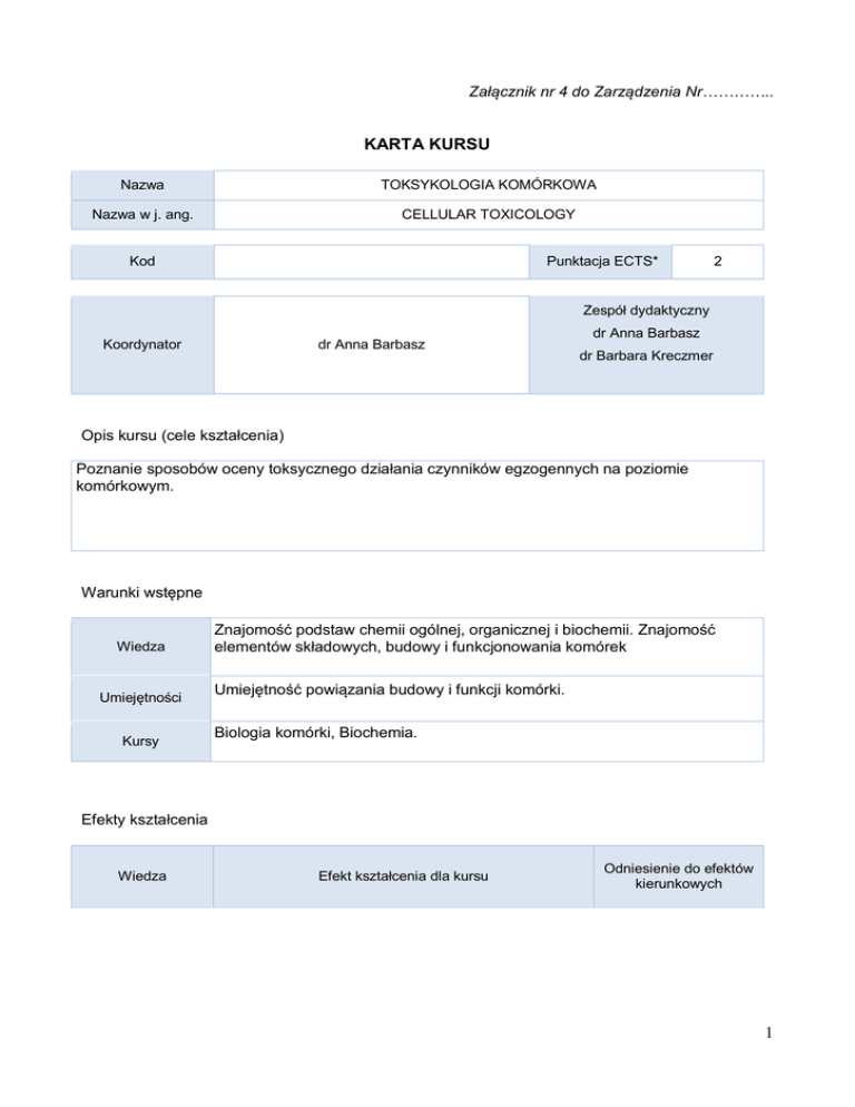 Załącznik nr 4 do Zarządzenia Nr………….. KARTA KURSU Nazwa TOKSYKOLOGIA KOMÓRKOWA Nazwa w j. ang. CELLULAR TOXICOLOGY Kod Punktacja ECTS* 2 Zespół dydaktyczny Koordynator dr Anna Barbasz dr Anna Barbasz dr Barbara Kreczmer Opis kursu (cele kształcenia) Poznanie sposobów oceny toksycznego działania czynników egzogennych na poziomie komórkowym. Warunki wstępne Wiedza Umiejętności Kursy Znajomość podstaw chemii ogólnej, organicznej i biochemii. Znajomość elementów składowych, budowy i funkcjonowania komórek Umiejętność powiązania budowy i funkcji komórki. Biologia komórki, Biochemia. Efekty kształcenia Wiedza Efekt kształcenia dla kursu Odniesienie do efektów kierunkowych 1 W01 Definiuje podstawowe pojęcia związane z hodowlą komórek. K_W04, K_W05 W02 Opisuje mechanizmy prowadzące do zaburzeń K_W09 prawidłowego funkcjonowania komórek w organizmie W03 Omawia typy hodowli komórkowych i tkankowych W04 Zna procedury doboru warunków hodowli, izolacji komórek i potrafi wskazać ich zastosowania K_W09 K_W26 W05 Zna metody obserwacji, liczenia i barwienia komórek K_W26 W06 Wykazuje podstawową wiedzę na temat zasad bezpieczeństwa i higieny pracy K_W31 Efekt kształcenia dla kursu Odniesienie do efektów kierunkowych U01 Projektuje układ doświadczalny mający na celu K_U01 zobrazowanie działania wybranego czynnika na komórki Umiejętności K_U01 U02 Dokonuje prawidłowego doboru metod analitycznych w zależności od profilu doświadczenia U03 Dokonuje interpretacji uzyskanych zmian K_U09 ilościowych analizowanych modelach komórkowych Kompetencje społeczne Efekt kształcenia dla kursu Odniesienie do efektów kierunkowych 2 K01 Planuje wspólne wykonywanie zadań i organizuje pracę w zespole K_K03 K02 Przestrzega zasad dyskusji, posługując się językiem typowym dla nauk biologicznych K_K05 Organizacja Forma zajęć Liczba godzin Ćwiczenia w grupach Wykład (W) A K L 10 S P E 10 Opis metod prowadzenia zajęć Wykłady obejmują podstawowe informacje o cytotoksykologii. Analizują drogę od podania trucizny do efektów jej działania na pojedynczą komórkę. W trakcie wykładów przedstawiane są nowoczesne metody analityczne oceny toksycznego działania ksenobiotyków na komórki. Omawiany jest także proces kancerogenezy chemicznej oraz toksycznego działania pestycydów oraz metali i związków metaloorganicznych. Ćwiczenia obejmują zapoznanie z pracą w warunkach sterylnych, hodowlą komórek ludzkich i zwierzęcych, zastosowanie hodowli komórek w toksykologii (testy żywotności komórek), ocena zmian biochemicznych w obrębie funkcjonowania komórek. W01 W02 W03 W04 W05 W06 U01 U02 x x x x x x x X X X X X X X X Inne Egzamin pisemny Egzamin ustny Praca pisemna (esej) Referat Udział w dyskusji Projekt grupowy Projekt indywidualny Praca laboratoryjna Zajęcia terenowe Ćwiczenia w szkole Gry dydaktyczne E – learning Formy sprawdzania efektów kształcenia X X X X X X x x 3 X X X U03 K01 K02 X Wykład: test - 60% poprawnych odpowiedzi- ocena pozytywna, ćwiczenia – obecność. Kryteria oceny Uwagi Treści merytoryczne (wykaz tematów) Wykłady: 1. Toksykologia – definicja i rys historyczny. Schemat działania trucizn. Czynniki wpływające na toksyczność ksenobiotyków. Zakres działania substancji toksycznych. Reakcje alergiczne i idisynkratyczne. Toksyczność natychmiastowa i opóźniona. Interakcje chemiczne trucizn. Drogi podania trucizn. Cytotoksyczność, dawka progowa, bezwzględna (LD100) i medialna dawka śmiertelna (LD50), stężenie śmiertelne (LC), stężenie śmiertelne medialne (LC50). Testy cytotoksyczności. Test MTT. 2. Drogi wchłaniania trucizn. Dystrybucja. Detoksykacja. Interakcje z cząsteczką docelową. Przenikanie substancji obcych przez błony. Prawo Ficka. Wchłanianie z przewodu pokarmowego, z układu oddechowego, przez skórę (transport transfolikularny, transepidermalny). Rozmieszczenie trucizn. Wiązanie trucizn. Wydalanie trucizn. Biotransformacja (faza I i faza II). Toksykoinfekcja i intoksykacja. 3. Kancerogeneza chemiczna (inicjacja, promocja, progresja). Kancerogeny. Chemoprewencja. Toksyczne działanie pestycydów. Metale i związki metaloorganiczne (Fe, Zn, Cu, Mn, Hg, Pb, Cr, Cd, Sn, As). Ćwiczenia: 1. Organizacja pracowni hodowli komórek. Praca w warunkach sterylnych, sterylizacja. Ocena żywotności komórek. 2. Analiza cytotoksyczności wybranego czynnika 3. Badanie peroksydacji lipidów błonowych pod wpływem działania toksycznych czynników. Wykaz literatury podstawowej C.D. Klaassen, J.B. Watkins III „Podstawy toksykologi” MedPfarm 2010 S. Stokłosowa „Hodowla komórek i tkanek” 2006. PWN Warszawa J. Hanke, J.K. Piotrowski „Biochemiczne podstawy toksykologii” PZWL 1984 Wykaz literatury uzupełniającej 4 Bilans godzinowy zgodny z CNPS (Całkowity Nakład Pracy Studenta) Ilość godzin w kontakcie z prowadzącymi Ilość godzin pracy studenta bez kontaktu z prowadzącymi Wykład 10 Konwersatorium (ćwiczenia, laboratorium itd.) 10 Pozostałe godziny kontaktu studenta z prowadzącym 10 Lektura w ramach przygotowania do zajęć 10 Przygotowanie krótkiej pracy pisemnej lub referatu po zapoznaniu się z niezbędną literaturą przedmiotu Przygotowanie do testu na zaliczenie 20 Przygotowanie projektu lub prezentacji na podany temat (praca w grupie) Przygotowanie do egzaminu Ogółem bilans czasu pracy 60 Ilość punktów ECTS w zależności od przyjętego przelicznika 2 5