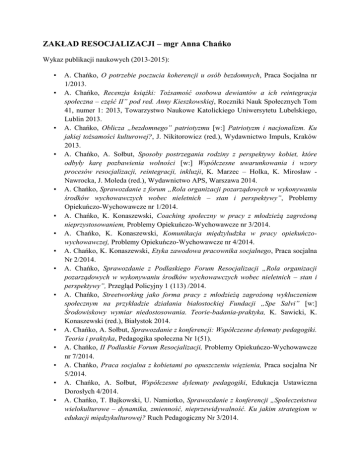 ZAKŁAD RESOCJALIZACJI – mgr Anna Chańko Wykaz publikacji naukowych (2013-2015): ▪ ▪ ▪ ▪ ▪ ▪ ▪ ▪ ▪ ▪ ▪ ▪ ▪ ▪ ▪ A. Chańko, O potrzebie poczucia koherencji u osób bezdomnych, Praca Socjalna nr 1/2013. A. Chańko, Recenzja książki: Tożsamość osobowa dewiantów a ich reintegracja społeczna – część II” pod red. Anny Kieszkowskiej, Roczniki Nauk Społecznych Tom 41, numer 1: 2013, Towarzystwo Naukowe Katolickiego Uniwersytetu Lubelskiego, Lublin 2013. A. Chańko, Oblicza „bezdomnego” patriotyzmu [w:] Patriotyzm i nacjonalizm. Ku jakiej tożsamości kulturowej?, J. Nikitorowicz (red.), Wydawnictwo Impuls, Kraków 2013. A. Chańko, A. Sołbut, Sposoby postrzegania rodziny z perspektywy kobiet, które odbyły karę pozbawienia wolności [w:] Współczesne uwarunkowania i wzory procesów resocjalizacji, reintegracji, inkluzji, K. Marzec – Holka, K. Mirosław Nawrocka, J. Moleda (red.), Wydawnictwo APS, Warszawa 2014. A. Chańko, Sprawozdanie z forum „Rola organizacji pozarządowych w wykonywaniu środków wychowawczych wobec nieletnich – stan i perspektywy”, Problemy Opiekuńczo-Wychowawcze nr 1/2014. A. Chańko, K. Konaszewski, Coaching społeczny w pracy z młodzieżą zagrożoną nieprzystosowaniem, Problemy Opiekuńczo-Wychowawcze nr 3/2014. A. Chańko, K. Konaszewski, Komunikacja międzyludzka w pracy opiekuńczowychowawczej, Problemy Opiekuńczo-Wychowawcze nr 4/2014. A. Chańko, K. Konaszewski, Etyka zawodowa pracownika socjalnego, Praca socjalna Nr 2/2014. A. Chańko, Sprawozdanie z Podlaskiego Forum Resocjalizacji „Rola organizacji pozarządowych w wykonywaniu środków wychowawczych wobec nieletnich – stan i perspektywy”, Przegląd Policyjny 1 (113) /2014. A. Chańko, Streetworking jako forma pracy z młodzieżą zagrożoną wykluczeniem społecznym na przykładzie działania białostockiej Fundacji „Spe Salvi” [w:] Środowiskowy wymiar niedostosowania. Teorie-badania-praktyka, K. Sawicki, K. Konaszewski (red.), Białystok 2014. A. Chańko, A. Sołbut, Sprawozdanie z konferencji: Współczesne dylematy pedagogiki. Teoria i praktyka, Pedagogika społeczna Nr 1(51). A. Chańko, II Podlaskie Forum Resocjalizacji, Problemy Opiekuńczo-Wychowawcze nr 7/2014. A. Chańko, Praca socjalna z kobietami po opuszczeniu więzienia, Praca socjalna Nr 5/2014. A. Chańko, A. Sołbut, Współczesne dylematy pedagogiki, Edukacja Ustawiczna Dorosłych 4/2014. A. Chańko, T. Bajkowski, U. Namiotko, Sprawozdanie z konferencji „Społeczeństwa wielokulturowe – dynamika, zmienność, nieprzewidywalność. Ku jakim strategiom w edukacji międzykulturowej? Ruch Pedagogiczny Nr 3/2014. ▪ ▪ ▪ ▪ ▪ ▪ ▪ ▪ ▪ ▪ ▪ A. Chańko, Kształcenie kompetencji międzykulturowych kadry instytucji penitencjarnych w Polsce – kontekst pracy z obcokrajowcami przebywającymi w izolacji więziennej [w:] Diagnostyka i metodyka psychopedagogiczna w warunkach wielokulturowości, T. Bajkowski, K. Sawicki, U. Namiotko (red.), Wyd. Żak, Białystok 2014. A. Chańko, A. Sołbut, Samokreacja poprzez sztukę. Autoresocjalizacja kobiet osadzonych w Areszcie Śledczym w Białymstoku [w:] Lubelski Rocznik Pedagogiczny t. XXXIII, Wydawnictwo UMCS, Lublin 2014. A. Chańko, K. Konaszewski, Percepcja własnej sytuacji życiowej przez osoby uzależnione od narkotyków, Problemy Opiekuńczo-Wychowawcze nr 1/2015. A. Chańko, M. Chmielewska, Zjawisko zaburzenia po stresie traumatycznym (PTSD) wśród klientów pomocy społecznej, Praca Socjalna nr 1/2015. A. Chańko, Sprawozdanie z II Podlaskiego Forum Resocjalizacji „Oddziaływania wychowawczo-lecznicze stosowane wobec nieletnich i dorosłych uzależnionych od alkoholu i substancji psychoaktywnych – stan i perspektywy”, Resocjalizacja Polska Nr 9/2015. A. Chańko, Spektakl profilaktyczny w gimnazjum, Problemy Opiekuńczo – Wychowawcze nr 8/2015. A. Chańko, E. Wołyniec, Sprawozdanie z III Forum Resocjalizacji „Meandry współczesnej resocjalizacji”, Problemy Opiekuńczo – Wychowawcze nr 10/2015. A. Chańko, E. Wołyniec, Matka nie zawsze doskonała - przykłady instytucjonalnych form reakcji na zaniedbanie funkcji rodzicielskiej [w:] Rodzina. Lokalne i globalne konteksty bezpieczeństwa, I. Ulrych, C. Smuniewski (red.), Wydawnictwo AON, Warszawa 2015. A. Chańko, Świat poza murami – funkcjonowanie kobiet w przestrzeni społecznej po opuszczeniu zakładu karnego [w:] Dylematy i wyzwania współczesnej resocjalizacji, K. Sawicki, A. Chańko, R. Ćwikowski (red), Wydawnictwo Alter Studio, Białystok 2015. K. Sawicki, R Ćwikowski, A. Chańko, (red.), Dylematy i wyzwania współczesnej resocjalizacji, Wydawnictwo Alter Studio, Białystok 2015. A. Chańko, Doświadczanie stygmatu społecznego przez kobiety, które odbyły karę pozbawienia wolności [w:] Resocjalizacja penitencjarna w kontekstach interdyscyplinarnych, D. Kowalczyk, A. Szecówka, S. Grzesiak (red.), Wyd. ATUT, Wrocław 2015.
