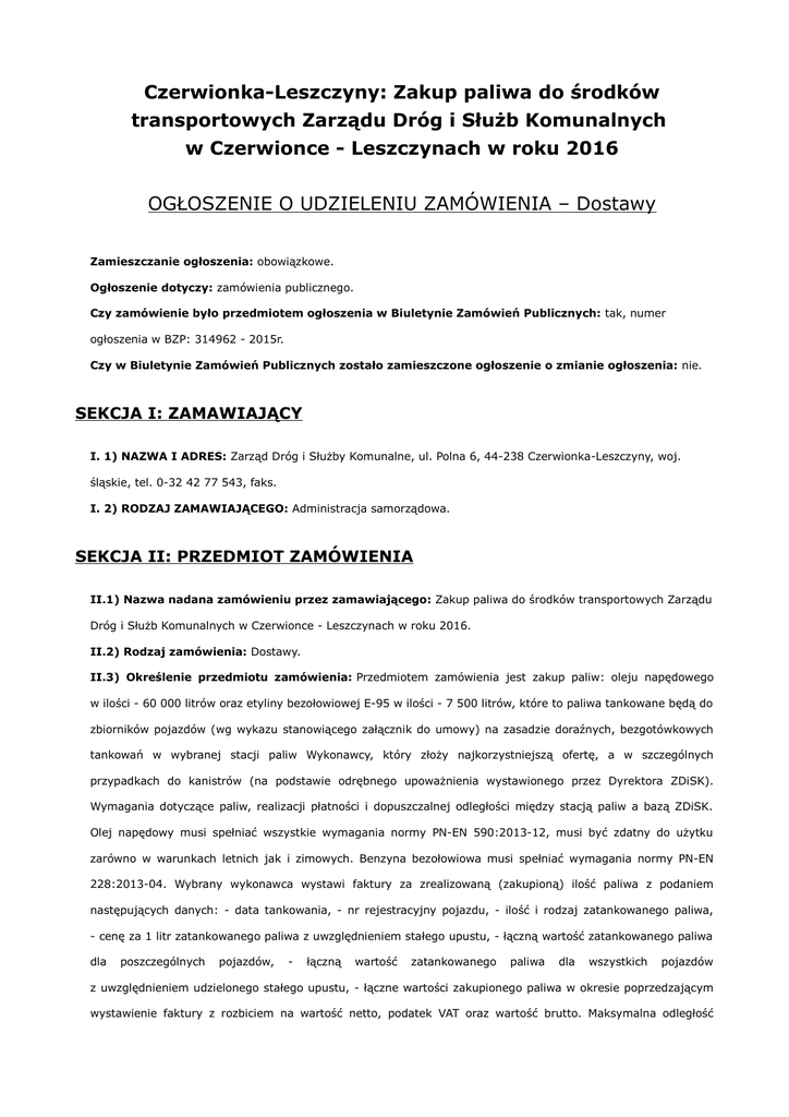 Czerwionka-Leszczyny: Zakup paliwa do środków transportowych Zarządu Dróg i Służb Komunalnych w Czerwionce - Leszczynach w roku 2016 OGŁOSZENIE O UDZIELENIU ZAMÓWIENIA – Dostawy Zamieszczanie ogłoszenia: obowiązkowe. Ogłoszenie dotyczy: zamówienia publicznego. Czy zamówienie było przedmiotem ogłoszenia w Biuletynie Zamówień Publicznych: tak, numer ogłoszenia w BZP: 314962 - 2015r. Czy w Biuletynie Zamówień Publicznych zostało zamieszczone ogłoszenie o zmianie ogłoszenia: nie. SEKCJA I: ZAMAWIAJĄCY I. 1) NAZWA I ADRES: Zarząd Dróg i Służby Komunalne, ul. Polna 6, 44-238 Czerwionka-Leszczyny, woj. śląskie, tel. 0-32 42 77 543, faks. I. 2) RODZAJ ZAMAWIAJĄCEGO: Administracja samorządowa. SEKCJA II: PRZEDMIOT ZAMÓWIENIA II.1) Nazwa nadana zamówieniu przez zamawiającego: Zakup paliwa do środków transportowych Zarządu Dróg i Służb Komunalnych w Czerwionce - Leszczynach w roku 2016. II.2) Rodzaj zamówienia: Dostawy. II.3) Określenie przedmiotu zamówienia: Przedmiotem zamówienia jest zakup paliw: oleju napędowego w ilości - 60 000 litrów oraz etyliny bezołowiowej E-95 w ilości - 7 500 litrów, które to paliwa tankowane będą do zbiorników pojazdów (wg wykazu stanowiącego załącznik do umowy) na zasadzie doraźnych, bezgotówkowych tankowań w wybranej stacji paliw Wykonawcy, który złoży najkorzystniejszą ofertę, a w szczególnych przypadkach do kanistrów (na podstawie odrębnego upoważnienia wystawionego przez Dyrektora ZDiSK). Wymagania dotyczące paliw, realizacji płatności i dopuszczalnej odległości między stacją paliw a bazą ZDiSK. Olej napędowy musi spełniać wszystkie wymagania normy PN-EN 590:2013-12, musi być zdatny do użytku zarówno w warunkach letnich jak i zimowych. Benzyna bezołowiowa musi spełniać wymagania normy PN-EN 228:2013-04. Wybrany wykonawca wystawi faktury za zrealizowaną (zakupioną) ilość paliwa z podaniem następujących danych: - data tankowania, - nr rejestracyjny pojazdu, - ilość i rodzaj zatankowanego paliwa, - cenę za 1 litr zatankowanego paliwa z uwzględnieniem stałego upustu, - łączną wartość zatankowanego paliwa dla poszczególnych pojazdów, - łączną wartość zatankowanego paliwa dla wszystkich pojazdów z uwzględnieniem udzielonego stałego upustu, - łączne wartości zakupionego paliwa w okresie poprzedzającym wystawienie faktury z rozbiciem na wartość netto, podatek VAT oraz wartość brutto. Maksymalna odległość między bazą ZDiSK a stacją paliw ze względów ekonomicznych nie może być większa niż 5 km uwzględniając istniejące oznakowanie pionowe ograniczające dopuszczalną rzeczywistą masę całkowitą pojazdów poruszających się po danej trasie dojazdu. Wykonawca winien zapewnić możliwość całodobowego tankowania pojazdów Zamawiającego. II.4) Wspólny Słownik Zamówień (CPV): 09.13.41.00-8, 09.13.21.00-4. SEKCJA III: PROCEDURA III.1) TRYB UDZIELENIA ZAMÓWIENIA: Przetarg nieograniczony III.2) INFORMACJE ADMINISTRACYJNE •Zamówienie dotyczy projektu/programu finansowanego ze środków Unii Europejskiej: nie SEKCJA IV: UDZIELENIE ZAMÓWIENIA IV.1) DATA UDZIELENIA ZAMÓWIENIA: 21.12.2015. IV.2) LICZBA OTRZYMANYCH OFERT: 1. IV.3) LICZBA ODRZUCONYCH OFERT: . IV.4) NAZWA I ADRES WYKONAWCY, KTÓREMU UDZIELONO ZAMÓWIENIA: •EKO - AGB P.H.U. Alicja Buchcik, ul. Szyb Zachodni 8, 44-230 Czerwionka-Leszczyny, kraj/woj. śląskie. IV.5) Szacunkowa wartość zamówienia (bez VAT): 238425,00 PLN. IV.6) INFORMACJA O CENIE WYBRANEJ OFERTY ORAZ O OFERTACH Z NAJNIŻSZĄ I NAJWYŻSZĄ CENĄ •Cena wybranej oferty: 274500,00 •Oferta z najniższą ceną: 274500,00 / Oferta z najwyższą ceną: 274500,00 •Waluta: PLN . Niniejsze ogłoszenie o udzieleniu zamówienia zostało zamieszczone w Biuletynie Zamówień Publicznych w dniu 21.12.2015 r.