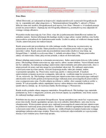,QVW\WXW ,QIRUPDW\NL 3ROLWHFKQLNL %LDáRVWRFNLHM IRWR ]áRWR G?LL SE?LR?SURMHNW?VFHQGRF $XWRU ZRMFLHFK FK\ERZVNL =PRG\ILNRZDQ\ SU]H] ZRMFLHFK FK\ERZVNL 'DWD XWZRU]HQLD PDUFD 'DWD RVWDWQLHM PRG\ILNDFML PDUFD 6WURQD )RWR =áRWR $OIUHG =áRWRZVNL SR VXNFHVDFK QD NUDMRZ\FK L PL G]\QDURGRZ\FK Z\VWDZDFK IRWRJUDILF]Q\FK P LQ ZVSDQLDáHM VHULL ]GM ü SLQJZLQyZ Z ,QWHUQDFMRQDOQ\P *HRJUDILNX ]DáR*\á Z 3ROVFH NLOND ODW WHPX VLHü VWXGLyZ IRWRJUDILF]Q\FK SRG QD]Z )RWR =áRWR 2EHFQLH Z VWXGLDFK SUDFXMH VL RQH IRWRJUDIL UHNODPRZ SU]HP\VáRZ RUD] ]GM FLDPL GR SRQDG VWX SUDFRZQLNyZ =DMPXM * Uy QHJR URG]DMX DOEXPyZ VL )RWR =áRWR ZL F DE\ MH MHGQR]QDF]QLH LGHQW\ILNRZDü QDGDQR LP XQLNDOQH QXPHU\ ,VWRWQH LQIRUPDFMH GOD ND*GHJR VWXGLD WR MHJR DGUHV L QXPHU WHOHIRQX RUD] OLF]ED SUDFRZQLNyZ SRWU]HEQ\FK GR IXQNFMRQRZDQLD VWXGLD /LF]ED WD ]DOH*\ RG ZLHONRFL GDQHJR VWXGLD L OLF]E\ ]DPyZLH SU]H] QLH UHDOL]RZDQ\FK :V]\VWNLH VWXGLD QD]\ZDM * *H SUDFRZQLF\ V SU]HQRV]HQL ]H VWXGLD GR VWXGLD 'DQH SU]HFKRZ\ZDQH R ND*G\P SUDFRZQLNX WR MHJR LPL QD]ZLVNR L DGUHV .D*G\ SUDFRZQLN PD SU]\G]LHORQH VWDQRZLVNR VáX*ERZH RUD] NODV QS .D G\ SUDFRZQLN MHVW SU]\G]LHORQ\ GR W\ONR MHGQHJR VWXGLD =GDU]D VL IRWRJUDI NODV\ WHFKQLNZ\ZRO\ZDF] NODV\ WHFKQLNXWUZDODF] NODV\ 3HQVMD SUDFRZQLND * RQRQD SRVLDGD D WDN*H RG GRZLDGF]HQLD ]DOH \ RG VWDQRZLVND L NODV\ MDN ]DPyZLHQLD QD Z\NRQDQLH SHZQHM SUDF\ -HGQR ]DPyZLHQLH GRW\F]\ W\ONR MHGQHM SUDF\ 'OD ND*GHJR NOLHQWD QRWRZDQH V MHJR QD]ZD DGUHV L QXPHU WHOHIRQX 1D]ZD NOLHQWD PR*H QLH E\ü XQLNDOQD =D UHDOL]DFM ND*GHJR ]DPyZLHQLD RGSRZLHG]LDOQ\ MHVW MHGHQ SUDFRZQLN FKRü Z PLDU SRWU]HE GR SUDF\ QDG QLP PRJ E\ü SU]\G]LHODQL WDN*H LQQL 'R UHDOL]DFML ]DPyZLHQLD Z\NRU]\VW\ZDQH V Uy*QH ]DVRE\ NWyU\PL G\VSRQXM VWXGLD WDNLH MDN FLHPQLH DWHOLHU Z\SRVD*HQLH VSHFMDOQH LWS 3UDFRZQLF\ UH]HUZXM ]DVRE\ Z PLDU SRWU]HE = ND*G\P ]DPyZLHQLHP ]ZL]DQH V SHZQH Z\PDJDQLD WDNLH MDN QS Z\QLNLHP PDM E\ü SU]H]URF]D [ FP VW\NyZNL LWS 'OD ND*GHJR ]DPyZLHQLD MHVW UHMHVWURZDQD GDWD UR]SRF] FLD MHJR UHDOL]DFML L ]DNRF]HQLD RUD] OLF]ED JRG]LQ SRZL FRQ\FK MHJR UHDOL]DFML SU]H] SRV]F]HJyOQ\FK SUDFRZQLNyZ RUD] Z\QHJRFMRZDQD FHQD =Z\NOH ]GM FLD V URELRQH Z DWHOLHU FKRü F]DVDPL WU]HED MH ]URELü Z WHUHQLH : W\P SU]\SDGNX QDOH*\ ]DSDPL WDü QD]Z L DGUHV PLHMVFD RUD] WHOHIRQ NRQWDNWRZ\ MH*HOL WDNRZ\ LVWQLHMH QS GR NXVWRV]D =DPNX .UyOHZVNLHJR Z :DUV]DZLH .OLHQFL VNáDGDM .D*GH VWXGLR SRVLDGD ZáDVQ\ PDJD]\Q PDWHULDáyZ IRWRJUDILF]Q\FK 'OD ND*GHJR W\SX PDWHULDáX SDPL WDQH V LORü Z PDJD]\QLH SR]LRP SU]\ NWyU\P ]DSDV\ V X]XSHáQLDQH RUD] LORFL ]X*\WH GR UHDOL]DFML ND*GHJR ]DPyZLHQLD 3RGREQLH PD VL U]HF] ]H VSU] WHP IRWRJUDILF]\P 6SU] W VSHFMDOLVW\F]Q\ PR*H E\ü Z\SR*\F]DQ\ SU]H] LQQH VWXGLD .D*G\ HJ]HPSODU] VSU] WX PD VZyM XQLNDOQ\ LGHQW\ILNDWRU RSLV RUD] NZRW XEH]SLHF]HQLD :\NRU]\VWDQLH VSU] WX SU]\ UHDOL]DFML SRV]F]HJyOQ\FK ]DPyZLH MHVW UHMHVWURZDQH QD SRGVWDZLH UH]HUZDFML SU]H] SUDFRZQLNyZ 'RGDWNRZR QLHNWyUH HJ]HPSODU]H VSU] WX PRJ E\ü Z\NRU]\VW\ZDQH W\ONR Z SRáF]HQLX ] LQQ\PL QS ZLHONRREUD]NRZD NDPHUD OXQDW\F]QD Z\PDJD VSHFMDOQHJR MHGQRVXZDNRZHJR VWRMDND 3UDFRZQLF\ WHFKQLF]QL RGSRZLHG]LDOQL ]D Z\SR*\F]HQLD PXV] R W\P ZLHG]LHü SU]\ UH]HUZDFML VSU] WX