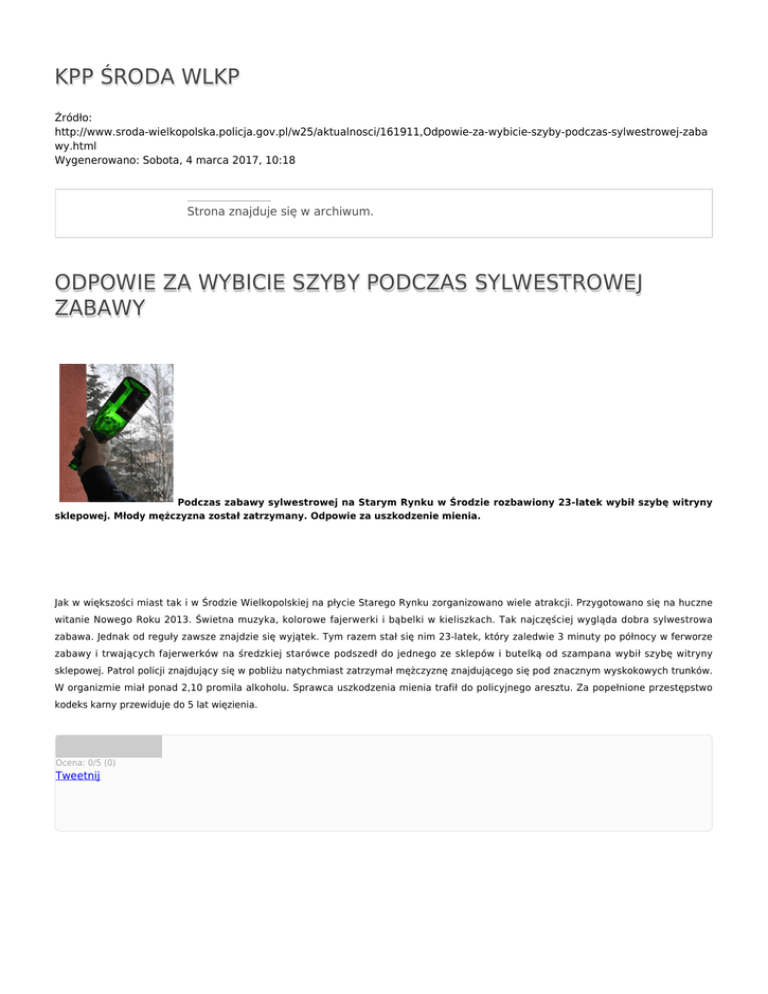 KPP ŚRODA WLKP Źródło: http://www.sroda-wielkopolska.policja.gov.pl/w25/aktualnosci/161911,Odpowie-za-wybicie-szyby-podczas-sylwestrowej-zaba wy.html Wygenerowano: Sobota, 4 marca 2017, 10:18 Strona znajduje się w archiwum. ODPOWIE ZA WYBICIE SZYBY PODCZAS SYLWESTROWEJ ZABAWY Podczas zabawy sylwestrowej na Starym Rynku w Środzie rozbawiony 23-latek wybił szybę witryny sklepowej. Młody mężczyzna został zatrzymany. Odpowie za uszkodzenie mienia. Jak w większości miast tak i w Środzie Wielkopolskiej na płycie Starego Rynku zorganizowano wiele atrakcji. Przygotowano się na huczne witanie Nowego Roku 2013. Świetna muzyka, kolorowe fajerwerki i bąbelki w kieliszkach. Tak najczęściej wygląda dobra sylwestrowa zabawa. Jednak od reguły zawsze znajdzie się wyjątek. Tym razem stał się nim 23-latek, który zaledwie 3 minuty po północy w ferworze zabawy i trwających fajerwerków na średzkiej starówce podszedł do jednego ze sklepów i butelką od szampana wybił szybę witryny sklepowej. Patrol policji znajdujący się w pobliżu natychmiast zatrzymał mężczyznę znajdującego się pod znacznym wyskokowych trunków. W organizmie miał ponad 2,10 promila alkoholu. Sprawca uszkodzenia mienia trafił do policyjnego aresztu. Za popełnione przestępstwo kodeks karny przewiduje do 5 lat więzienia. Ocena: 0/5 (0) Tweetnij