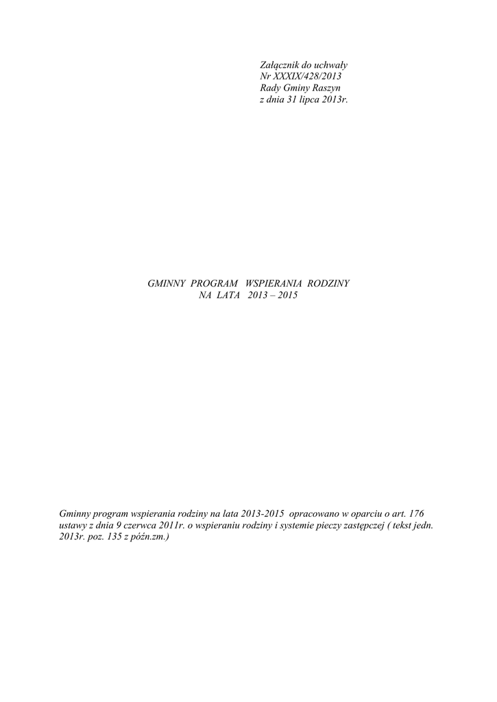Załącznik do uchwały Nr XXXIX/428/2013 Rady Gminy Raszyn z dnia 31 lipca 2013r. GMINNY PROGRAM WSPIERANIA RODZINY NA LATA 2013 – 2015 Gminny program wspierania rodziny na lata 2013-2015 opracowano w oparciu o art. 176 ustawy z dnia 9 czerwca 2011r. o wspieraniu rodziny i systemie pieczy zastępczej ( tekst jedn. 2013r. poz. 135 z późn.zm.) Wprowadzenie ogólny zarys We wszystkich kulturach świata rodzina stanowi podstawę społeczeństw. Rodzina jako podstawowa komórka społeczna w której jest wychowywane dziecko ma za zadanie przygotować je tak do życia, aby w przyszłości mogło być pełnowartościowym obywatelem, pracowało, płaciło podatki, miało swoją rodzinę oraz przekazało jej wartości i tradycje, które uzyskało od swoich rodziców. Kultura, wykształcenie, postawa jaką wynosi z domu dziecko, ma wpływ na życie już dorosłego obywatela, a każde zaniedbanie fizyczne i emocjonalne może znaleźć swoje odbicie w postępowaniu dorosłej już osoby. Rodzina to obecnie szerokie pojęcie, gdyż zgodnie z badaniem CBOS „ W dobie intensywnych przemian również podstawowa komórka społeczna jaką jest rodzina podlega różnorakim przeobrażeniom. Zmieniają się preferowane oraz realizowane modele życia rodzinnego, przekształceniom ulegają relacje wewnątrz-rodzinne, wreszcie samo rozumienie rodziny nie jest już tak jednoznaczne jak kiedyś. Wynika to m.in. ze wzrostu liczby rozwodów i separacji, a także liczby rodziców samotnie wychowujących dzieci, opóźniania decyzji matrymonialnych, wstrzymywania się od prokreacji lub całkowitej rezygnacji z posiadania dzieci, wzrostu liczby jednoosobowych gospodarstw domowych czy też coraz większej popularności związków nieformalnych, o których prawa zabiega część środowisk społecznych. Jedno się jednak nie zmienia: rodzina – jakkolwiek rozumiana – wciąż ma dla Polaków ogromne znaczenie i stanowi podstawową wartość ich codziennego życia. Jak wynika z deklaracji, wśród najważniejszych wartości, jakimi Polacy kierują się w swoim codziennym życiu, szczęście rodzinne zajmuje niezmiennie pierwsze miejsce. W lutowym badaniu wskazało na nie w tym kontekście ponad trzy czwarte ogółu ankietowanych (78%).”(Warszawa, marzec 2013, Rodzina - jej współczesne znaczenie i rozumienie, BS/33/2013). W rodzinie dorastają kolejne pokolenia to tam kształtuje się społeczeństwo – kapitał społeczny państwa, a jego jakość wpływa na prędkość rozwoju społeczno - gospodarczego. Rozwój gospodarczy i społeczny jest od siebie wzajemnie uzależniony. Nie ma silnie rozwijającej się gospodarki państwowej bez zdrowej, wykształconej i pracowitej rodziny. Polityka społeczna państwa powinna inwestować w rodziny, gdyż to one poprzez swoje funkcjonowanie wpływają na rozwój gospodarczy kraju. Dlatego szczególnym zadaniem państwa, a także gminy jest dbanie o prawidłowe funkcjonowanie rodzin. Każda rodzina zagrożona problemem jeżeli szuka pomocy nie powinna mieć trudności w otrzymaniu wsparcia. Mamy otwarty katalog problemów z którymi może spotkać się osoba/rodzina, a do najczęściej spotykanych zaliczamy: ubóstwo, bezdomność, bezrobocie, długotrwałą lub ciężką chorobę i niepełnosprawność, przemoc, uzależnienia, bezradność opiekuńczo –wychowawczą, klęski żywiołowe i ekologiczne. Państwo tworzy warunki funkcjonowania pomocy społecznej, która często jest realizowana przez instytucje publiczne samorządowe lub rządowe, a także poprzez sektor pozarządowy (organizacje pożytku publicznego, stowarzyszenia i fundacje). System pomocy i wsparcia w Polsce ma swoje silne prawne podstawy w przyjętej przez Polskę Konwencji Praw Dziecka, w Konstytucji RP, w Kodeksie Prawa Rodzinnego i w ustawach szczegółowych z których należy wymienić podstawowe: Ustawę z dnia 26 października 1982r o wychowywaniu w trzeźwości i przeciwdziałaniu alkoholizmowi (tekst jedn.Dz.U.2012.1356 z późn.zm.) Ustawę z dnia 29 lipca 2005r. o przeciwdziałaniu przemocy w rodzinie (Dz.U.2005.180.1493 z późn.zm.) 2 Ustawę z dnia 12 marca 2004r. o pomocy społecznej (tekst.jedn.Dz.U.2013.182 z późn.zm.) Ustawę z dnia 9 czerwca 2011r. o wspieraniu rodziny i systemie pieczy zastępczej (tekst jedn.Dz.U.2013.135.z późn.zm.) W sprawie dokładnych badań dotyczących sytuacji osób/rodzin w Polsce odsyłamy do zapoznania się z opracowaniem” Warunki i jakość życia Polaków” „Diagnoza społeczna 2011” Projekt badawczy o charakterze ogólnopolskim, który poza opisem polskiego społeczeństwa, umożliwia weryfikację podstawowych hipotez naukowych strona internetowa www.diagnoza.com Odbiorcy programu : Rodziny przeżywające trudności, zamieszkałe na terenie gminy Raszyn, zwłaszcza doświadczające problemów opiekuńczo –wychowawczych, zagrożone umieszczeniem dzieci w rodzinie zastępczej, bądź takie którym została odebrana lub ograniczona władza rodzicielska. Cel programu: Wzmocnienie roli i funkcji rodziny jako naturalnego środowiska rozwoju dzieci zwłaszcza u rodzin przeżywających trudności w wypełnianiu funkcji opiekuńczo - wychowawczych poprzez: - analizę sytuacji rodziny i środowiska rodzinnego oraz przyczyn kryzysu w rodzinie; - wzmocnienie roli i funkcji rodziny; rozwijanie umiejętności opiekuńczo –wychowawczych rodziny; - podniesienie świadomości w zakresie planowania oraz funkcjonowania rodziny; - pomocy w integracji rodziny; - przeciwdziałanie marginalizacji i degradacji społecznej rodziny; - dążenie do reintegracji rodziny, - stworzenie możliwości powrotu dziecku umieszczonemu w pieczy zastępczej do rodziny biologicznej; - profilaktykę na rzecz dobra dziecka i rodziny (zwłaszcza dla młodych rodzin); Diagnoza gminy : Gmina Raszyn jest gminą wiejską. Położona administracyjnie w powiecie pruszkowskim województwa mazowieckiego w bezpośrednim sąsiedztwie stolicy. W gminie jest niski wskaźnik bezrobocia 3,98%. 