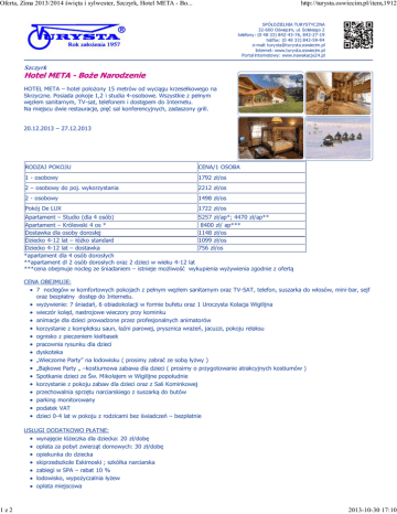 Oferta, Zima 2013/2014 święta i sylwester, Szczyrk, Hotel META - Bo... 1z2 http://turysta.oswiecim.pl/item,1912 SPÓŁDZIELNIA TURYSTYCZNA 32-600 Oświęcim, ul. Solskiego 2 telefony: (0 48 33) 842-43-76, 842-27-19 tel/fax: (0 48 33) 842-59-94 e-mail: [email protected] Internet: www.turysta.oswiecim.pl Portal internetowy: www.nawakacje24.pl Szczyrk Hotel META - Boże Narodzenie HOTEL META – hotel położony 15 metrów od wyciągu krzesełkowego na Skrzyczne. Posiada pokoje 1,2 i studia 4-osobowe. Wszystkie z pełnym węzłem sanitarnym, TV-sat, telefonem i dostępem do Internetu. Na miejscu dwie restauracje, pięć sal konferencyjnych, zadaszony grill. 20.12.2013 – 27.12.2013 RODZAJ POKOJU CENA/1 OSOBA 1 - osobowy 1792 zł/os 2 – osobowy do poj. wykorzystania 2212 zł/os 2 - osobowy 1498 zł/os Pokój De LUX 1722 zł/os Apartament – Studio (dla 4 osób) 5257 zł/ap*; 4470 zł/ap** Apartament – Królewski 4 os * 8400 zł/ ap*** Dostawka dla osoby dorosłej 1148 zł/os Dziecko 4-12 lat – łóżko standard 1099 zł/os Dziecko 4-12 lat – dostawka 756 zł/os *apartament dla 4 osób dorosłych **apartament dl 2 osób dorosłych oraz 2 dzieci w wieku 4-12 lat ***cena obejmuje nocleg ze śniadaniem – istnieje możliwość wykupienia wyżywienia zgodnie z ofertą CENA OBEJMUJE: 7 noclegów w komfortowych pokojach z pełnym węzłem sanitarnym oraz TV-SAT, telefon, suszarka do włosów, mini-bar, sejf oraz bezpłatny dostęp do Internetu. wyżywienie: 7 śniadań, 6 obiadokolacji w formie bufetu oraz 1 Uroczysta Kolacja Wigilijna wieczór kolęd, nastrojowe wieczory przy kominku animacje dla dzieci prowadzone przez profesjonalnych animatorów korzystanie z kompleksu saun, łaźni parowej, prysznica wrażeń, jacuzzi, pokoju relaksu ognisko z pieczeniem kiełbasek pracownia rysunku dla dzieci dyskoteka „Wieczorne Party” na lodowisku ( prosimy zabrać ze sobą łyżwy ) „Bajkowe Party „ –kostiumowa zabawa dla dzieci ( prosimy o przygotowanie atrakcyjnych kostiumów ) Spotkanie dzieci ze Św. Mikołajem w Wigilijne popołudnie korzystanie z pokoju zabaw dla dzieci oraz z Sali Kominkowej przechowalnia sprzętu narciarskiego z suszarką do butów parking monitorowany podatek VAT dzieci 0-4 lat w pokoju z rodzicami bez świadczeń – bezpłatnie USŁUGI DODATKOWO PŁATNE: wynajęcie łóżeczka dla dziecka: 20 zł/dobę opłata za pobyt zwierząt domowych: 30 zł/dobę opiekunka do dziecka skiprzedszkole Eskimoski ; szkółka narciarska zabiegi w SPA – rabat 10 % lodowisko, wypożyczalnia łyżew opłata miejscowa 2013-10-30 17:10 Oferta, Zima 2013/2014 święta i sylwester, Szczyrk, Hotel META - Bo... 2z2 http://turysta.oswiecim.pl/item,1912 2013-10-30 17:10