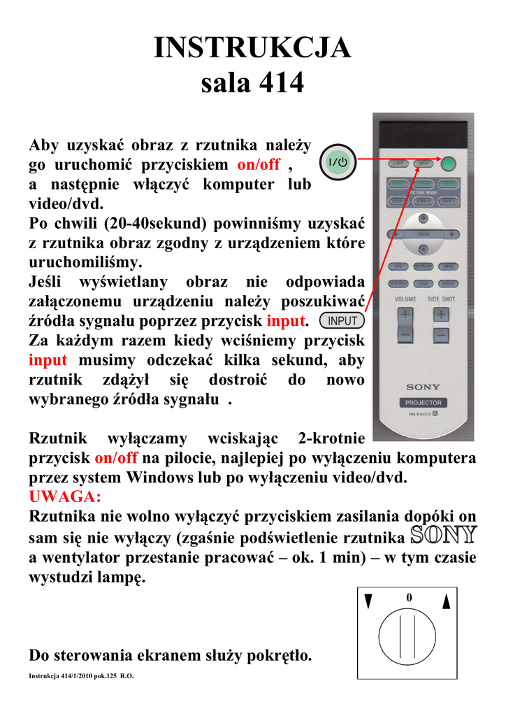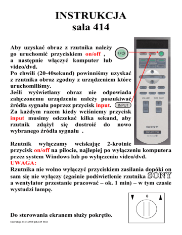 INSTRUKCJA sala 414 Aby uzyskać obraz z rzutnika należy go uruchomić przyciskiem on/off , a następnie włączyć komputer lub video/dvd. Po chwili (20-40sekund) powinniśmy uzyskać z rzutnika obraz zgodny z urządzeniem które uruchomiliśmy. Jeśli wyświetlany obraz nie odpowiada załączonemu urządzeniu należy poszukiwać źródła sygnału poprzez przycisk input. Za każdym razem kiedy wciśniemy przycisk input musimy odczekać kilka sekund, aby rzutnik zdążył się dostroić do nowo wybranego źródła sygnału . Rzutnik wyłączamy wciskając 2-krotnie przycisk on/off na pilocie, najlepiej po wyłączeniu komputera przez system Windows lub po wyłączeniu video/dvd. UWAGA: Rzutnika nie wolno wyłączyć przyciskiem zasilania dopóki on sam się nie wyłączy (zgaśnie podświetlenie rzutnika a wentylator przestanie pracować – ok. 1 min) – w tym czasie wystudzi lampę. 0 Do sterowania ekranem służy pokrętło. Instrukcja 414/1/2010 pok.125 R.O. AUDIO: Dźwięk z komputera lub urządzenia video/dvd jest dostępny tylko dla monitora Samsung !!!. Film DVD lub inny z komputera: Po uruchomieniu systemu Windows można uruchomić płytę w napędzie optycznym komputera. Windows Media Player powinien odtworzyć film automatycznie o ile jest on zapisany w jednym z typowych formatów. Jeżeli potrzebujemy zmienić wersję językową na Polski (lub inną) wybieramy kolejno: Odtwórz>Ścieżki audio …>Polski Pamięci USB: Proszę nie wkładać pamięci USB w złącza komputera dopóki nie uruchomi się system Windows.