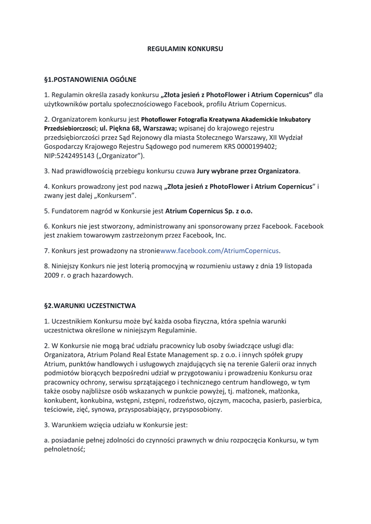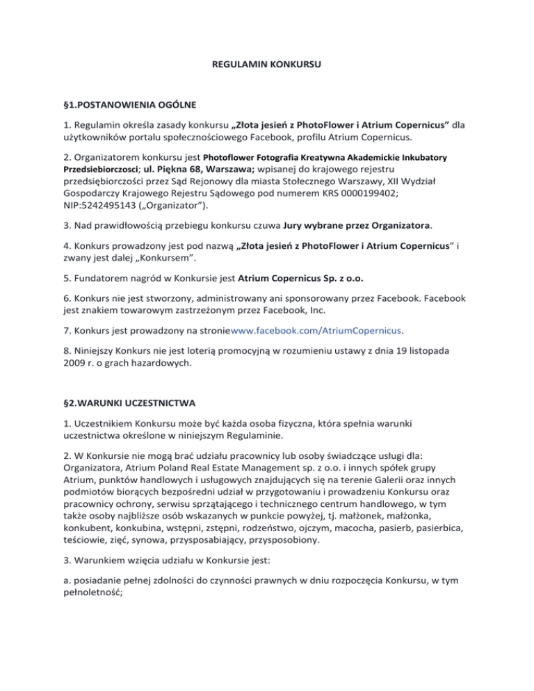 REGULAMIN KONKURSU §1.POSTANOWIENIA OGÓLNE 1. Regulamin określa zasady konkursu „Złota jesień z PhotoFlower i Atrium Copernicus” dla użytkowników portalu społecznościowego Facebook, profilu Atrium Copernicus. 2. Organizatorem konkursu jest Photoflower Fotografia Kreatywna Akademickie Inkubatory Przedsiebiorczosci; ul. Piękna 68, Warszawa; wpisanej do krajowego rejestru przedsiębiorczości przez Sąd Rejonowy dla miasta Stołecznego Warszawy, XII Wydział Gospodarczy Krajowego Rejestru Sądowego pod numerem KRS 0000199402; NIP:5242495143 („Organizator”). 3. Nad prawidłowością przebiegu konkursu czuwa Jury wybrane przez Organizatora. 4. Konkurs prowadzony jest pod nazwą „Złota jesień z PhotoFlower i Atrium Copernicus” i zwany jest dalej „Konkursem”. 5. Fundatorem nagród w Konkursie jest Atrium Copernicus Sp. z o.o. 6. Konkurs nie jest stworzony, administrowany ani sponsorowany przez Facebook. Facebook jest znakiem towarowym zastrzeżonym przez Facebook, Inc. 7. Konkurs jest prowadzony na stroniewww.facebook.com/AtriumCopernicus. 8. Niniejszy Konkurs nie jest loterią promocyjną w rozumieniu ustawy z dnia 19 listopada 2009 r. o grach hazardowych. §2.WARUNKI UCZESTNICTWA 1. Uczestnikiem Konkursu może być każda osoba fizyczna, która spełnia warunki uczestnictwa określone w niniejszym Regulaminie. 2. W Konkursie nie mogą brać udziału pracownicy lub osoby świadczące usługi dla: Organizatora, Atrium Poland Real Estate Management sp. z o.o. i innych spółek grupy Atrium, punktów handlowych i usługowych znajdujących się na terenie Galerii oraz innych podmiotów biorących bezpośredni udział w przygotowaniu i prowadzeniu Konkursu oraz pracownicy ochrony, serwisu sprzątającego i technicznego centrum handlowego, w tym także osoby najbliższe osób wskazanych w punkcie powyżej, tj. małżonek, małżonka, konkubent, konkubina, wstępni, zstępni, rodzeństwo, ojczym, macocha, pasierb, pasierbica, teściowie, zięć, synowa, przysposabiający, przysposobiony. 3. Warunkiem wzięcia udziału w Konkursie jest: a. posiadanie pełnej zdolności do czynności prawnych w dniu rozpoczęcia Konkursu, w tym pełnoletność; b. posiadanie konta w serwisie Facebook, na którym użytkownik występuje pod własnym imieniem i nazwiskiem; konto musi przynależeć do jednej osoby (nie może być to konto np. małżeńskie) c. wykonanie zadania konkursowego polegającego na wysłaniu jesiennego zdjęcia rodzinnego na podany w poście konkursowym adres e-mail: [email protected] wraz ze swoim imieniem i nazwiskiem, adresem e-mail i nr telefonu oraz linkiem do osobistego profilu Facebook, w temacie podając: KONKURS – Złota Jesień z PhotoFlower i Atrium Copernicus d. wyrażenie przez uczestnika zgody na warunki Konkursu określone niniejszym Regulaminem. Przystąpienie do konkursu (tj. wysłanie zgłoszenia konkursowego) przez Uczestnika jest równoznaczne z oświadczeniem, iż zapoznał się on z niniejszym regulaminem i wyraża zgodę na wszystkie jego postanowienia. 4. Konkurs trwa od dnia 2 listopada 2016 od godz. 13:00 do 10 listopada 2016 godz. 23:59. 5. Organizator nie ponosi odpowiedzialności za czasowe lub stałe zablokowanie Fanpage Atrium Copernicus, z przyczyn za które nie ponosi odpowiedzialności. §3.NAGRODY 1. Nagrodami w Konkursie są nagrody rzeczowe – 1 sesja zdjęciowa o wartości 400 zł, w skład której wchodzą: · sesja zdjęciowa w nowym, profesjonalnym studiu fotograficznym w Trouniu · 20 wyselekcjonowanych zdjęć poddanych precyzyjnej autorskiej obróbce na płycie CD · 20 wydrukowanych zdjęć w formacie 15x24 cm . Nagrody rzeczowe zostaną wskazane na stronie http://www.facebook.com/AtriumCopernicus w dniu ogłoszenia Konkursu. 2. Wszystkie nagrody zostaną przekazane zwycięzcy w miejscu ustalonym przez Organizatora, przy czym miejsce to i czas przekazania nagród zostaną przekazane zwycięzcy w formie mailowej. 3. Warunkiem odbioru nagrody jest odbiór osobisty nagrody przez uczestnika po wcześniejszym przedstawieniu dokumentu tożsamości. 4. Miejsce i termin odbioru nagrody: zostaną przekazane zwycięzcy w formie mailowej. 5. Uczestnikowi nie przysługuje prawo żądania wymiany nagrody rzeczowej na jakikolwiek ekwiwalent, w tym pieniężny, jak również nie przysługuje prawo przeniesienia na osobę trzecią roszczenia o wydanie nagrody. §4.ZASADY PRZYZNAWANIA NAGRÓD 1. Zadanie konkursowe wymaga od uczestnika poprawnego wykonania zadania opisanego w §2 pkt. 3c. O zwycięstwie decyduje Jury wybrane przez Organizatora. 2. Zgłoszenie konkursowe powinno spełniać następujące warunki: a. nie może być antyreklamą ani naruszać wizerunku lub dobrego imienia Organizatora; b. nie może zawierać treści reklamowych dotyczących jakichkolwiek podmiotów innych niż Organizator; c. nie może zawierać wulgaryzmów, treści obraźliwych, sprzecznych z obowiązującymi przepisami prawa, dobrymi obyczajami, szczególnie poprzez treści naruszające wolność wyznania czy pochodzenie etniczne; d. nie może naruszać jakichkolwiek praw osób trzecich, w szczególności praw autorskich i dóbr osobistych. 3. W przypadku stwierdzenia, że zgłoszenie konkursowe spełnia którykolwiek z warunków wymienionych powyżej, nie będzie ono podlegać ocenie, a uczestnik zostanie wykluczony z Konkursu i utraci prawo do nagrody w Konkursie. 4. Nagrodzona zostanie 1 osoba, której zgłoszenie konkursowe najbardziej spodoba się Jury oraz która spełni formalne warunki uczestnictwa w konkursie opisane w niniejszym regulaminie. 5. Nazwisko i imię Zwycięzcy zostanie opublikowane na profilu Facebook Atrium Copernicus. 6. Informacja o wygranej nagrodzie w konkursie zostanie przesłana zwycięzcy drogą mailową oraz ogłoszona publicznie na profilu Facebook Atrium Copernicus do dnia 18 listopada 2016 na stronie www.facebook.com/AtriumCopernicus. §5.PRAWA AUTORSKIE I OCHRONA WIZERUNKU 1. Zgłaszając zdjęcie do Konkursu, Uczestnik wyr