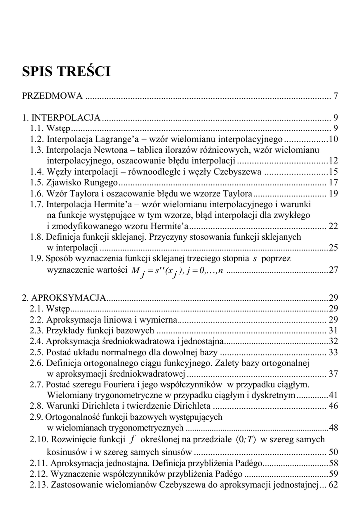 SPIS TREŚCI PRZEDMOWA ........................................................................................................ 7 1. INTERPOLACJA ................................................................................................. 9 1.1. Wstęp .............................................................................................................. 9 1.2. Interpolacja Lagrange’a – wzór wielomianu interpolacyjnego ..................10 1.3. Interpolacja Newtona – tablica ilorazów różnicowych, wzór wielomianu interpolacyjnego, oszacowanie błędu interpolacji .....................................12 1.4. Węzły interpolacji – równoodległe i węzły Czebyszewa ..........................15 1.5. Zjawisko Rungego ........................................................................................ 17 1.6. Wzór Taylora i oszacowanie błędu we wzorze Taylora ............................... 19 1.7. Interpolacja Hermite’a – wzór wielomianu interpolacyjnego i warunki na funkcje występujące w tym wzorze, błąd interpolacji dla zwykłego i zmodyfikowanego wzoru Hermite’a .......................................................... 22 1.8. Definicja funkcji sklejanej. Przyczyny stosowania funkcji sklejanych w interpolacji ..................................................................................................... 25 1.9. Sposób wyznaczenia funkcji sklejanej trzeciego stopnia s poprzez wyznaczenie wartości M j s' ' (x j ), j 0,,n ............................................. 27 2. APROKSYMACJA.................................................................................................. 29 2.1. Wstęp.................................................................................................................. 29 2.2. Aproksymacja liniowa i wymierna ............................................................... 29 2.3. Przykłady funkcji bazowych ........................................................................ 31 2.4. Aproksymacja średniokwadratowa i jednostajna .............................................. 32 2.5. Postać układu normalnego dla dowolnej bazy ............................................. 33 2.6. Definicja ortogonalnego ciągu funkcyjnego. Zalety bazy ortogonalnej w aproksymacji średniokwadratowej ........................................................... 37 2.7. Postać szeregu Fouriera i jego współczynników w przypadku ciągłym. Wielomiany trygonometryczne w przypadku ciągłym i dyskretnym .............. 41 2.8. Warunki Dirichleta i twierdzenie Dirichleta ................................................ 46 2.9. Ortogonalność funkcji bazowych występujących w wielomianach trygonometrycznych .................................................................. 48 2.10. Rozwinięcie funkcji f określonej na przedziale 0;T w szereg samych kosinusów i w szereg samych sinusów ........................................................ 50 2.11. Aproksymacja jednostajna. Definicja przybliżenia Padégo............................. 58 2.12. Wyznaczenie współczynników przybliżenia Padégo ..................................... 59 2.13. Zastosowanie wielomianów Czebyszewa do aproksymacji jednostajnej ... 62 3. UKŁADY RÓWNAŃ LINIOWYCH ..................................................................... 64 3.1. Metoda Cramera. Dlaczego nie stosuje się tej metody do numerycznego rozwiązywania układów równań liniowych? ...................... 64 3.2. Metoda eliminacji Gaussa. Częściowy i pełny wybór elementu głównego ..... 66 3.3. Metoda Cholesky’ego (Banachiewicza). Macierze symetryczne, dodatnio określone .................................................. 72 3.4. Numeryczne metody wyznaczania macierzy odwrotnej .................................. 74 3.5. Metoda Jacobiego .............................................................................................. 75 3.6. Metoda Gaussa-Seidla ........................................................................................ 79 3.7. Testy stopu dla metod iteracyjnych .............................................................. 83 4. WARTOŚCI I WEKTORY WŁASNE MACIERZY ......................................... 86 4.1. Definicja wartości własnej i wektora własnego. Podstawowe twierdzenia i pojęcia .................................................................... 86 4.2. Lokalizacja wartości własnych. Tw. Gerszgorina ........................................ 88 4.3. Metoda Kryłowa – opis i przeznaczenie ........................................................... 94 4.4. Wyznaczanie wartości własnych i wektorów własnych macierzy symetrycznych .............................................................................. 96 5. RÓWNANIA NIELINIOWE ............................................................................. 98 5.1. Lokalizacja rozwiązań ....................................................................................... 98 5.2. Metoda połowienia (bisekcji) ............................................................................. 99 5.3. Metoda siecznych............................................................................................. 102 5.4. Metoda Newtona (stycznych) ..................................................................... 107 5.5. Metody iteracyjne jednopunktowe .................................................................. 109 6. UKŁADY RÓWNAŃ NIELINIOWYCH ........................................................ 111 6.1. Lokalizacja rozwiązań układów nieliniowych ............................................ 111 6.2. Metoda Newtona dla układów nieliniowych................................................... 113 6.3. Dyskretna metoda Newtona dla układów nieliniowych ............................. 115 7. CAŁKOWANIE NUMERYCZNE ....................................................................... 119 7.1. Metoda prostokątów środkowych, lewych i prawych. Oszacowani